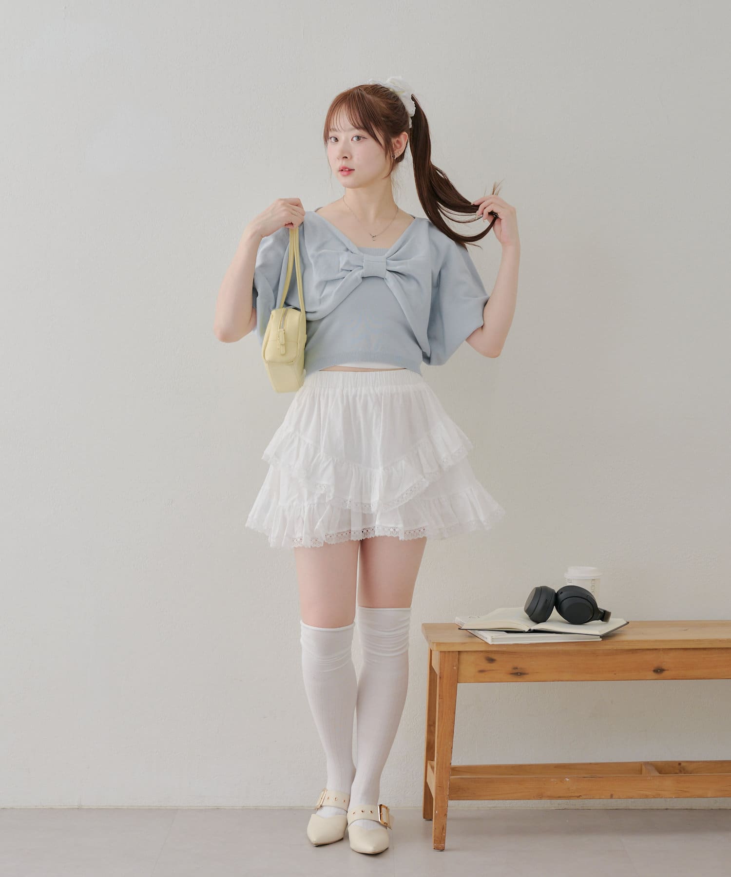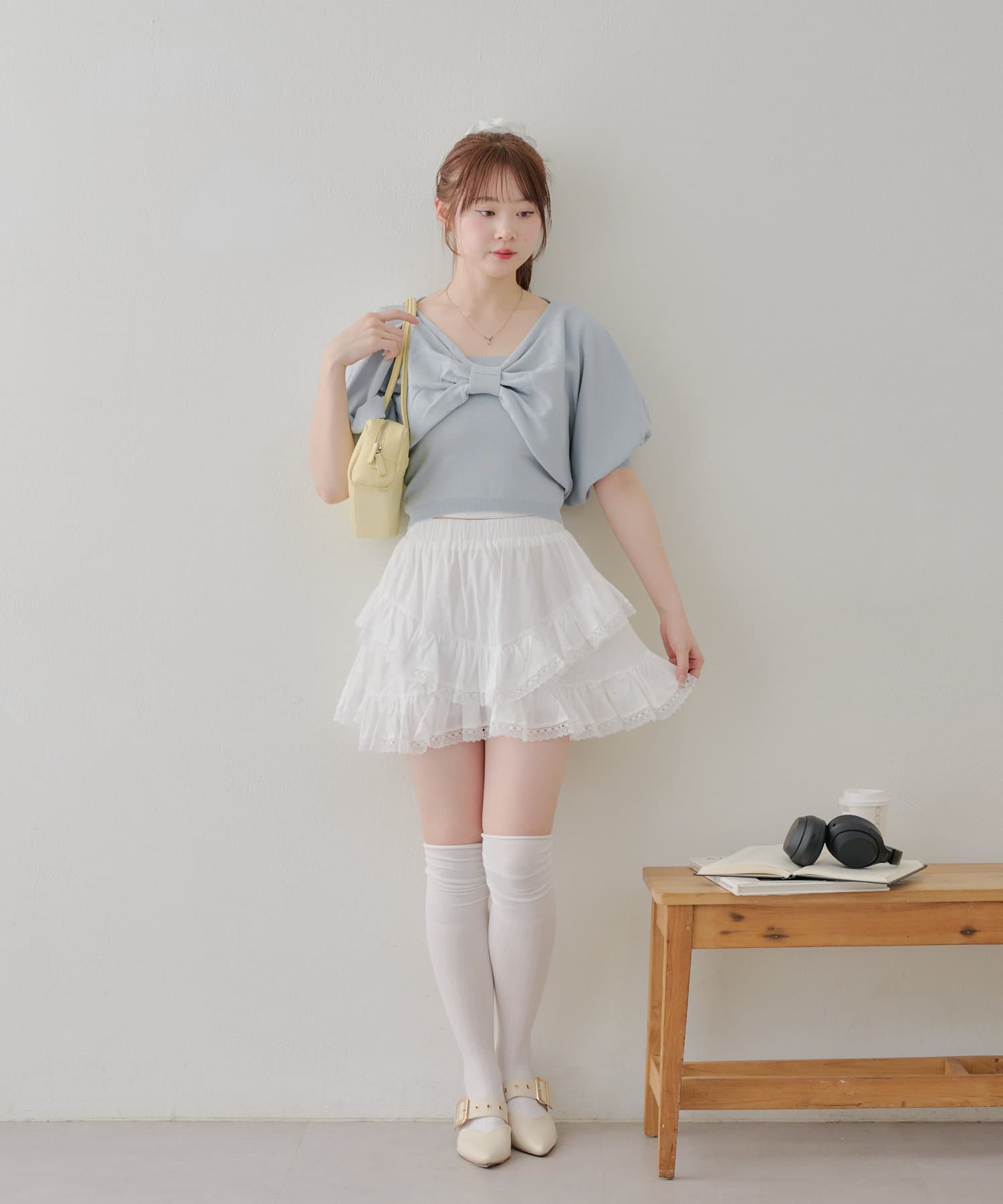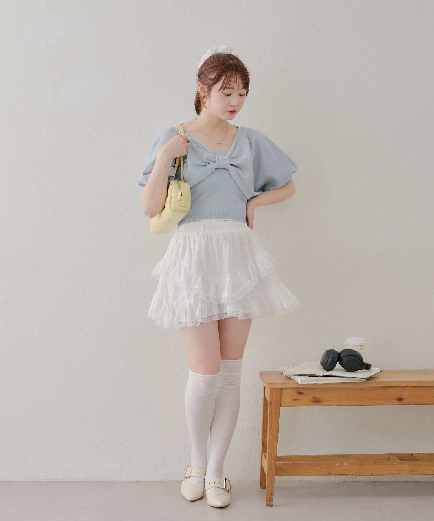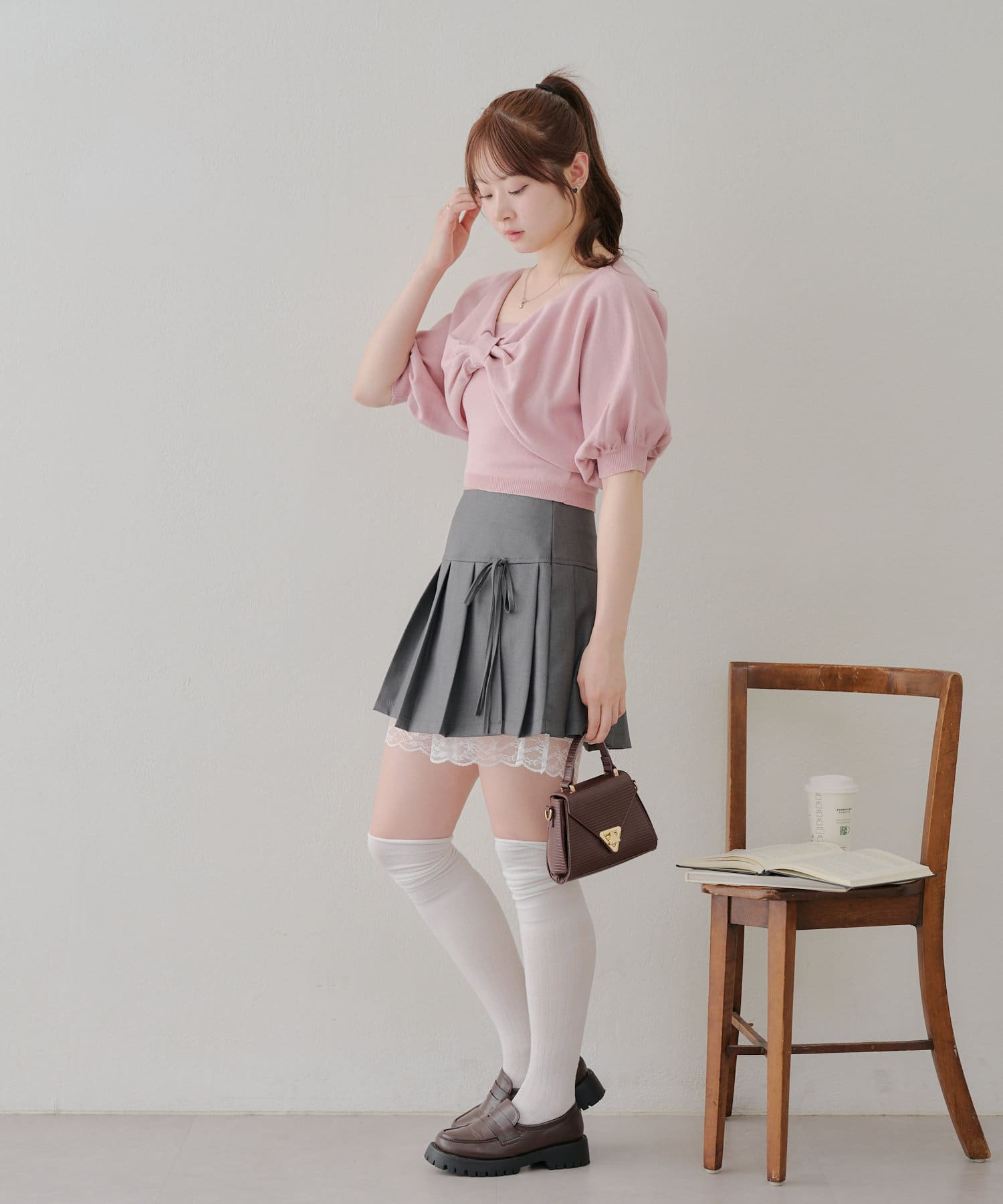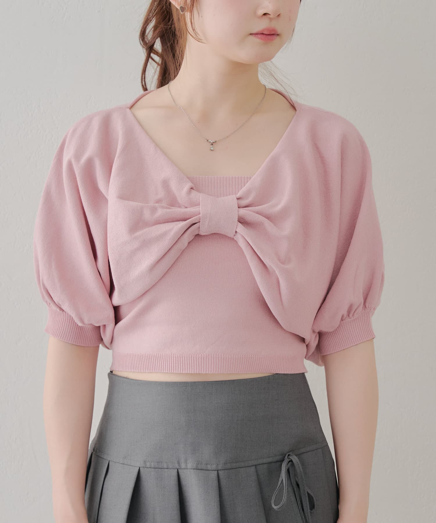 胸元の大きなリボンデザインがガーリーにしてくれるアンサンブル