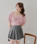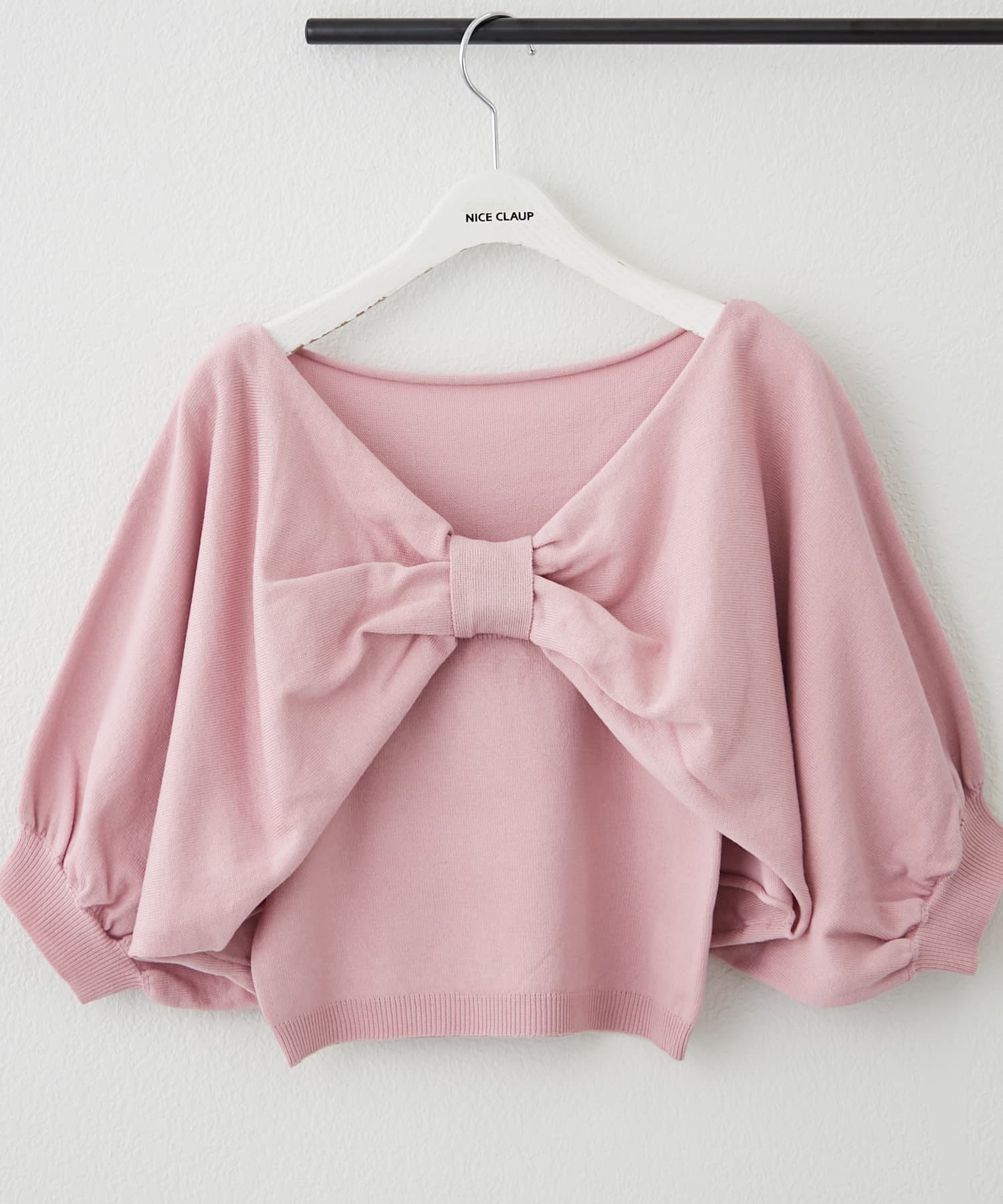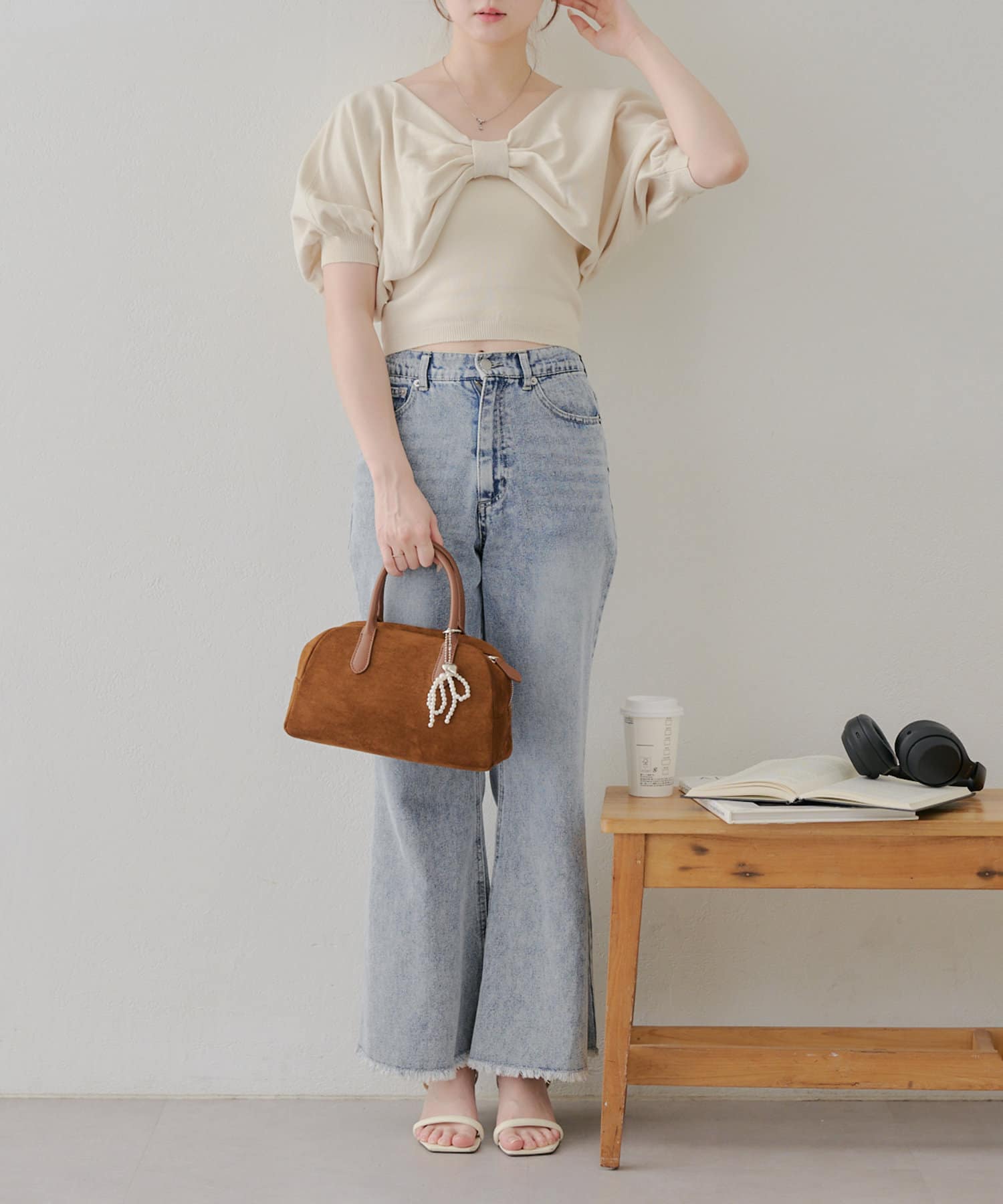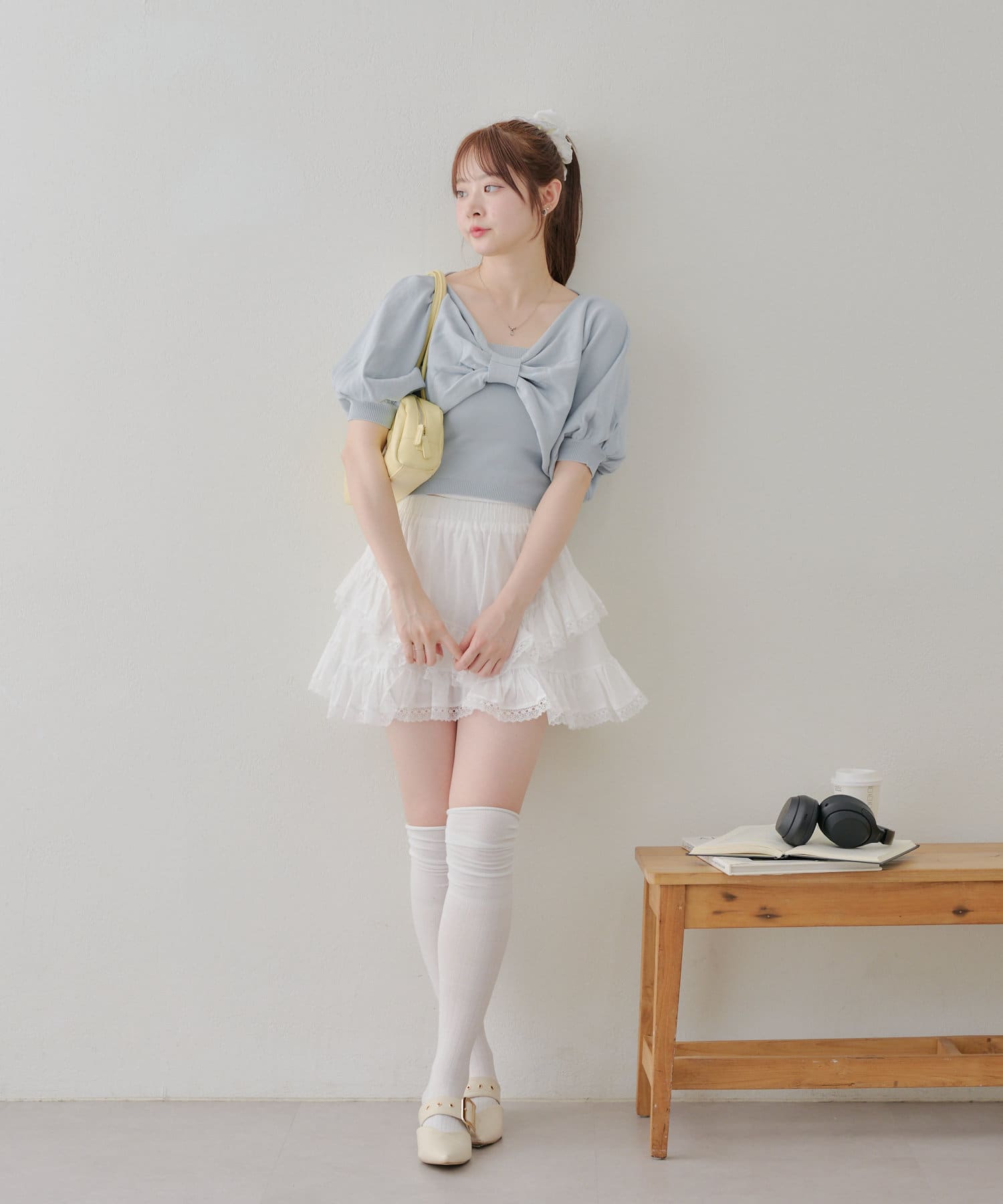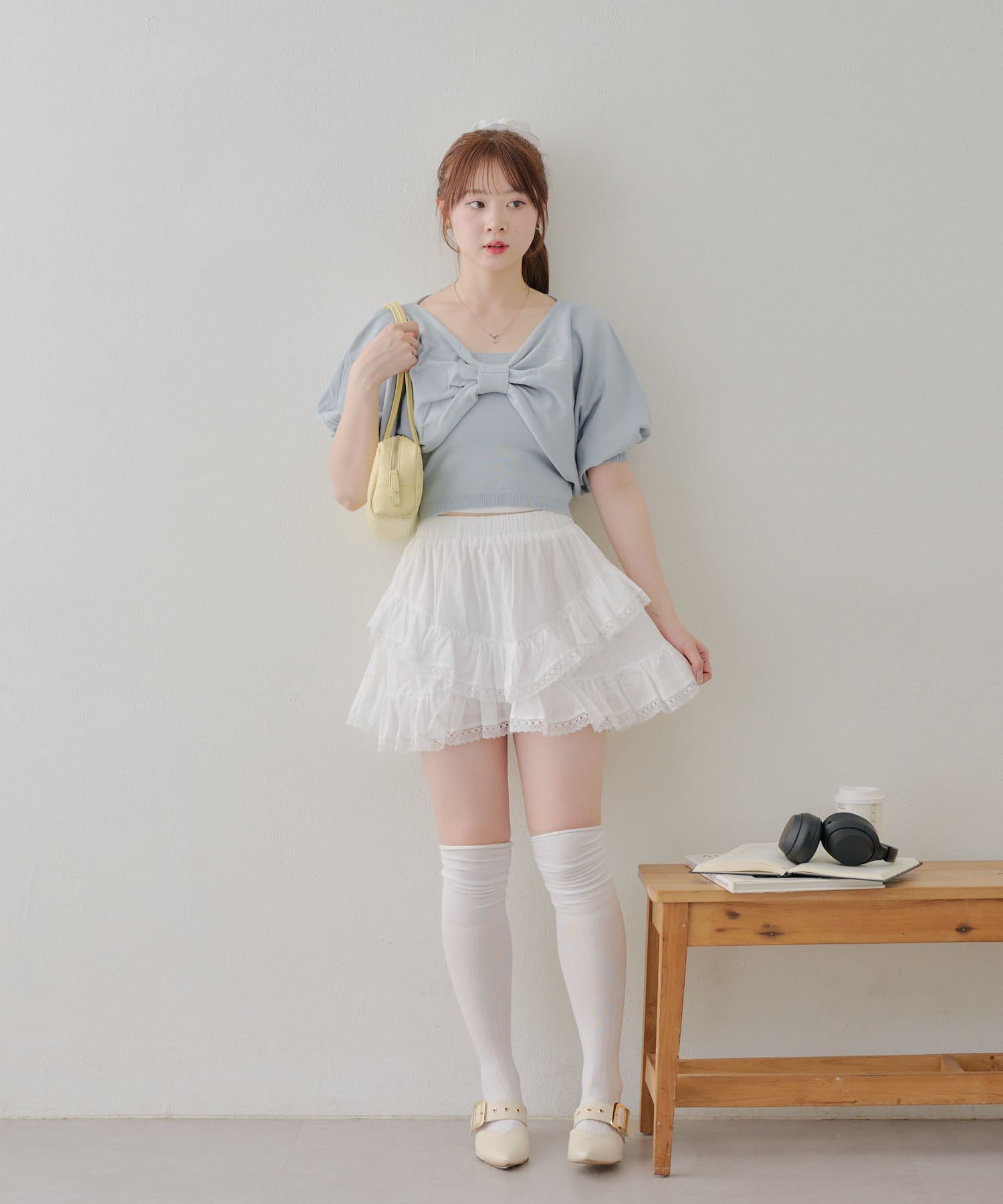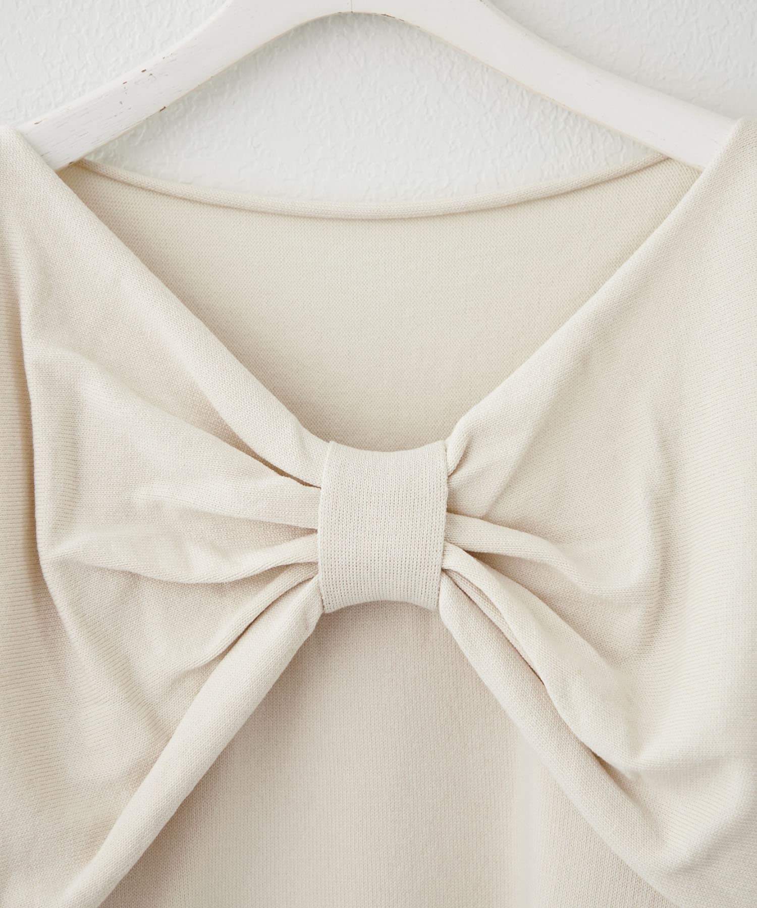 胸元の大きなリボンデザインがガーリーにしてくれるアンサンブル