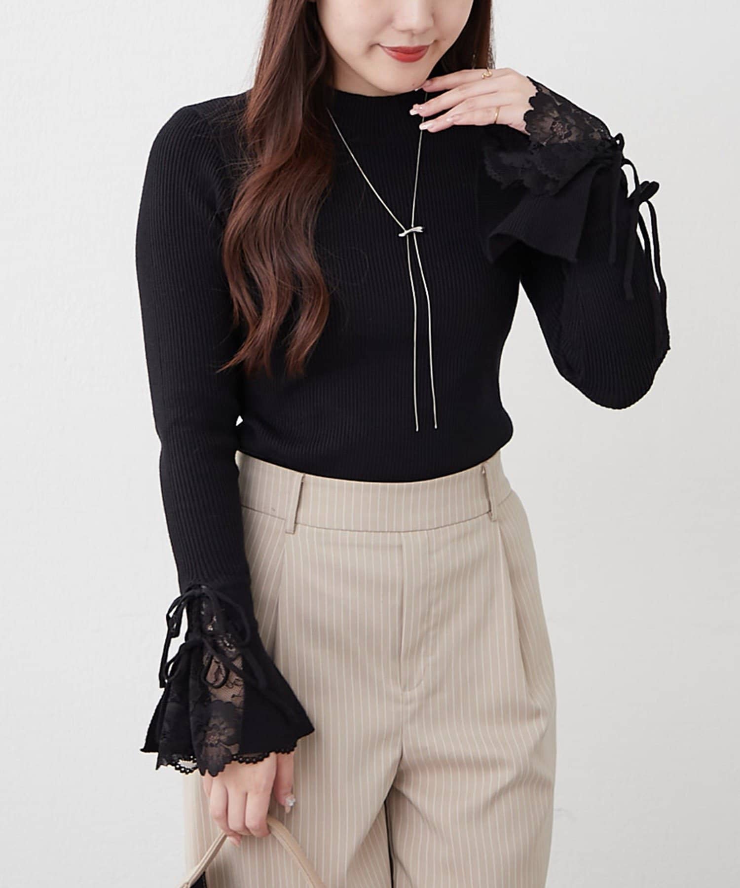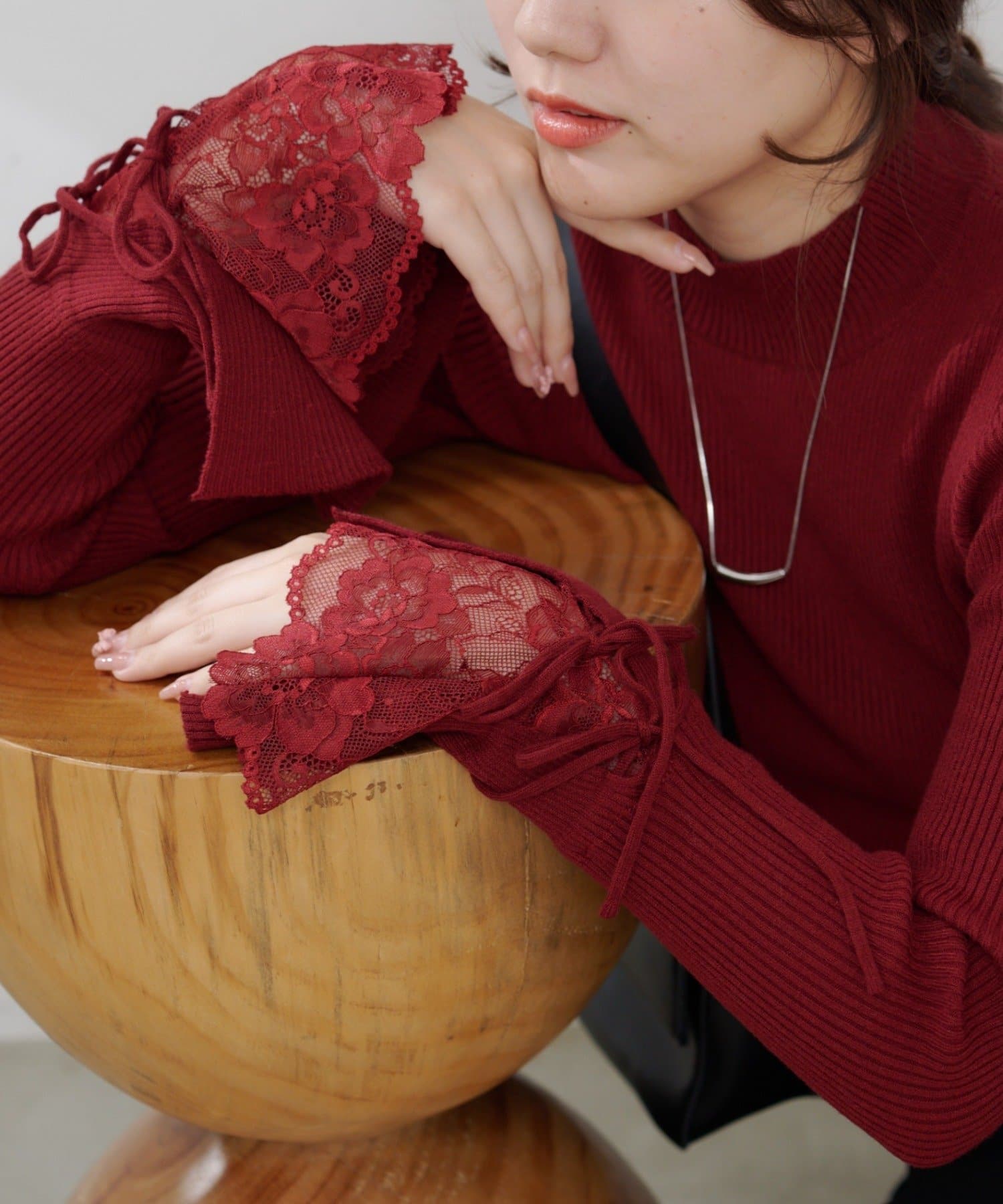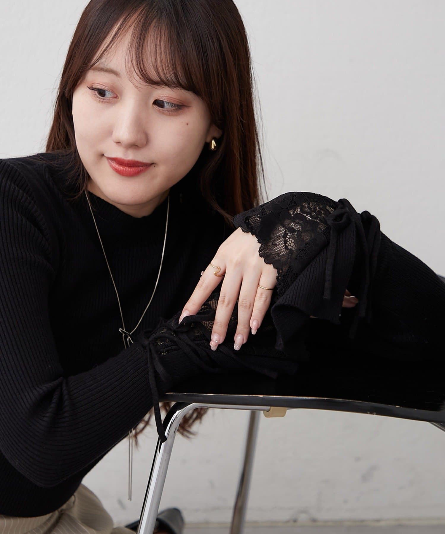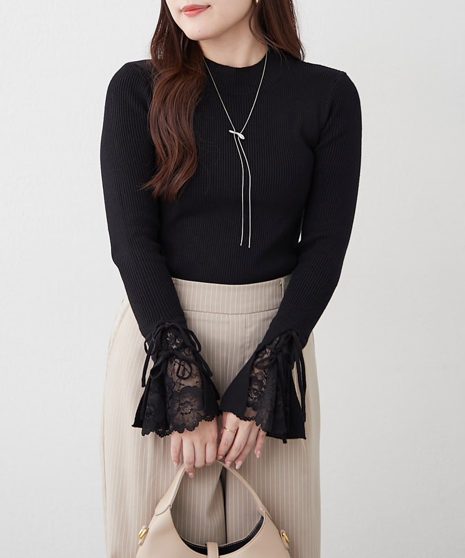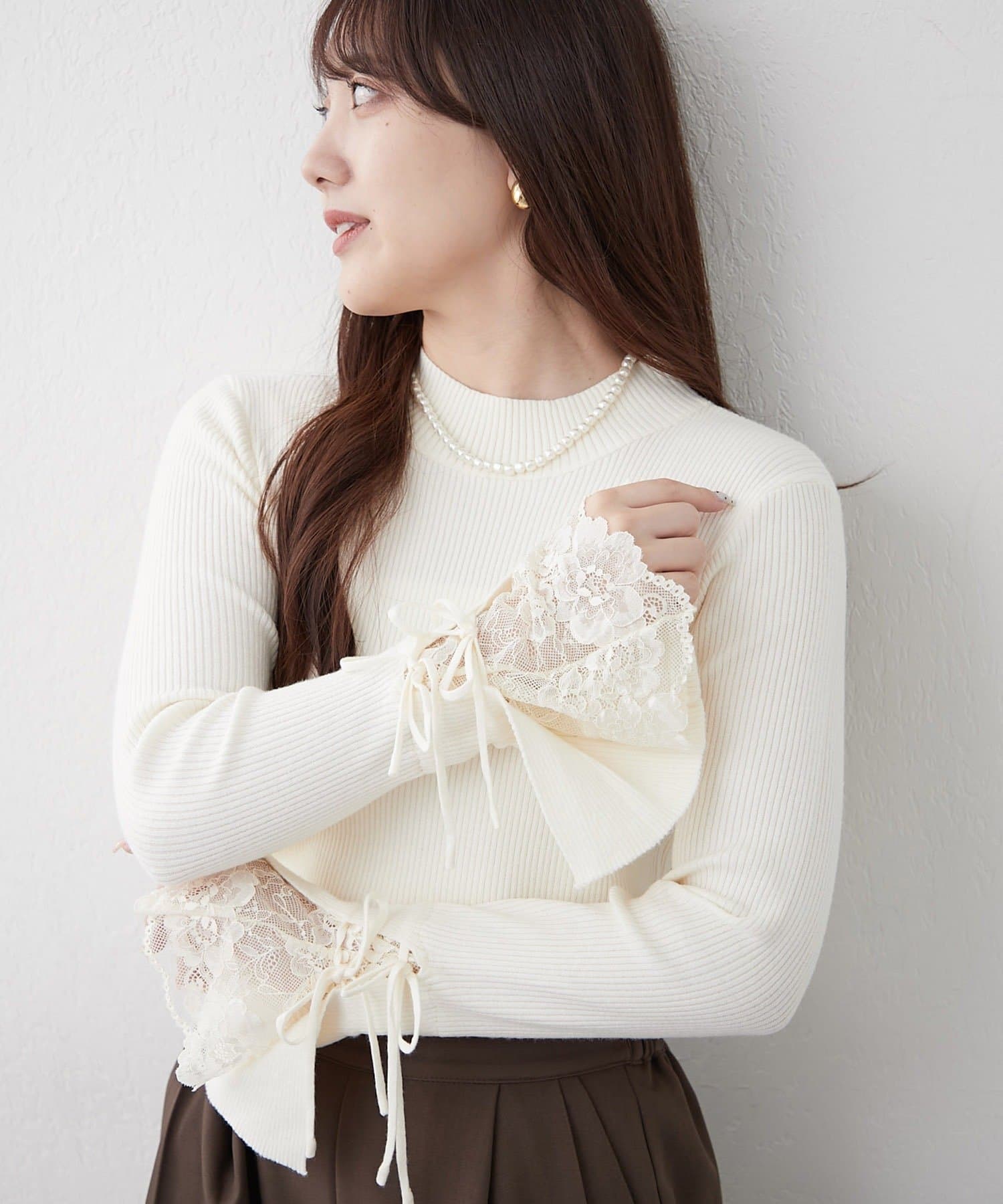 【6色展開】手元まで華やかに可愛く。袖レース&リボンニットトップス