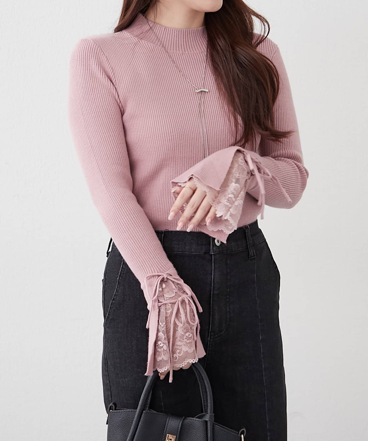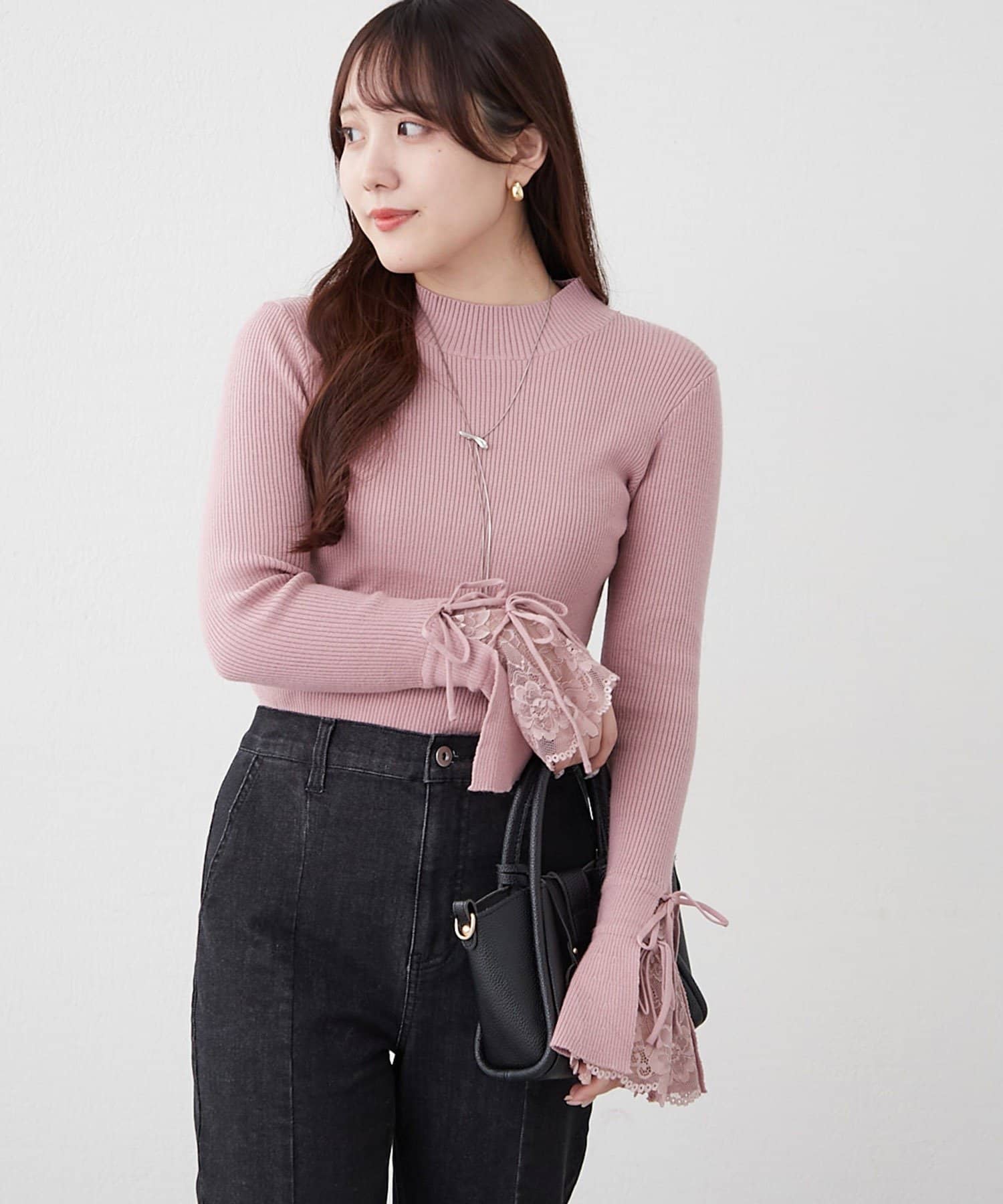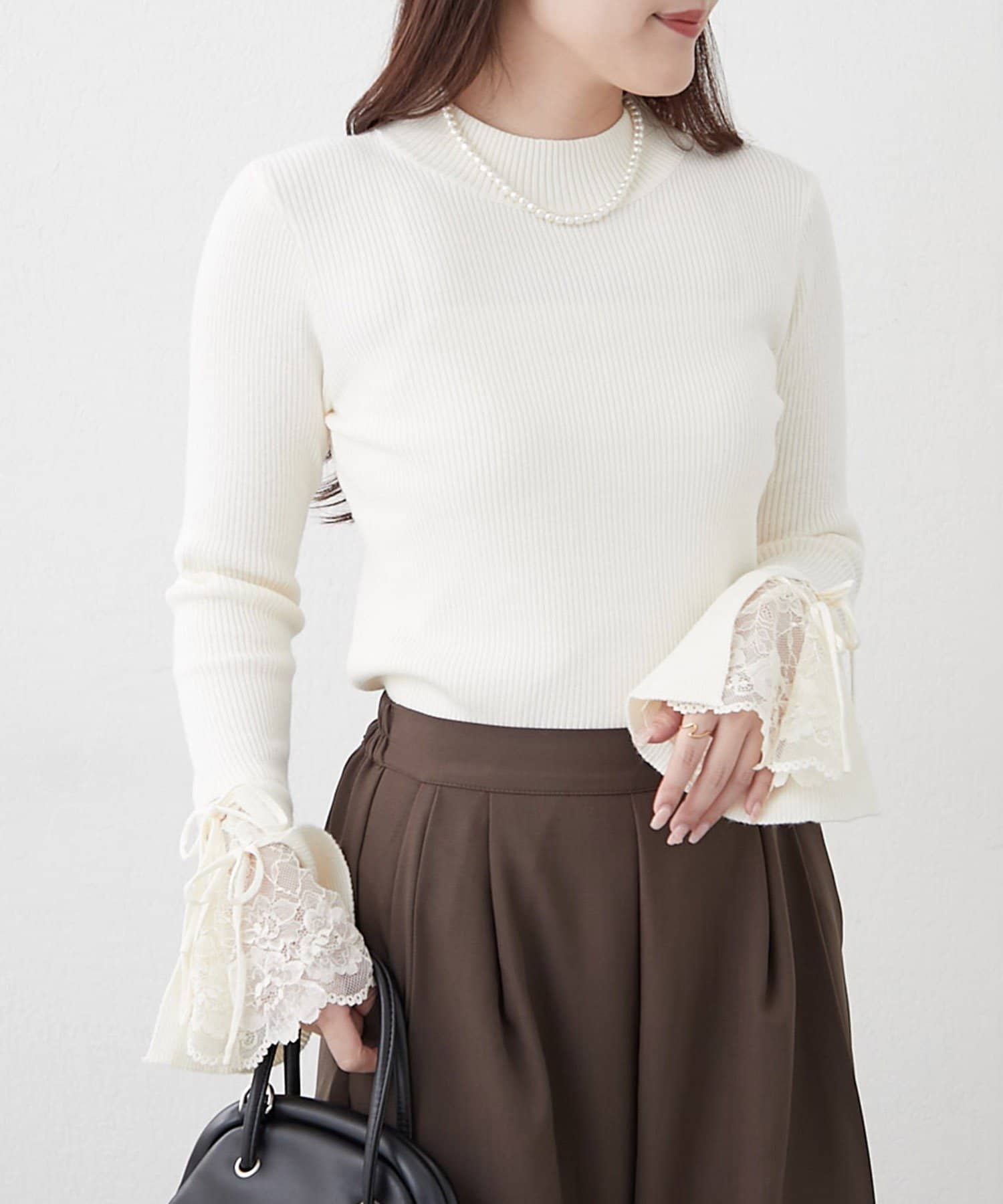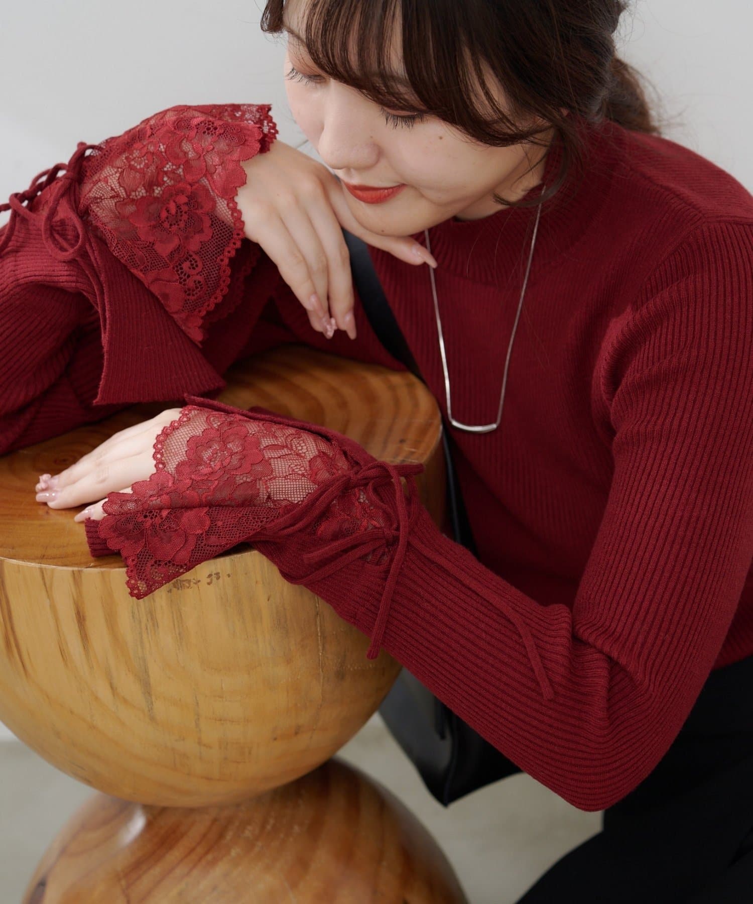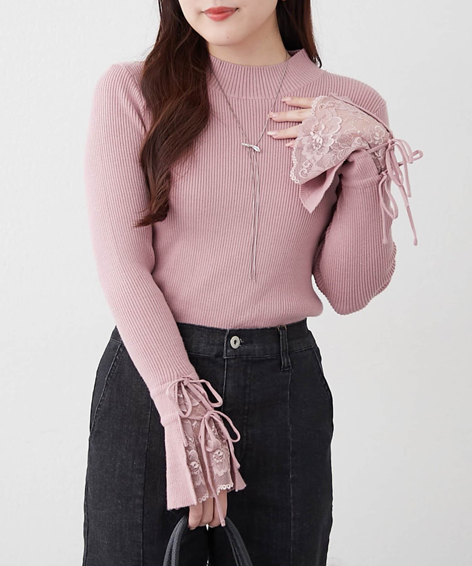 【6色展開】手元まで華やかに可愛く。袖レース&リボンニットトップス