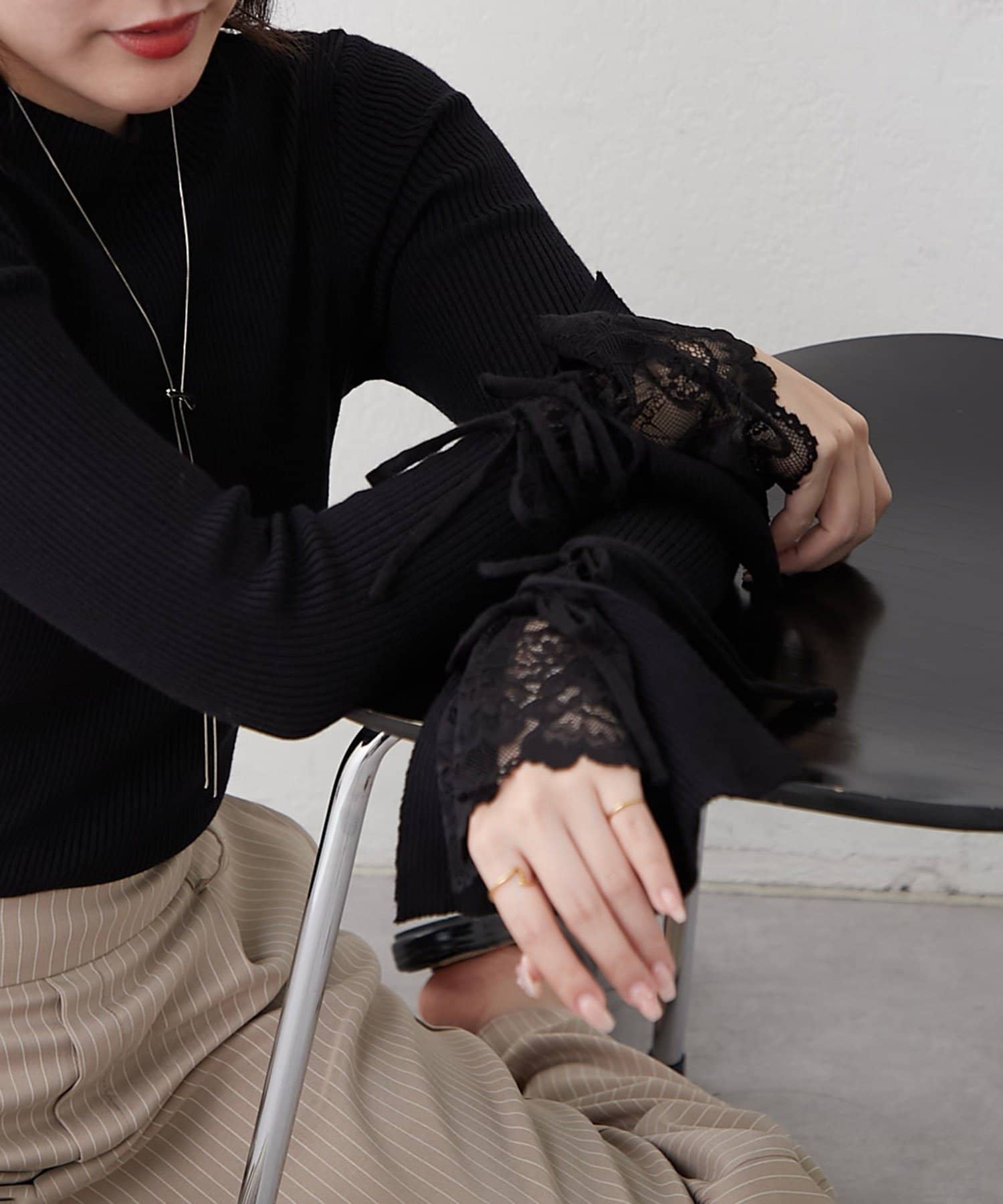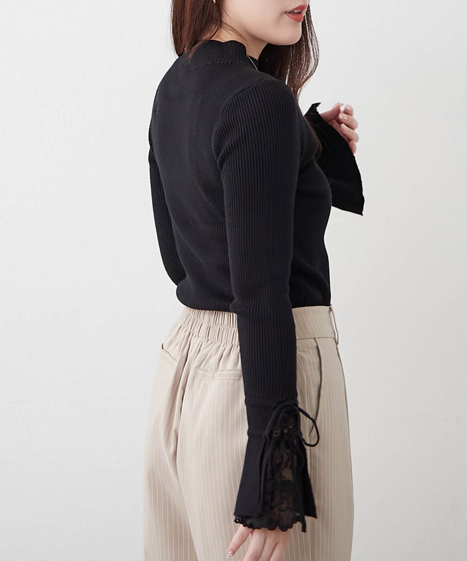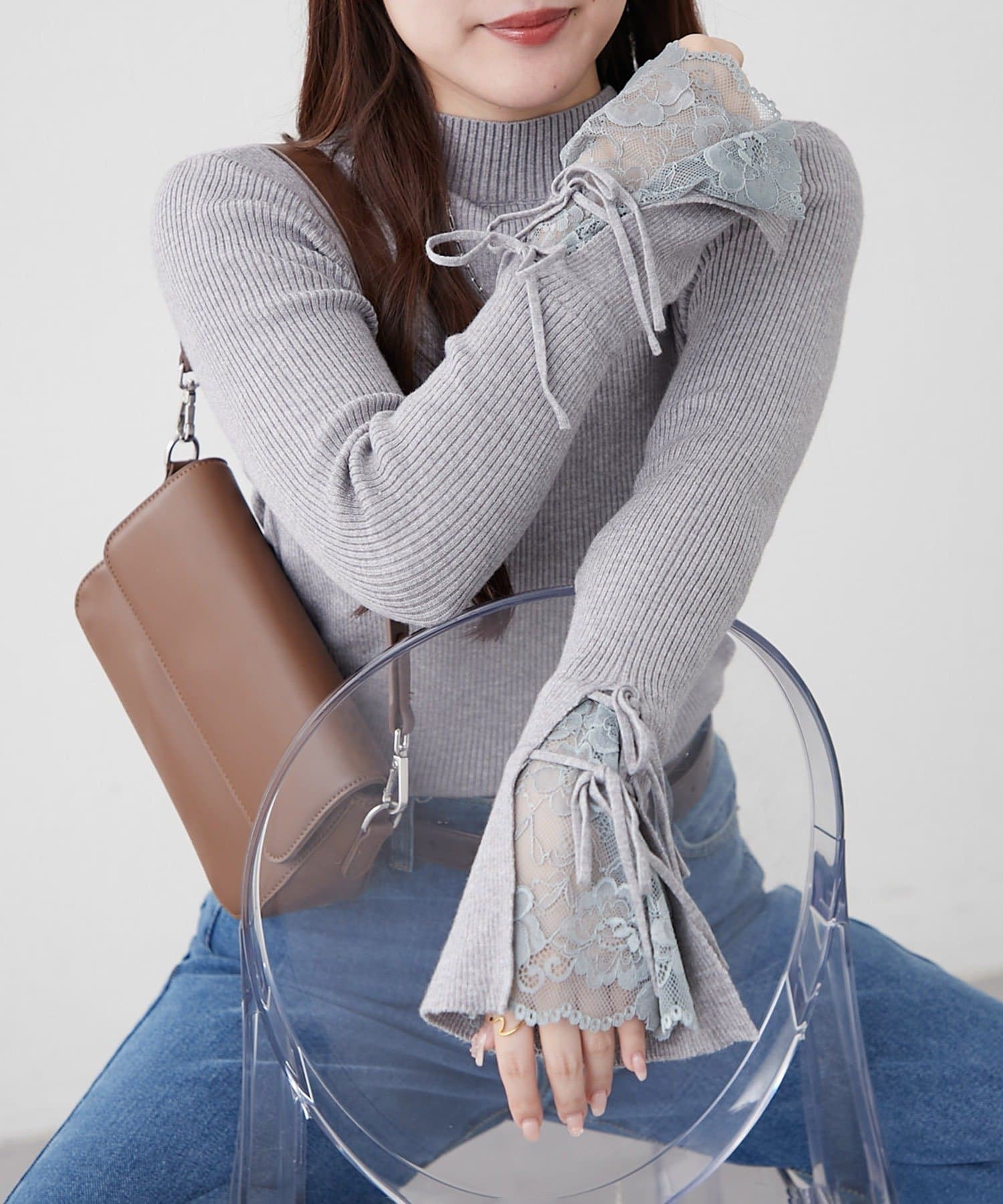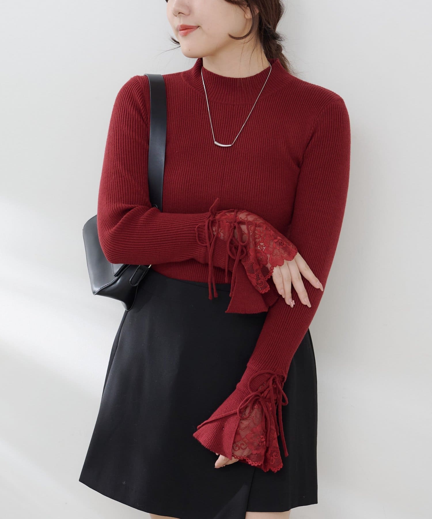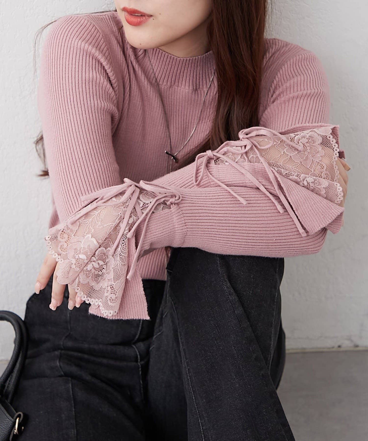 【6色展開】手元まで華やかに可愛く。袖レース&リボンニットトップス