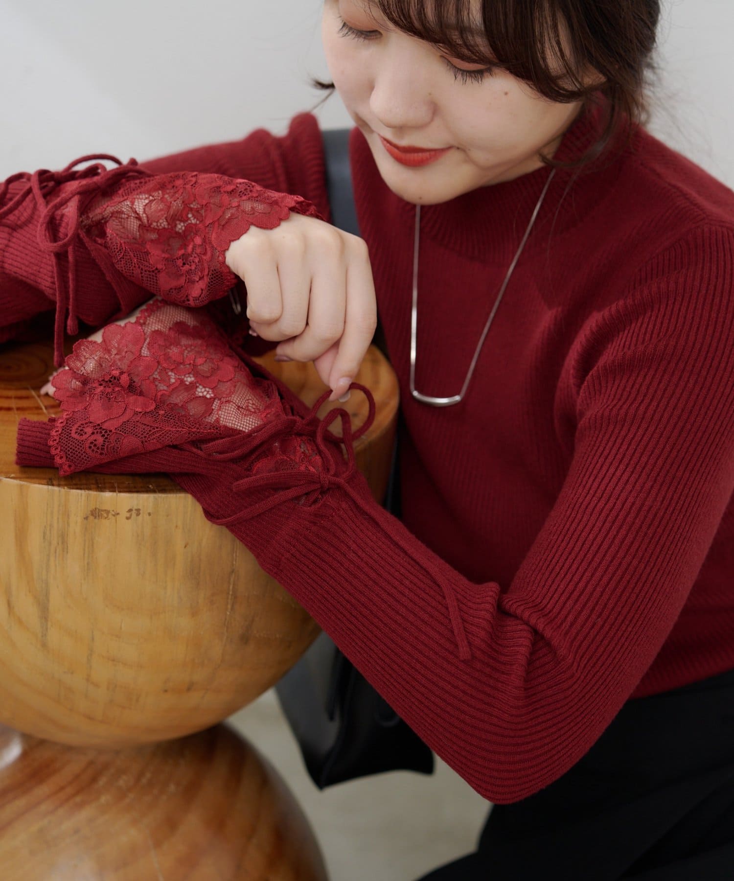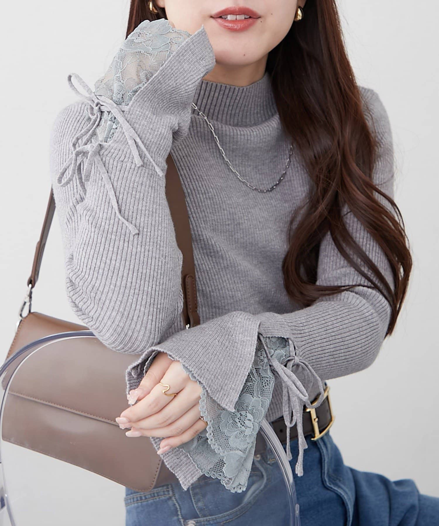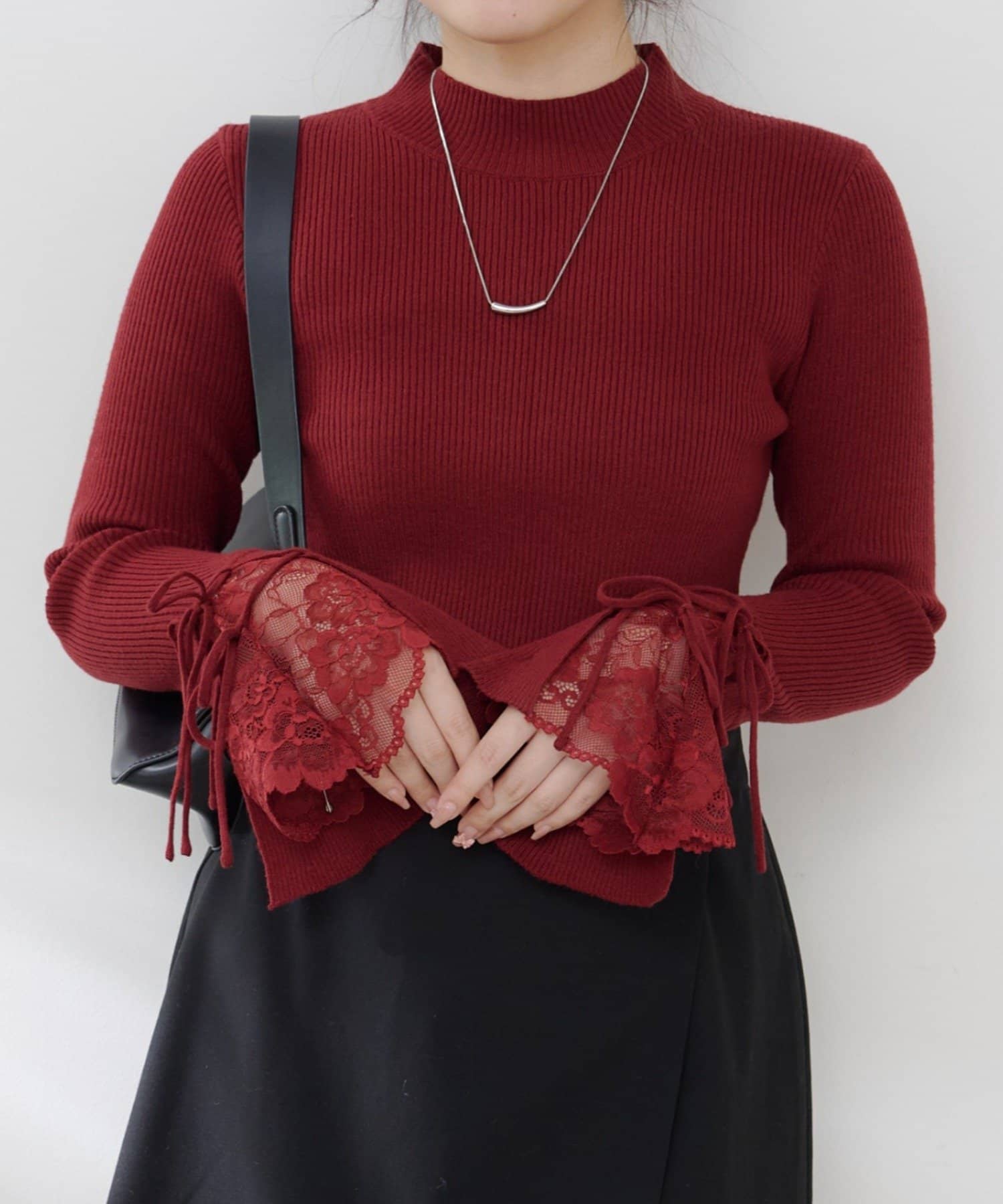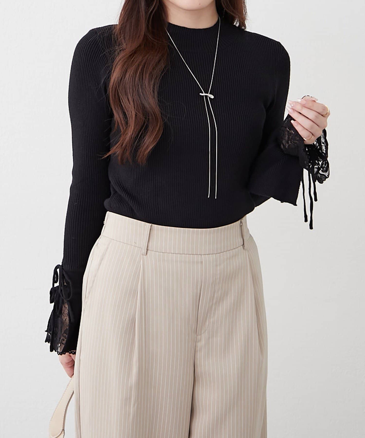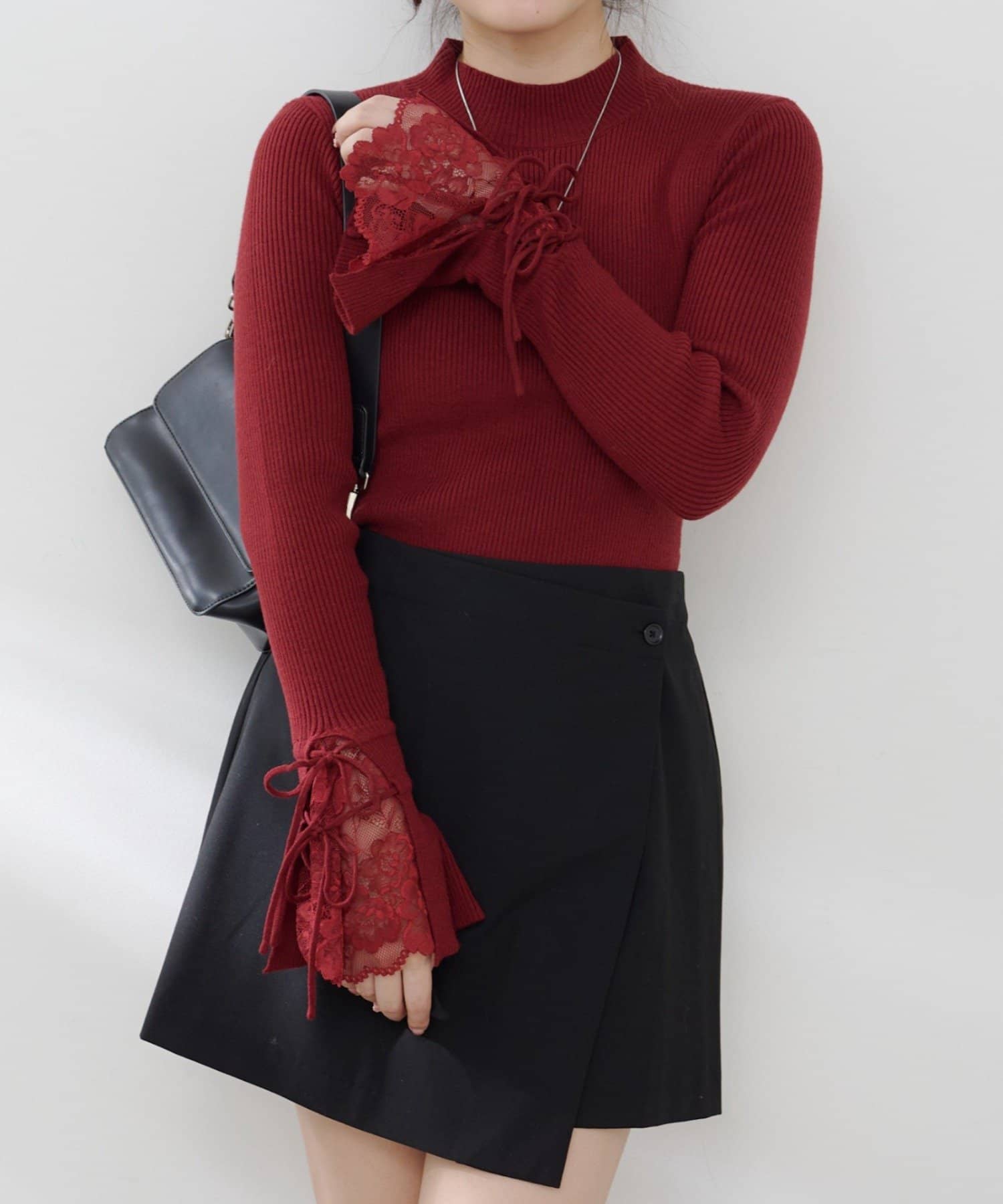 【6色展開】手元まで華やかに可愛く。袖レース&リボンニットトップス