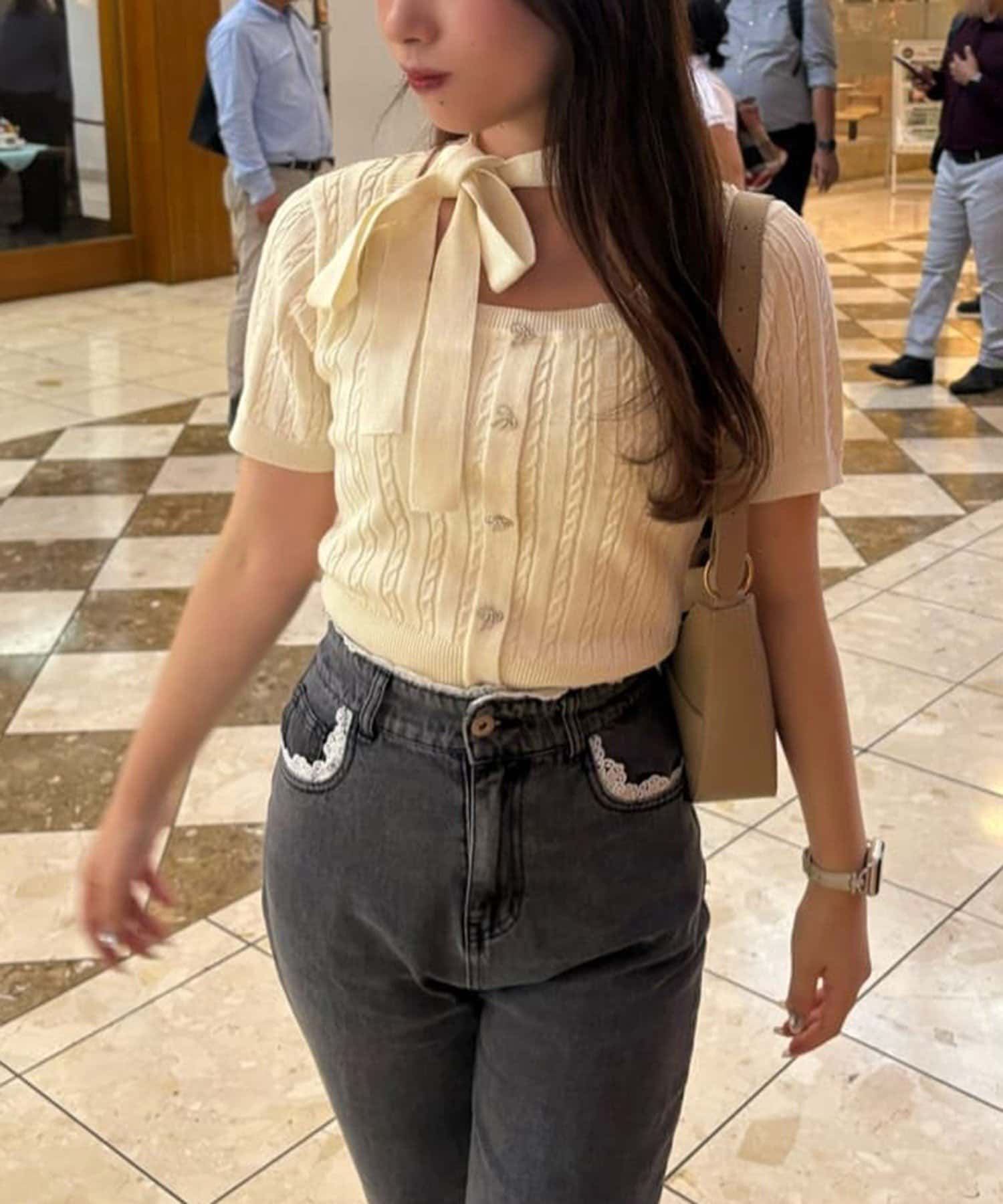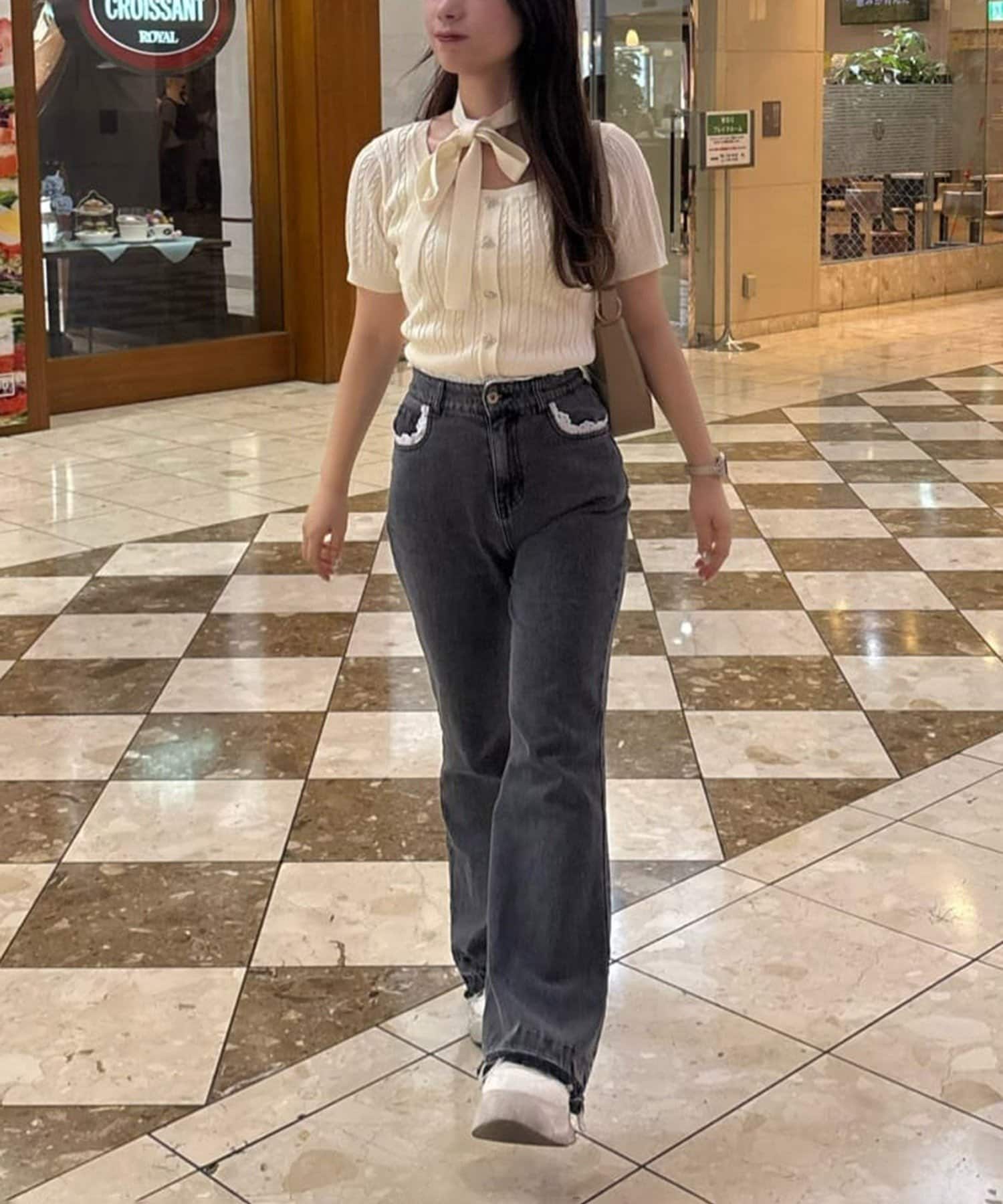 ・タイトなフレアデニムパンツを合わせれば、韓国っぽレディライクなきこなしに