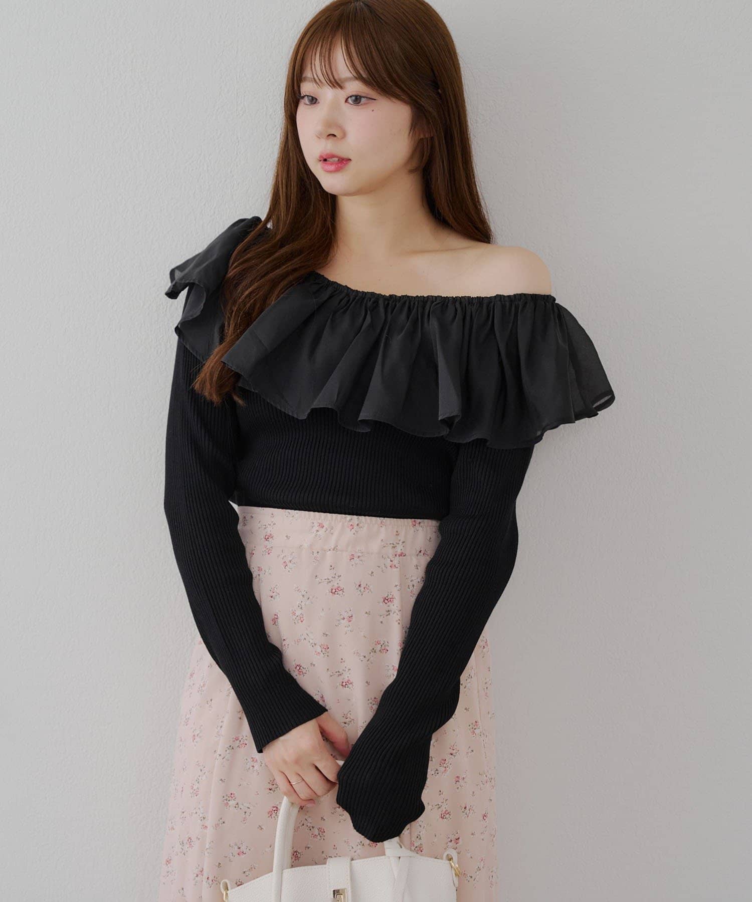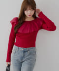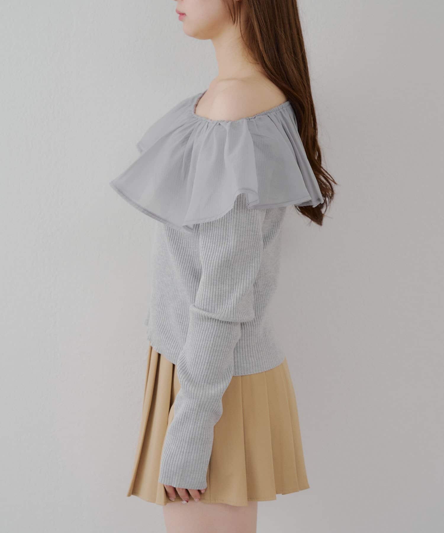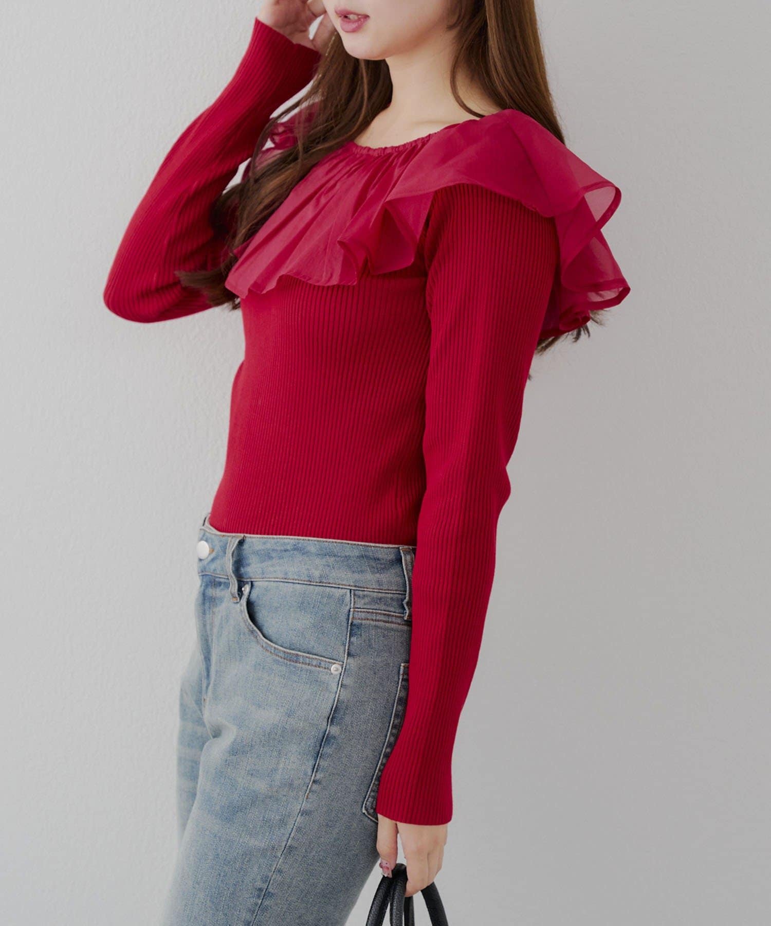 ・細身のリブニットに大きめのフリル襟が付いたアイテム。