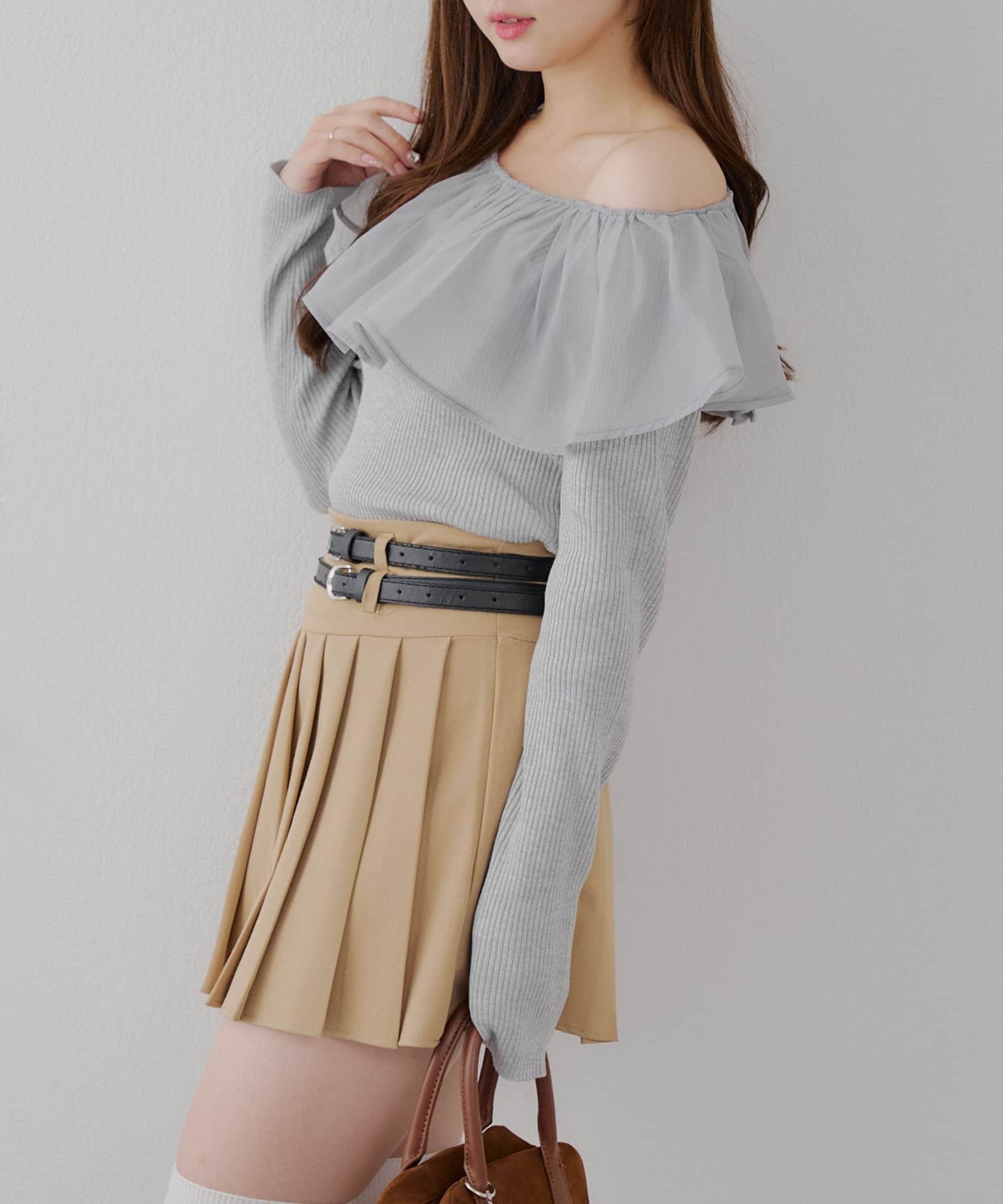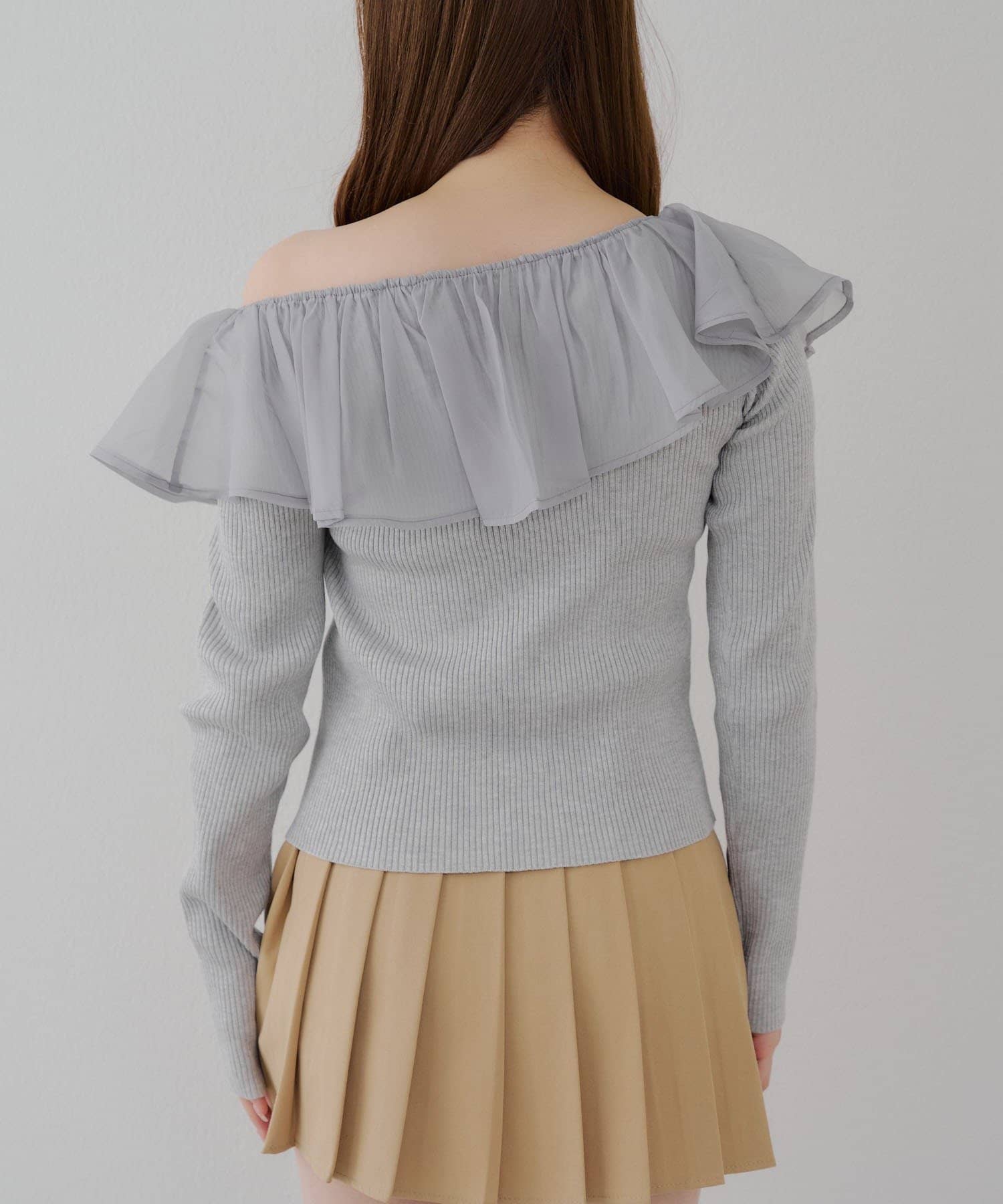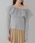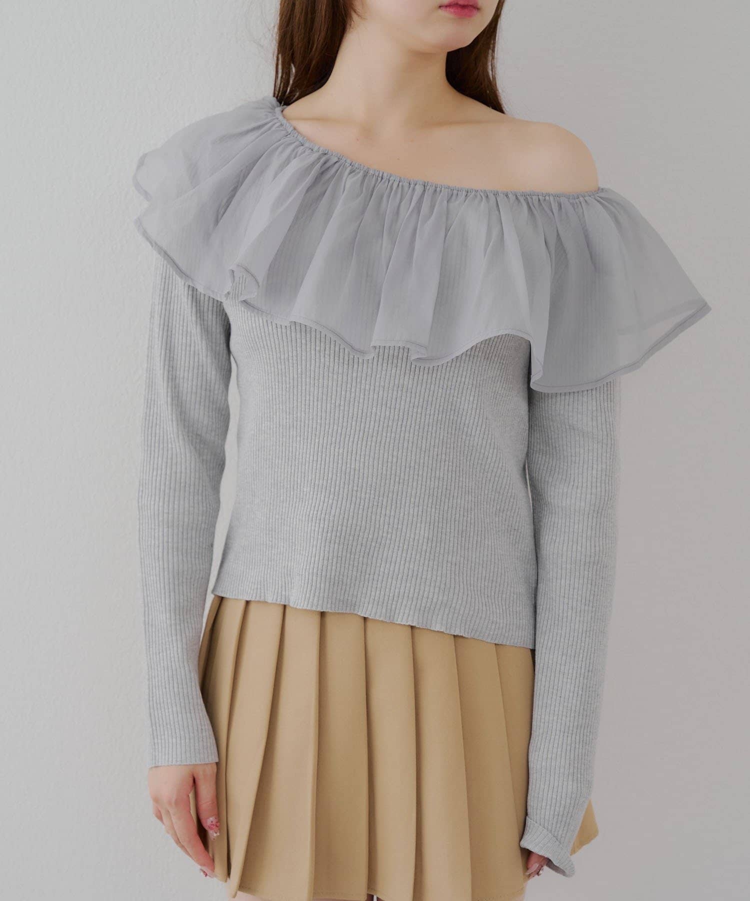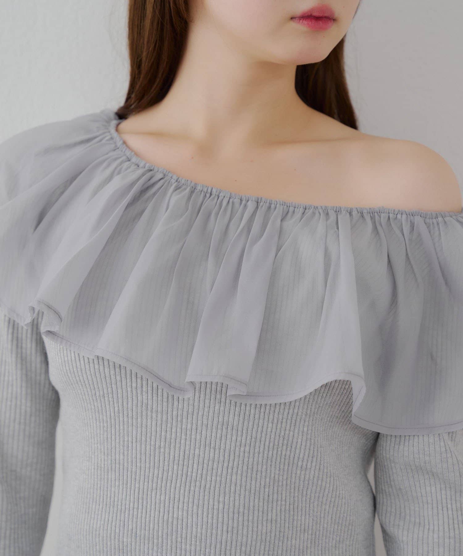 ・細身のリブニットに大きめのフリル襟が付いたアイテム。