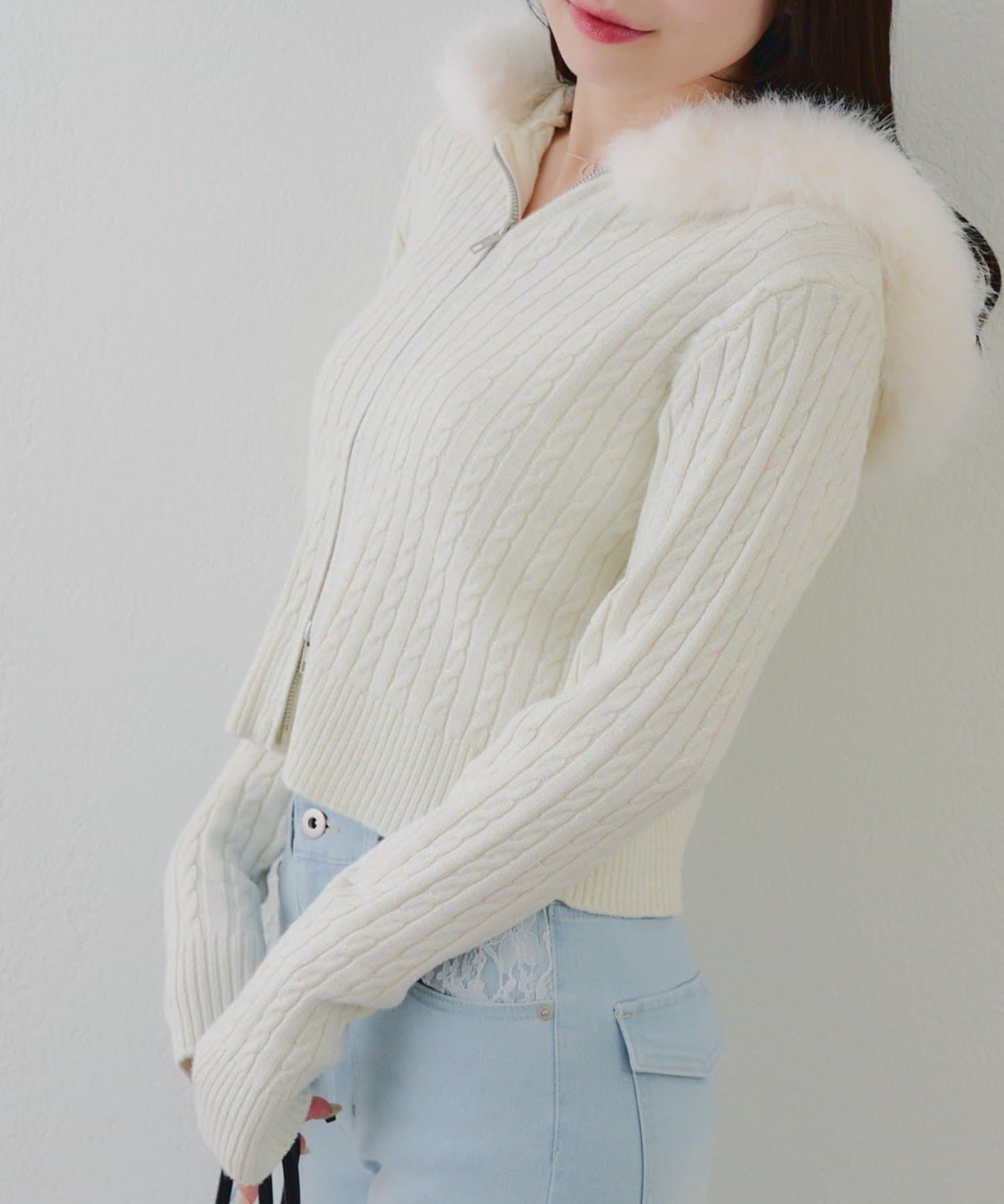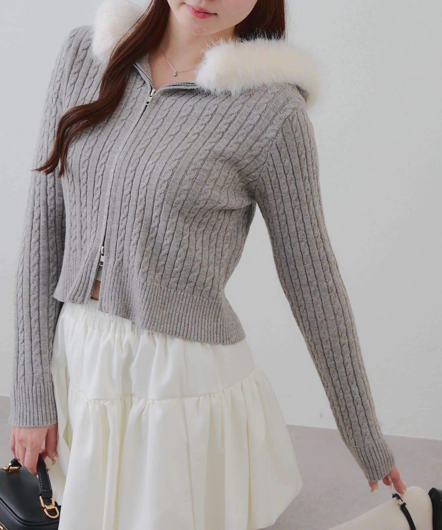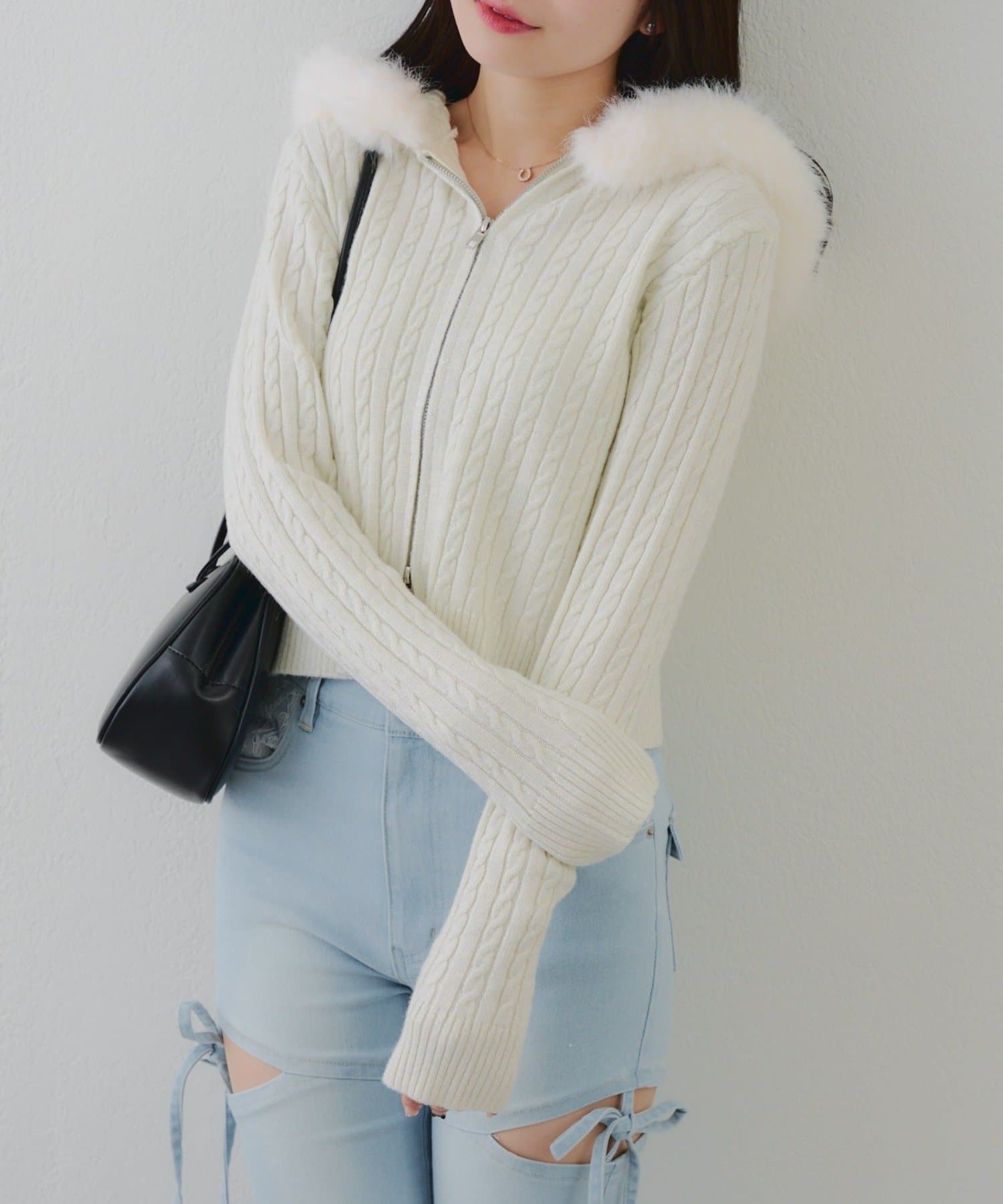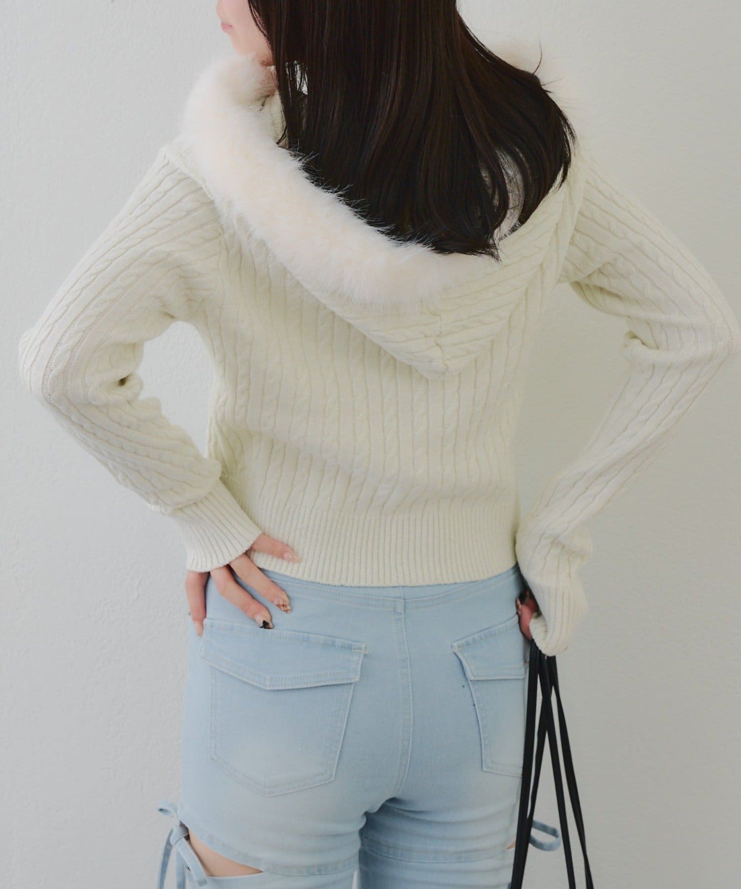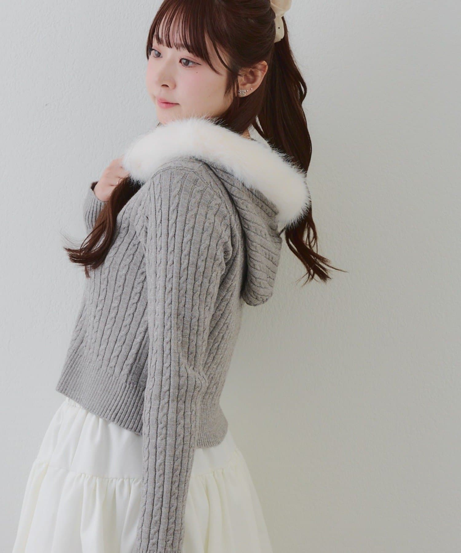 ・ケーブル編みとボリューム感のあるファーがシーズンムードを演出するパーカー
