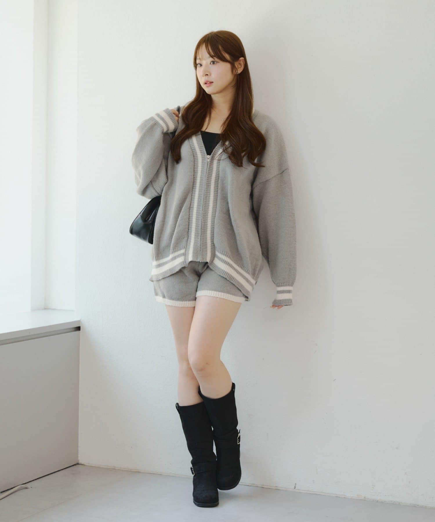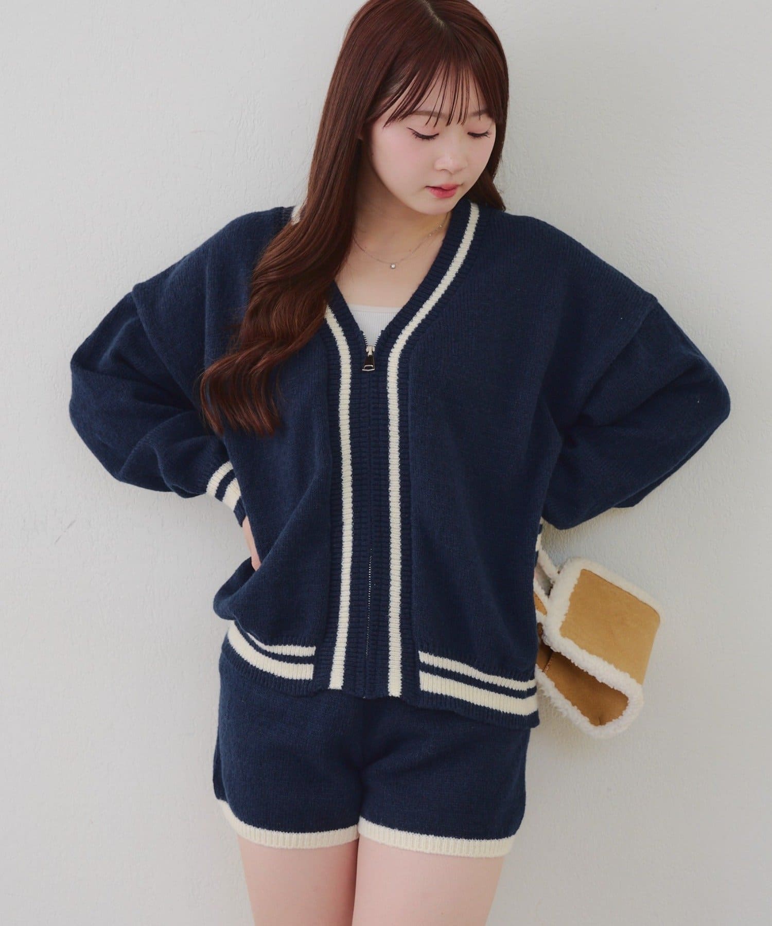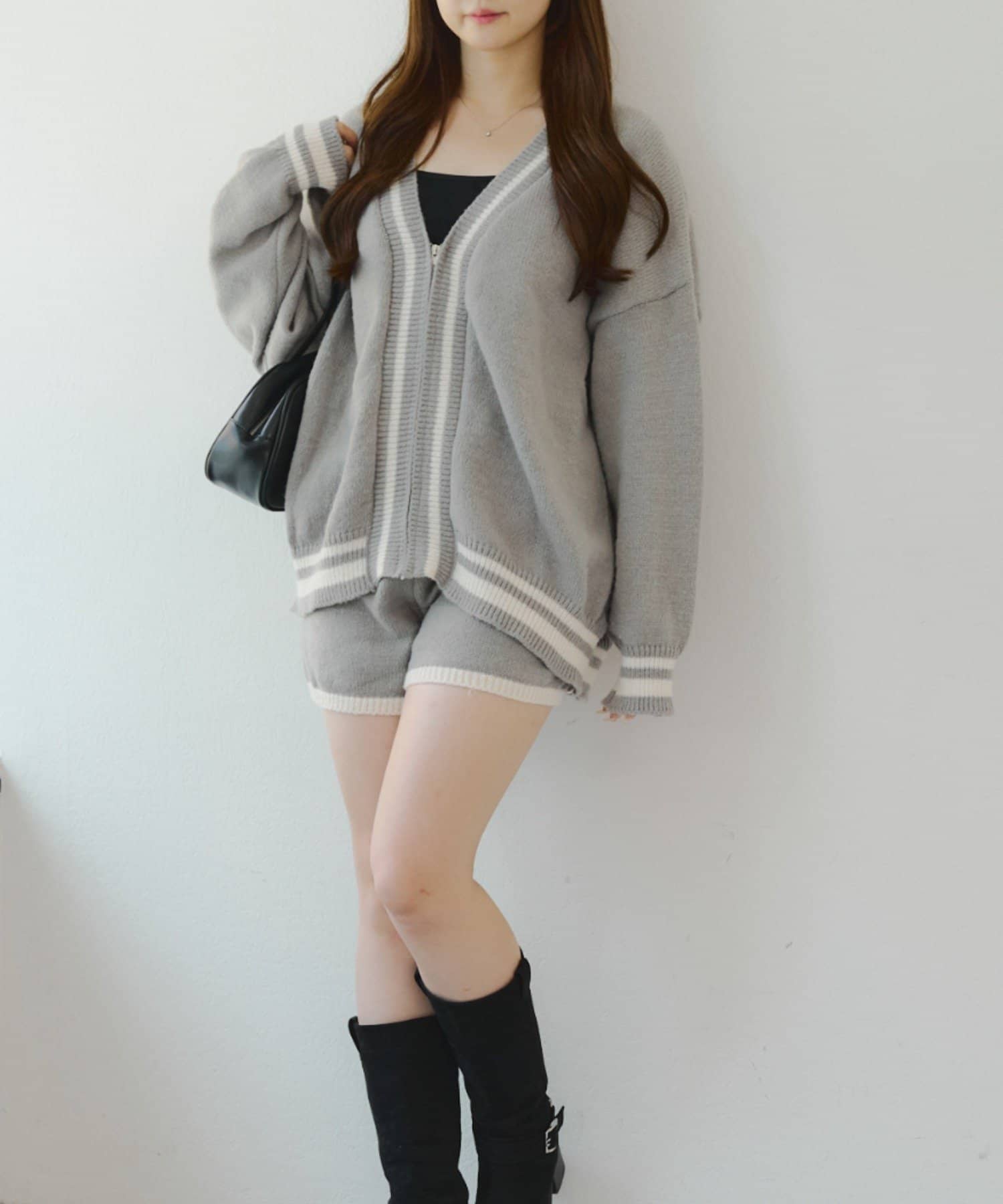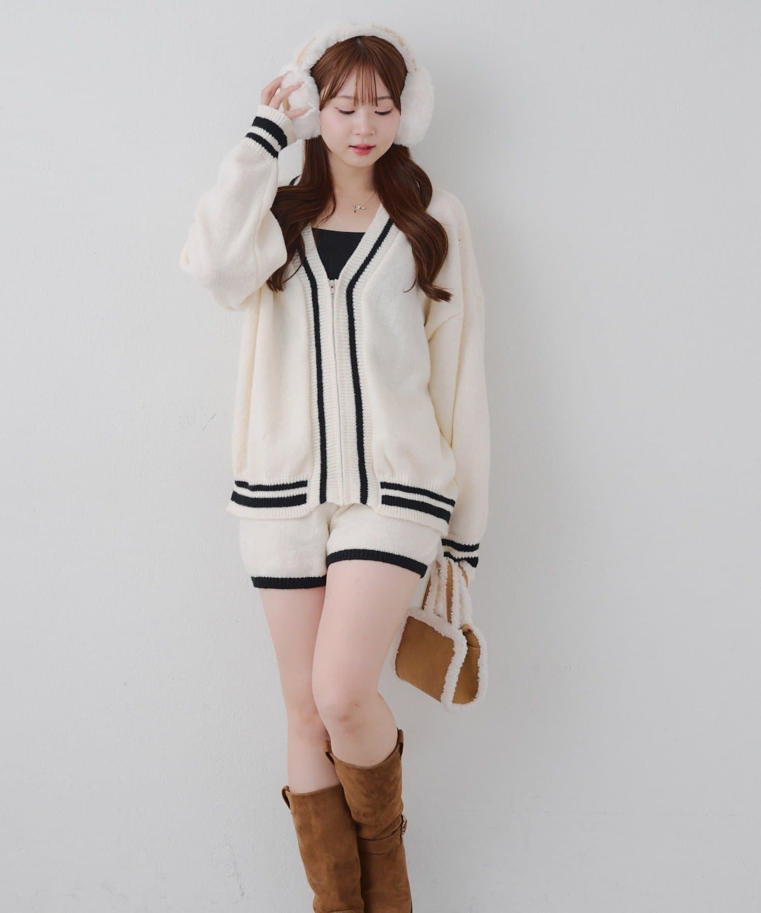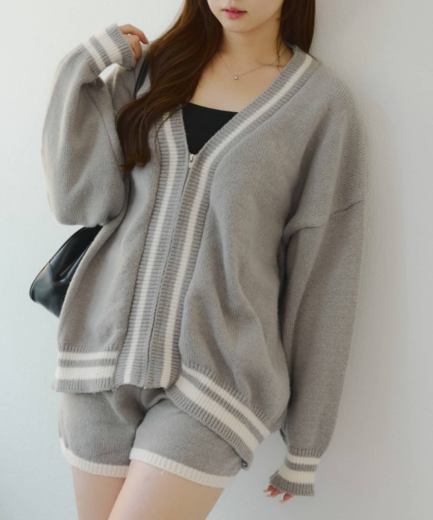 ・ジップデザインが洗練された印象のカーディガンとショートパンツのセットアイテム