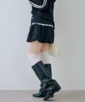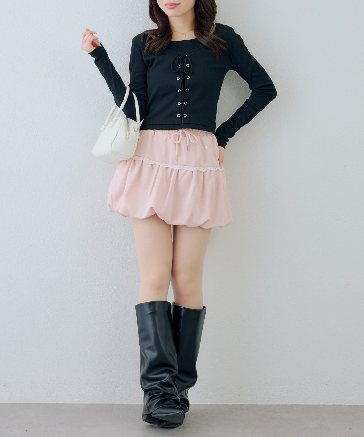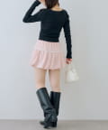 ・タイトな黒のリブニットを合わせて、甘すぎない着こなしに。足元はブーツで引き締めて