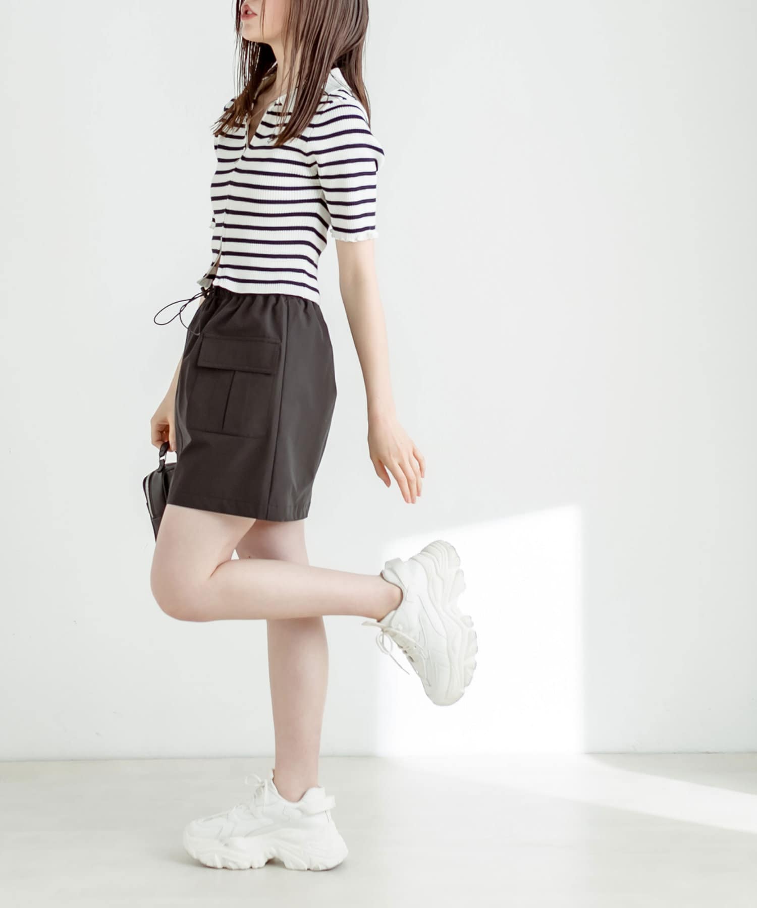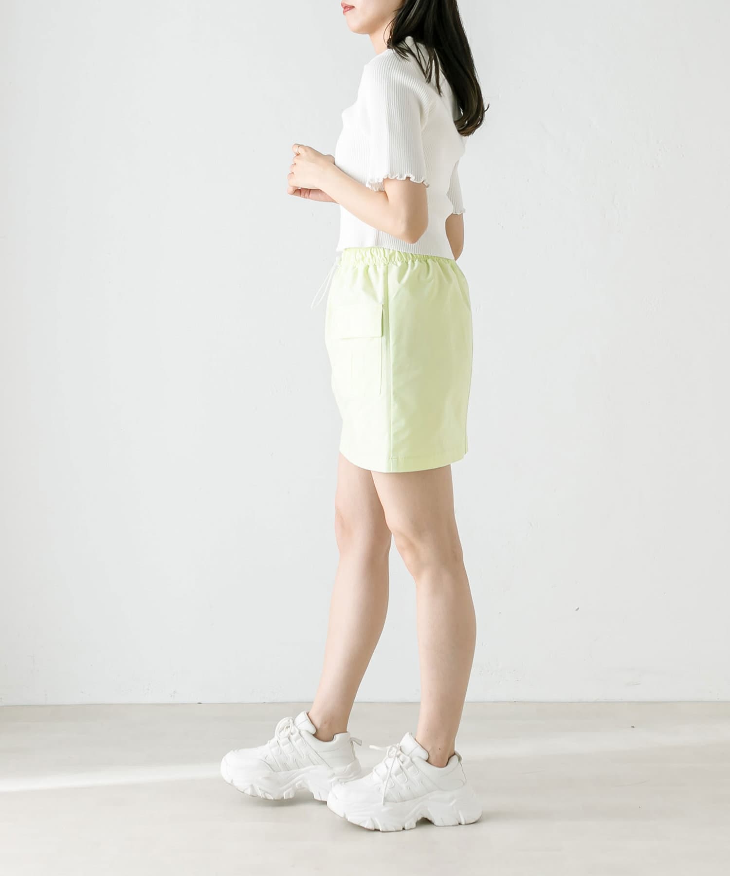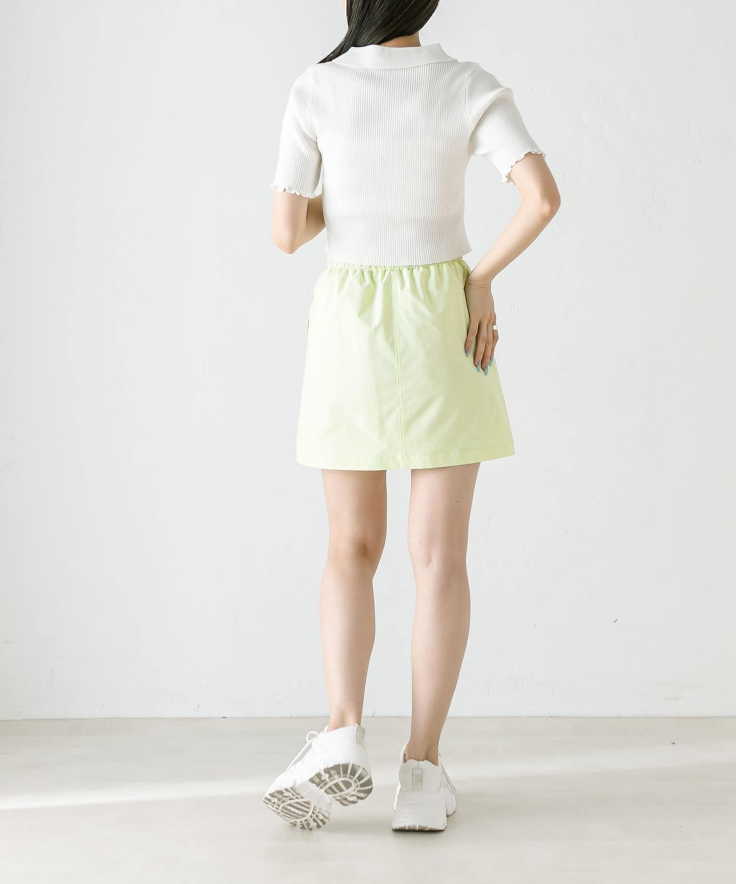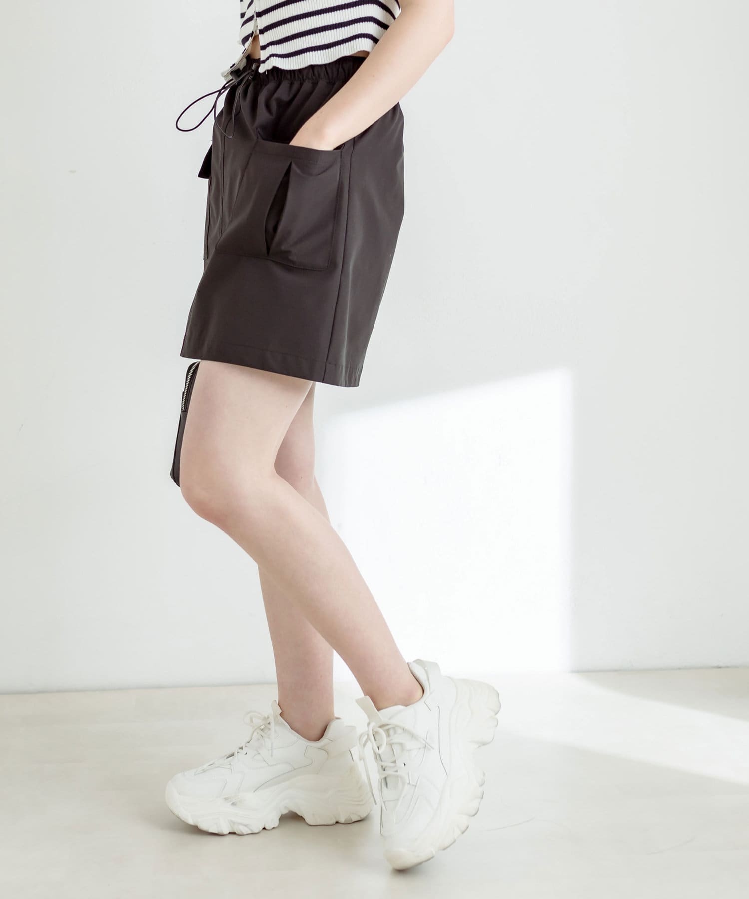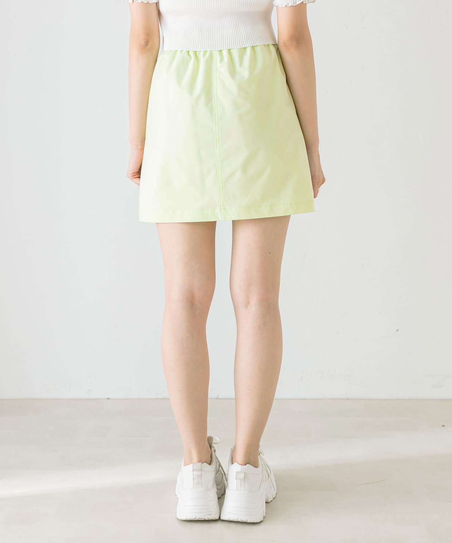 ・カジュアルな印象のカーゴスカートですが、つるんとした素材でカジュアルすぎずガーリーに着ていただけます。