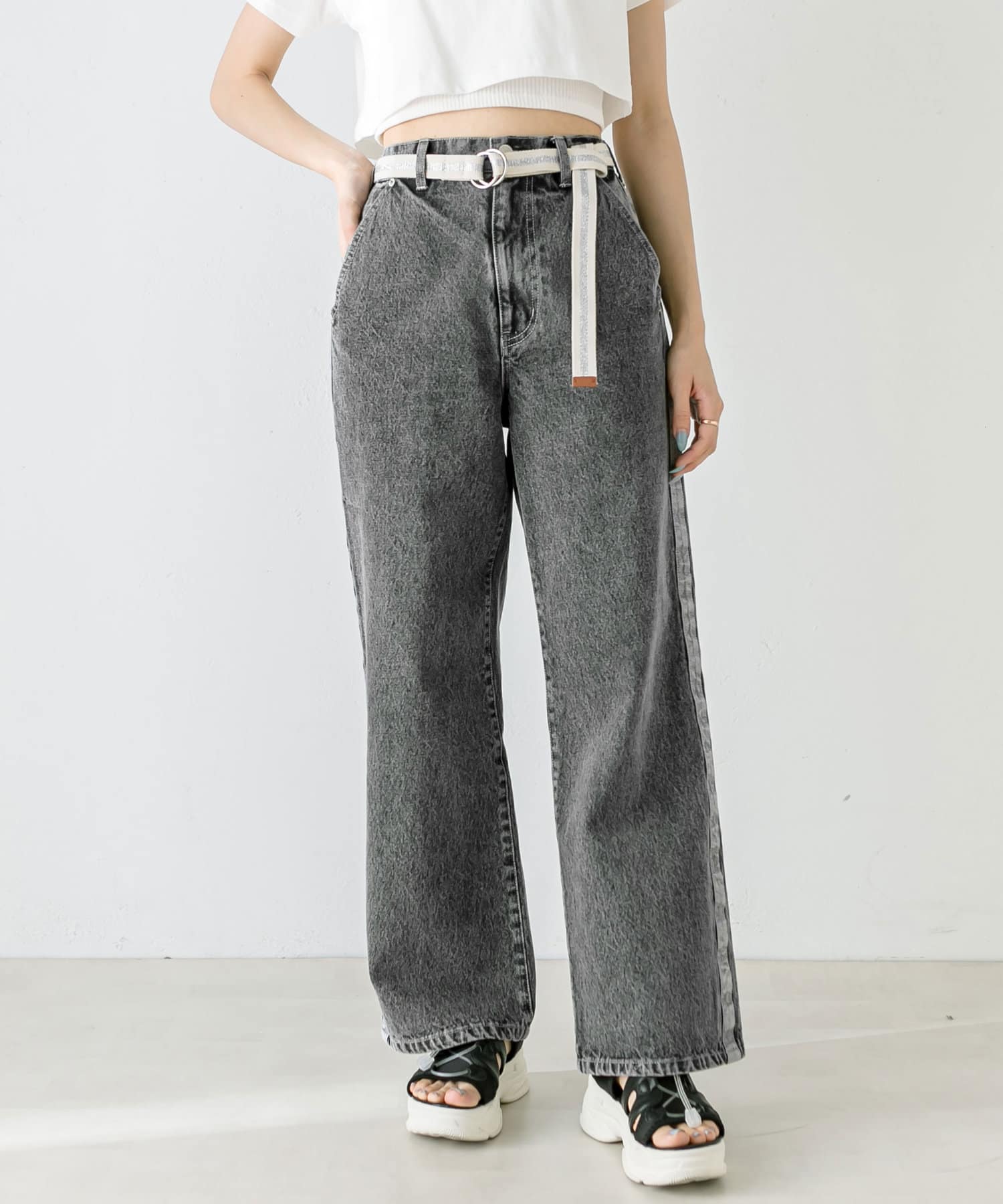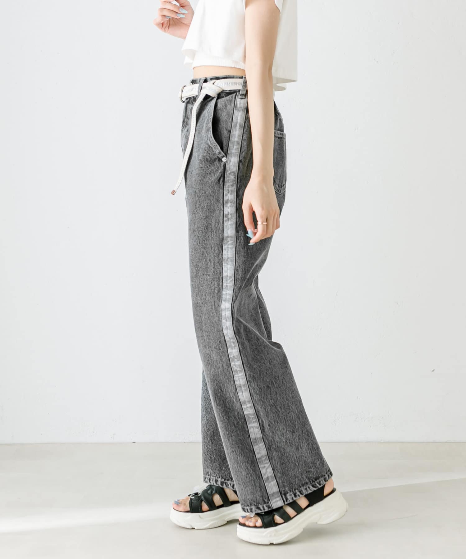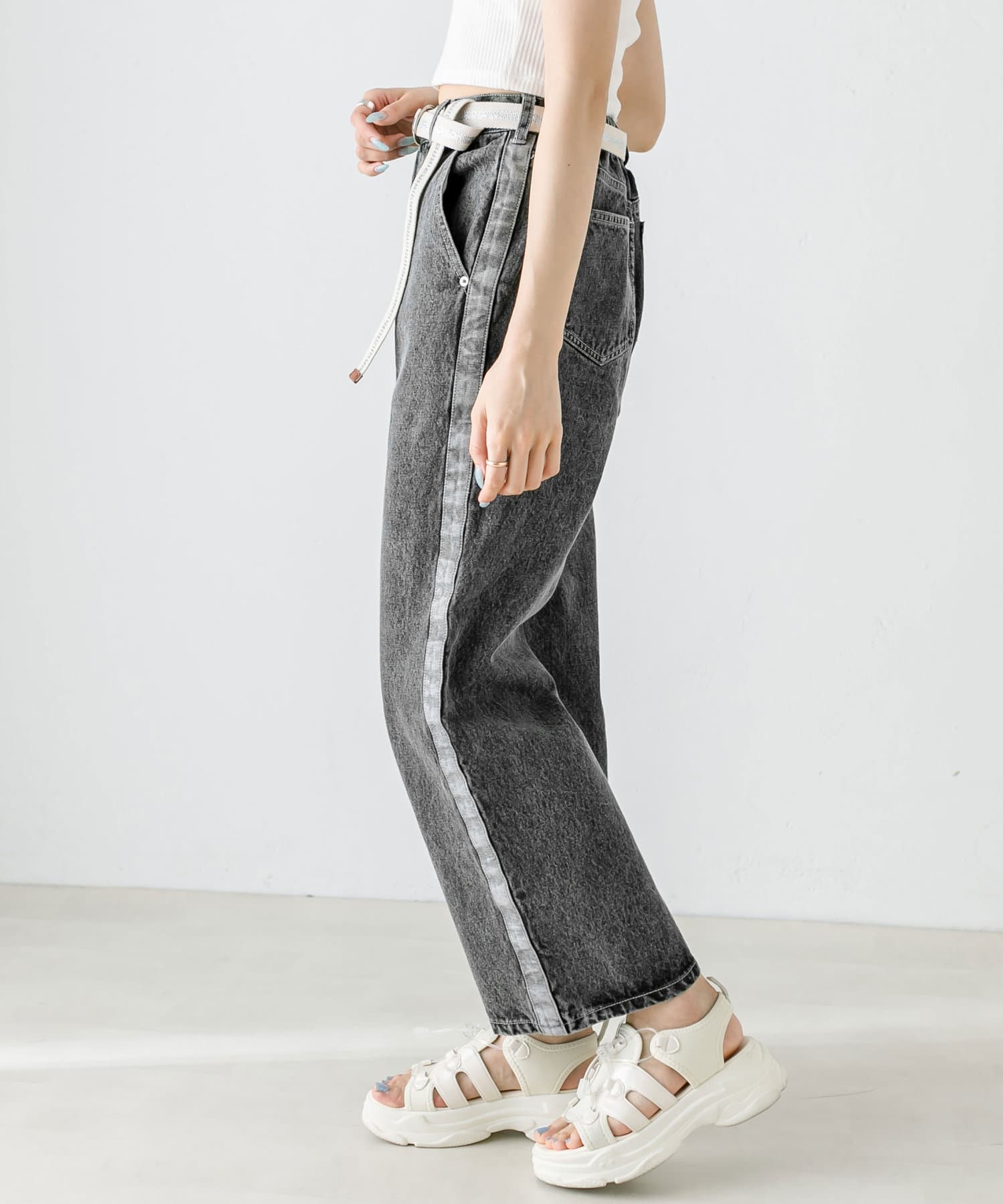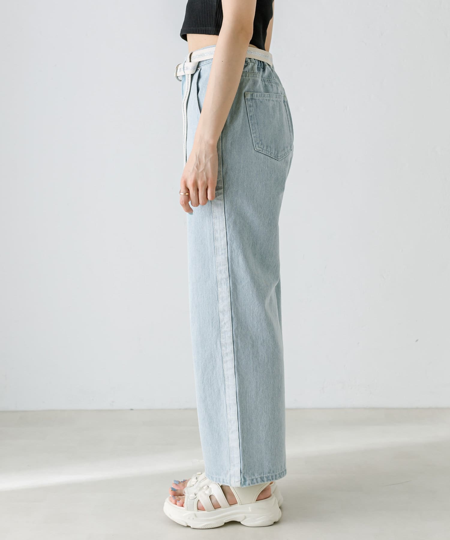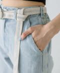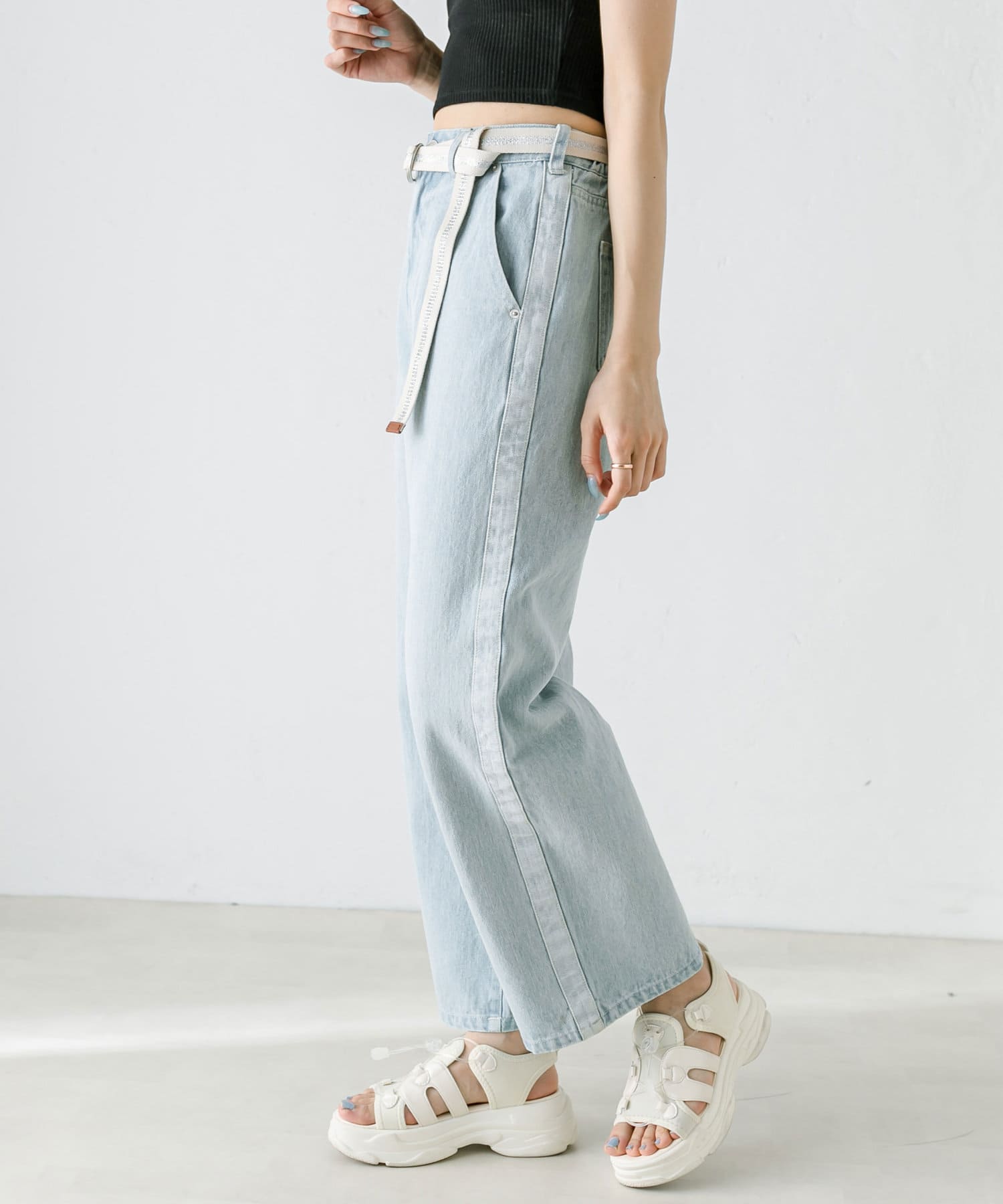 【S/Mサイズあり】ベルト付きサイドラインデニムパンツ