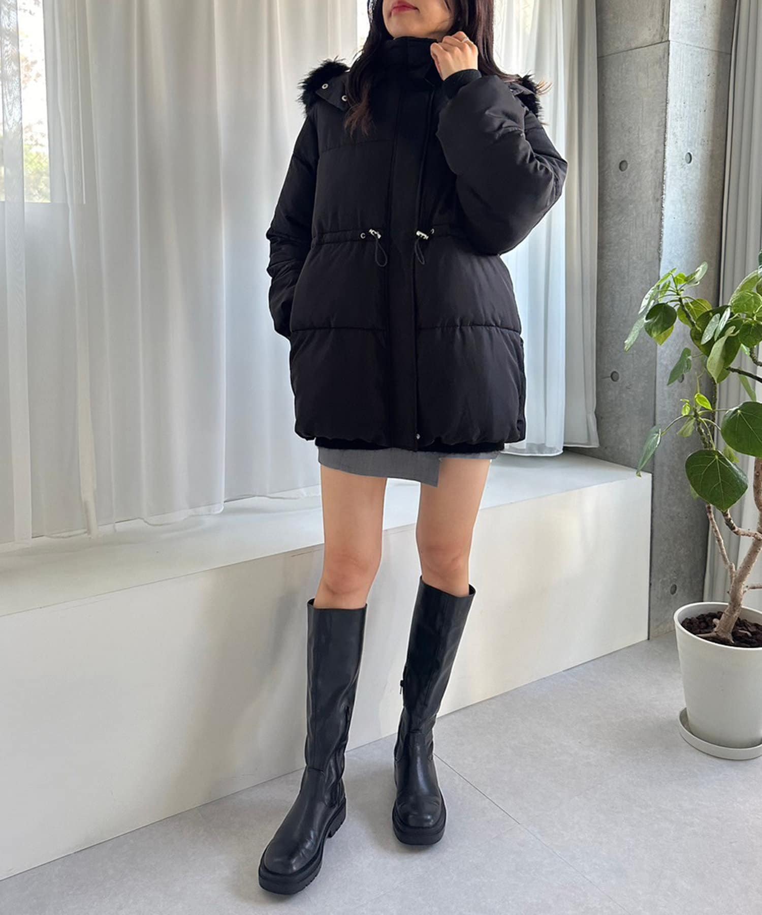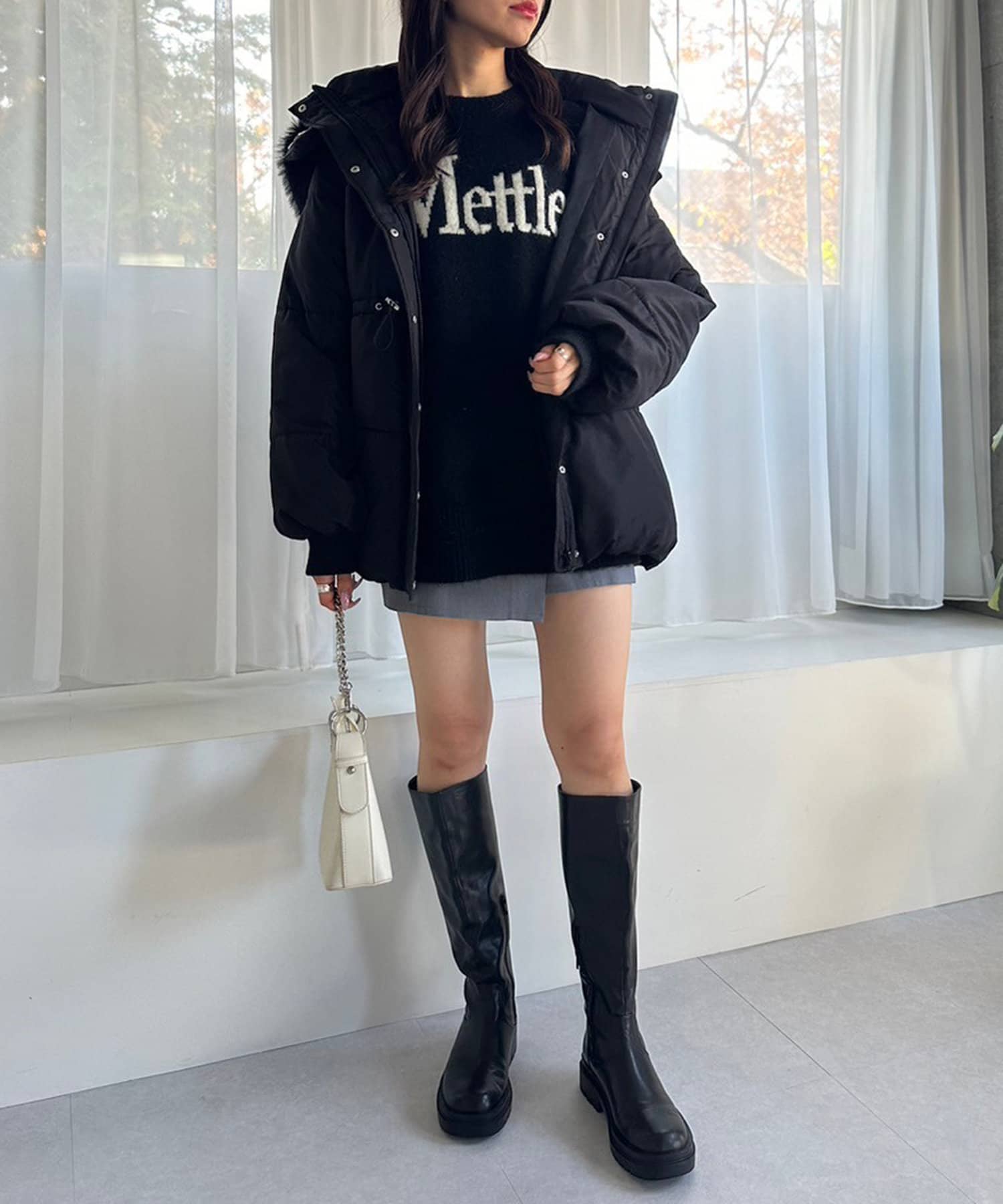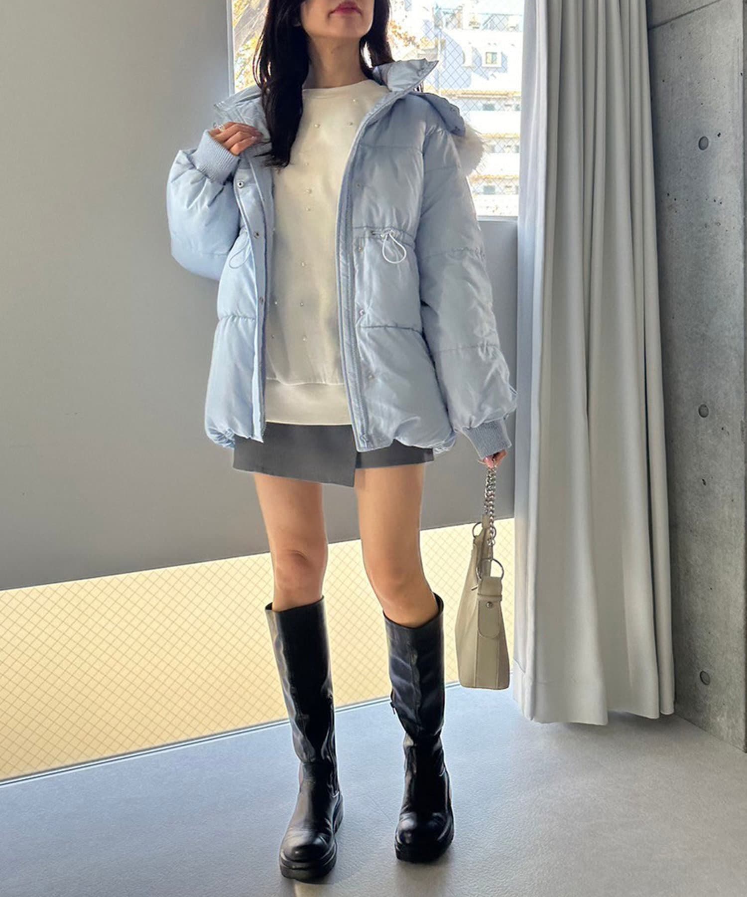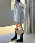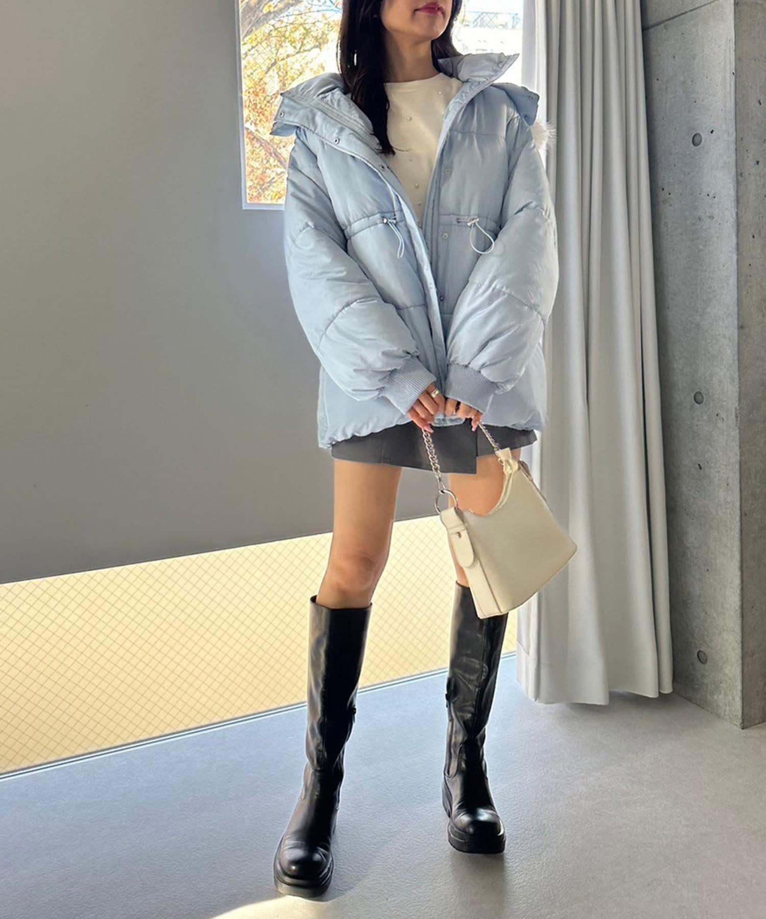 ・ミニボトムにロングブーツを合わせると相性抜群。