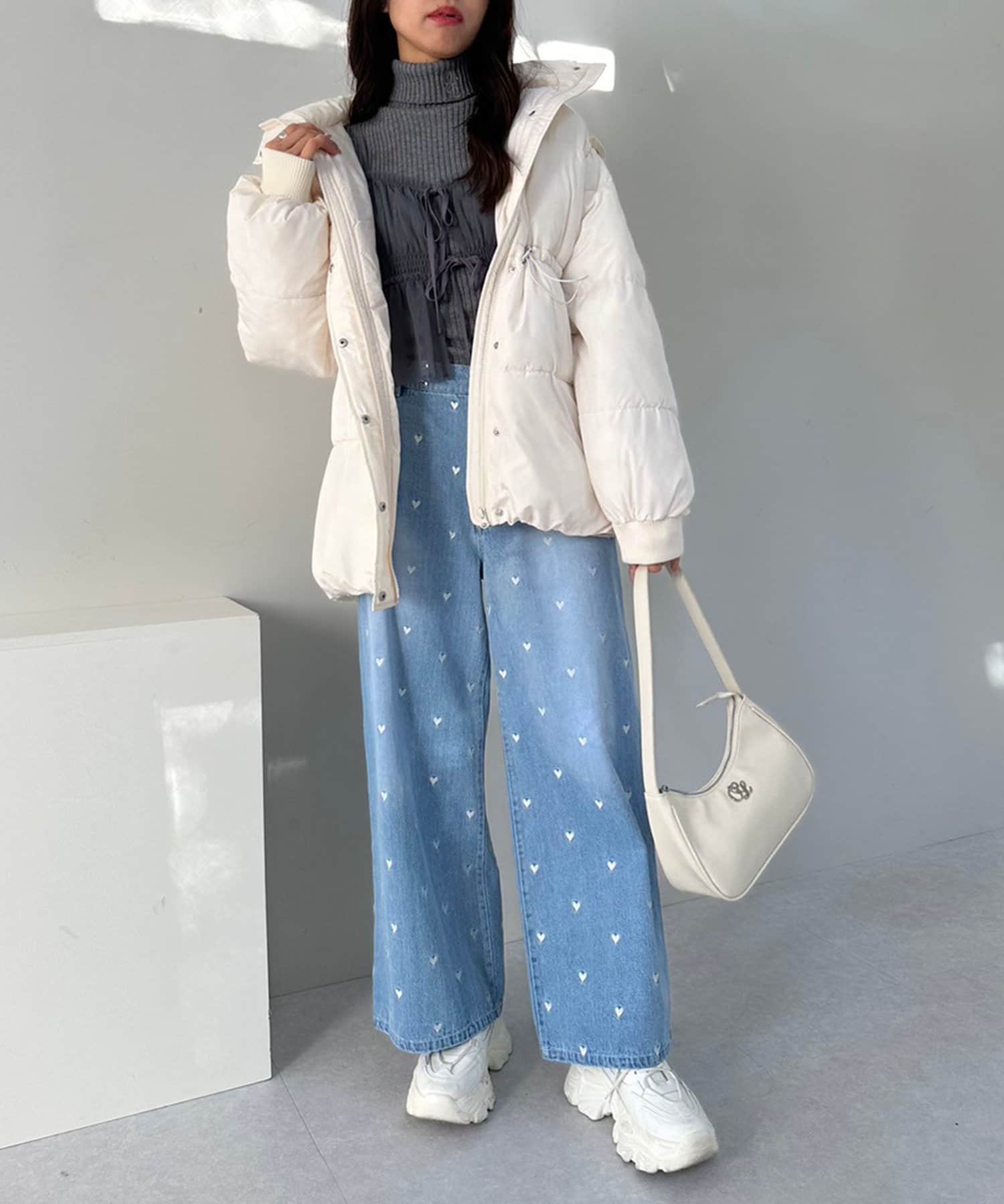 ・トレンドのカーゴパンツやデニムを合わせたカジュアルなスタイリングもおすすめ。