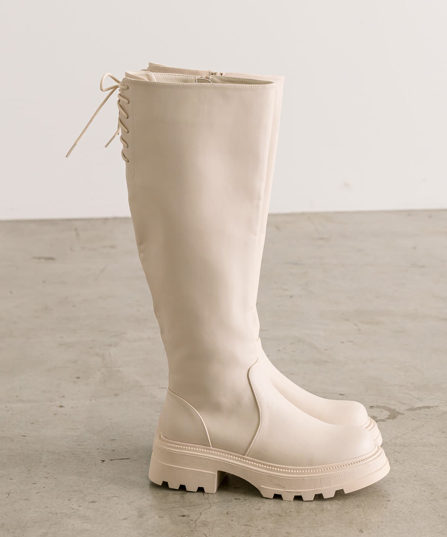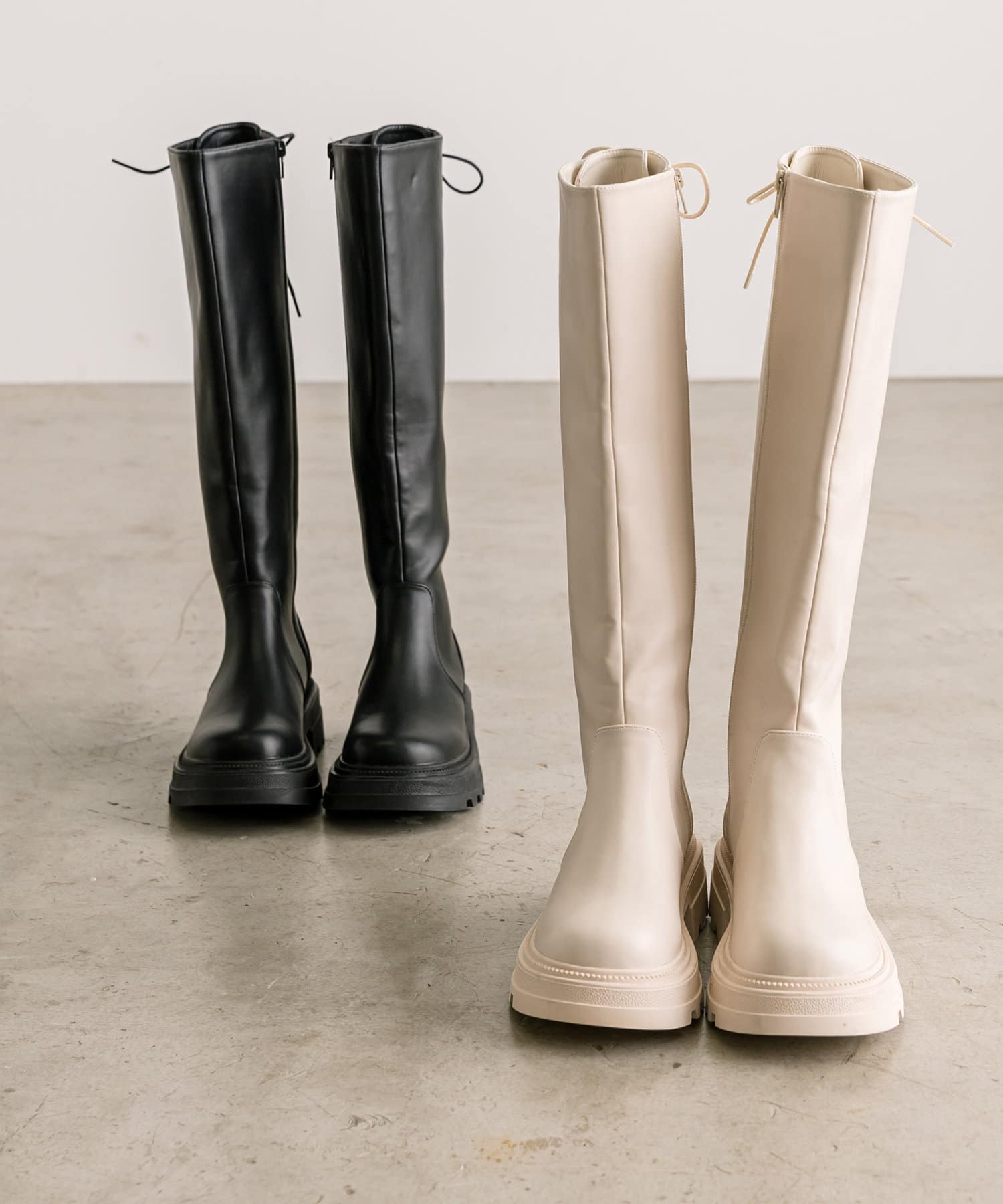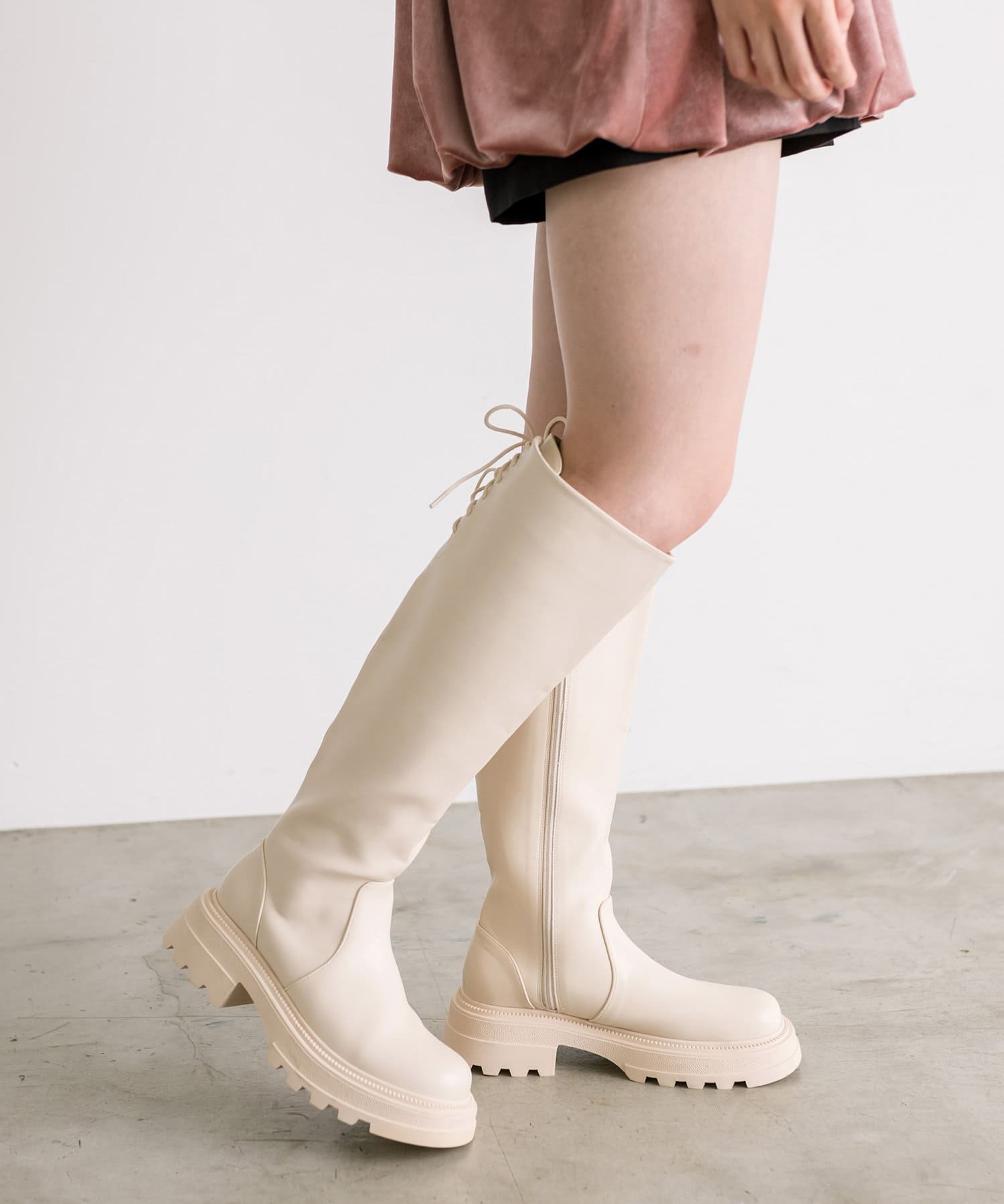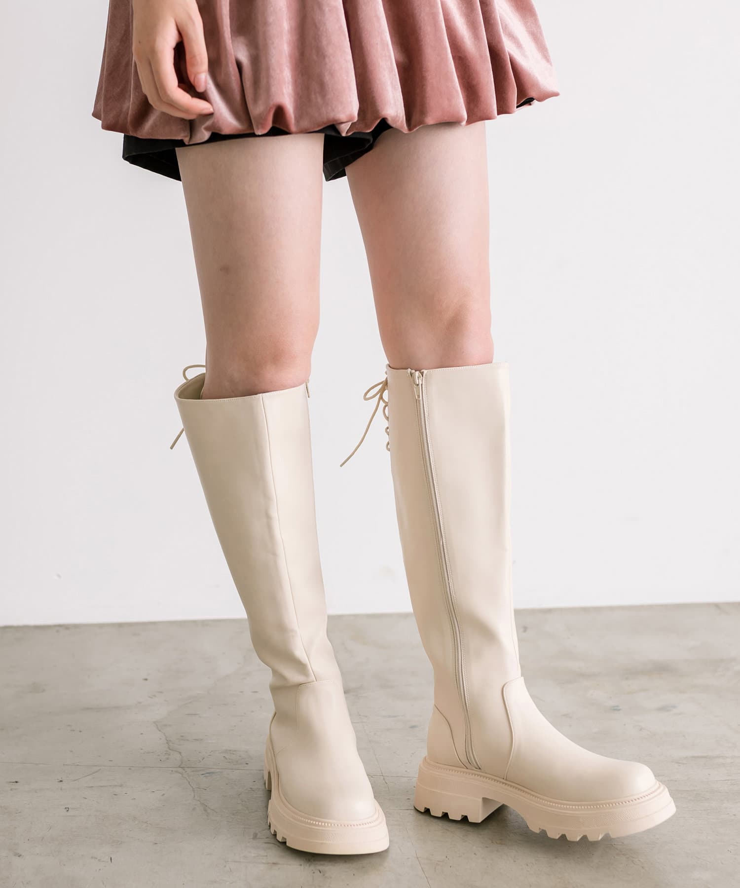 秋服、秋コーデ、冬服、冬コーデ、ロングブーツ、厚底シューズ、厚底ブーツ、タンクソール、韓国ファッション、韓国コーデ、バックリボン、レースアップ