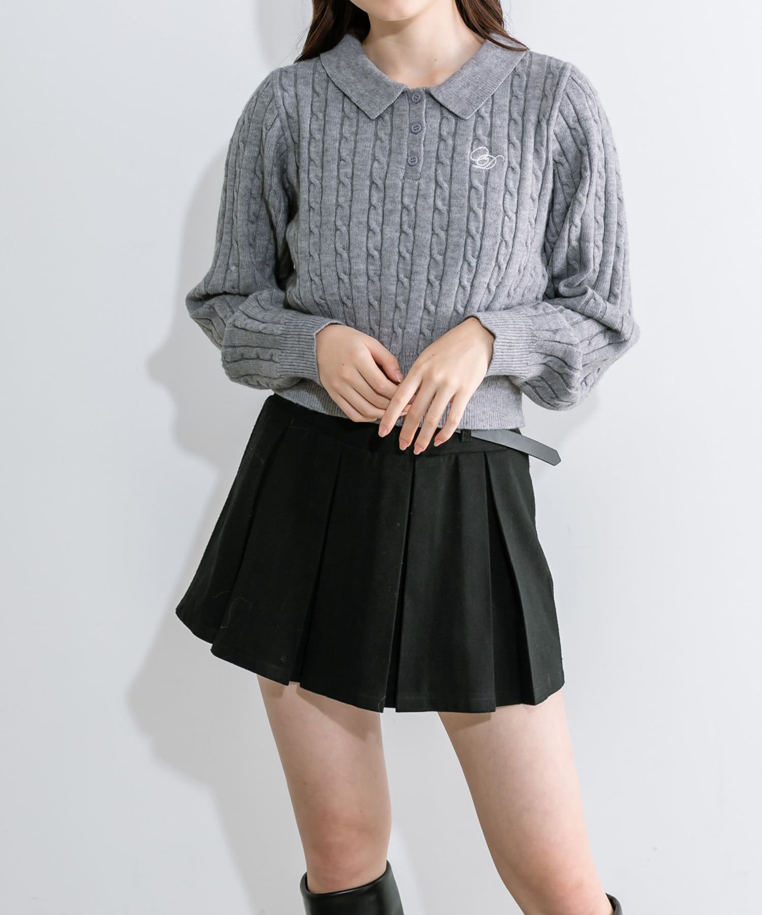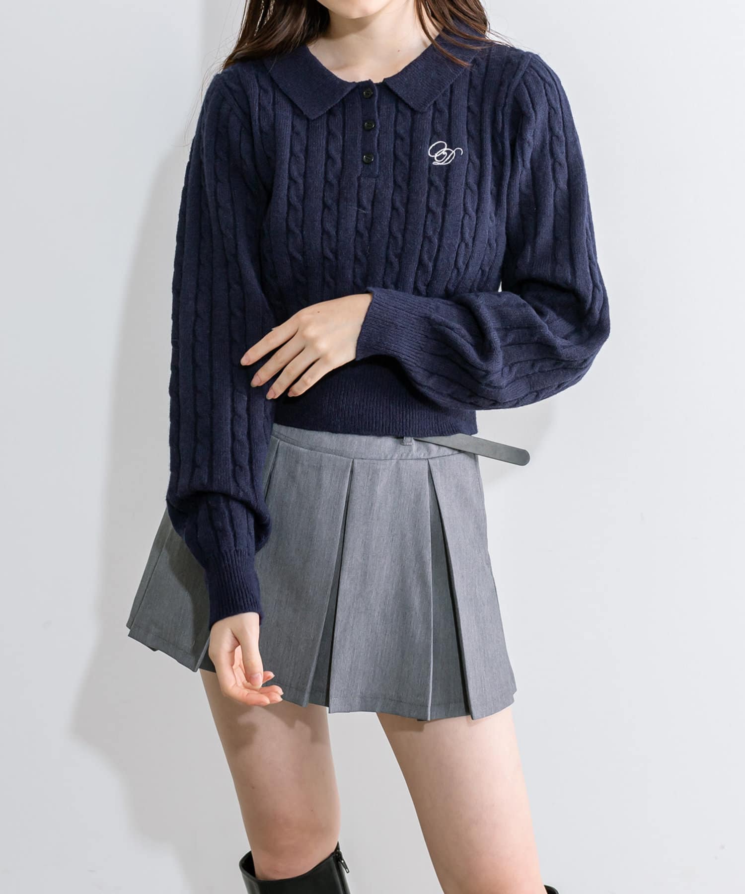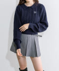 ・ケーブルニットで合わせると旬なプレッピーなスタイリングに。