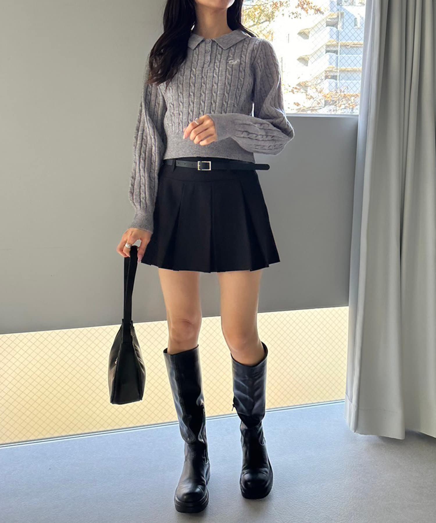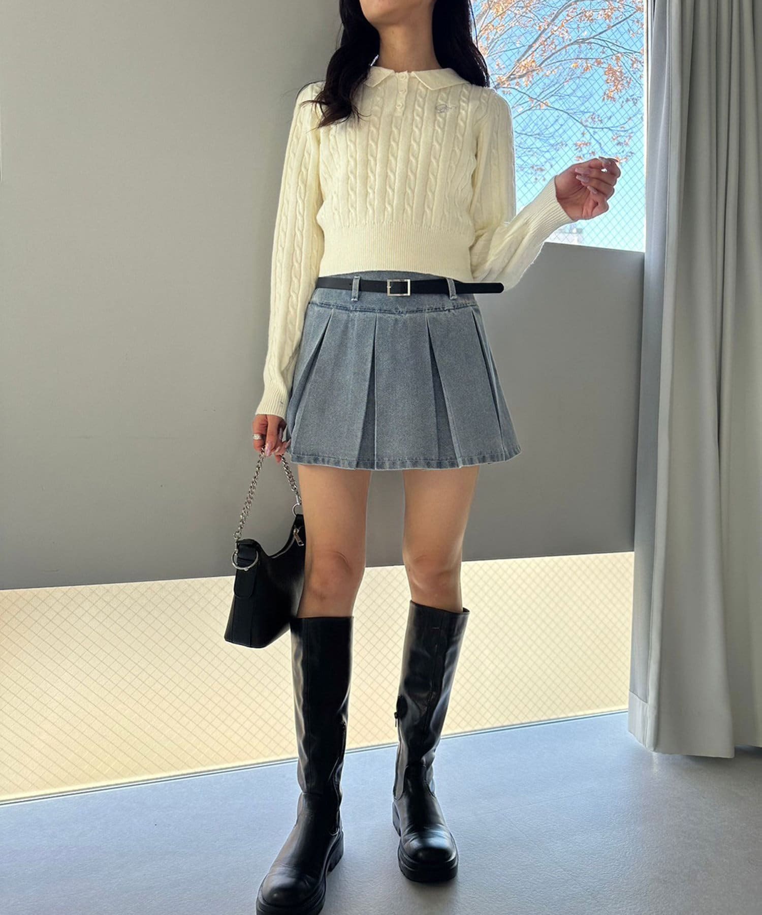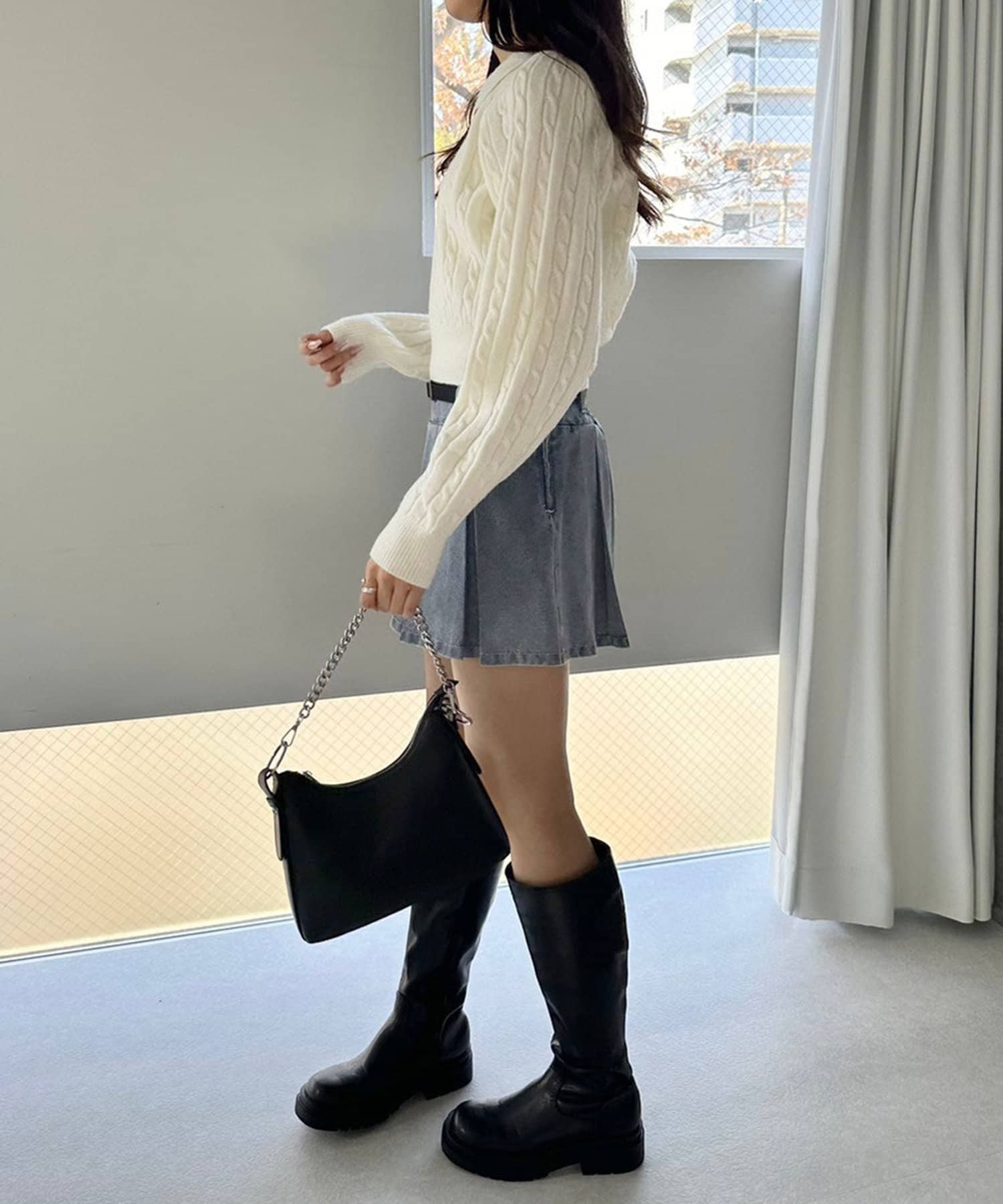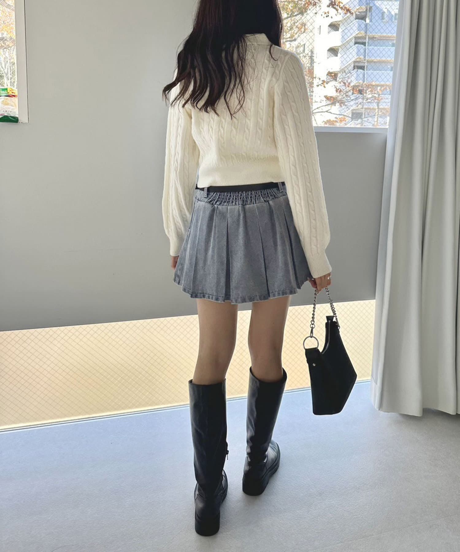 ・クロップド丈のニットやハーフジップトップスと合わせるのもおすすめ。
