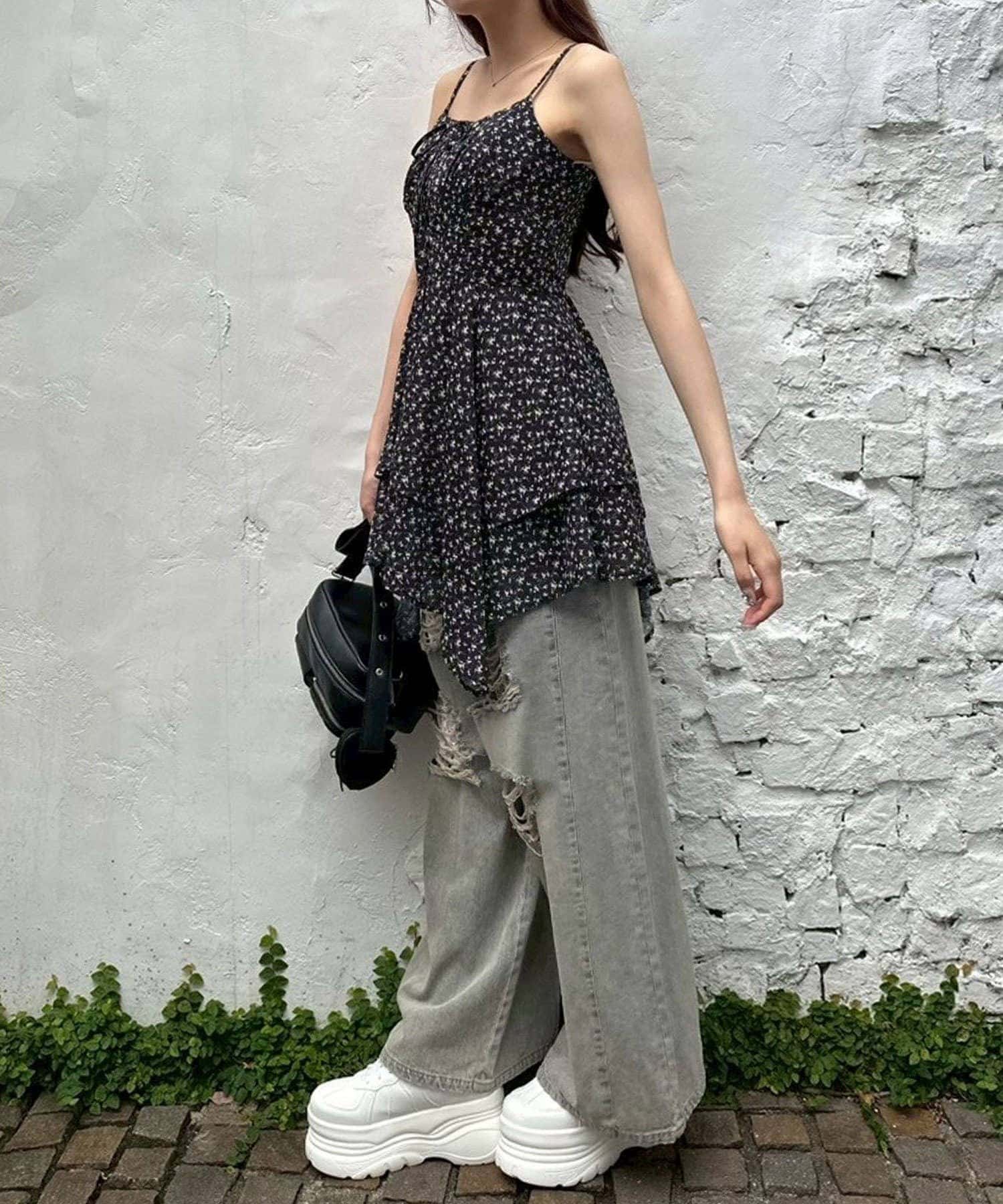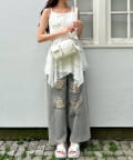 ・フロントに入ったダメージの裏側には、花柄のレース生地が覗いて甘さをプラスしたデザイン。