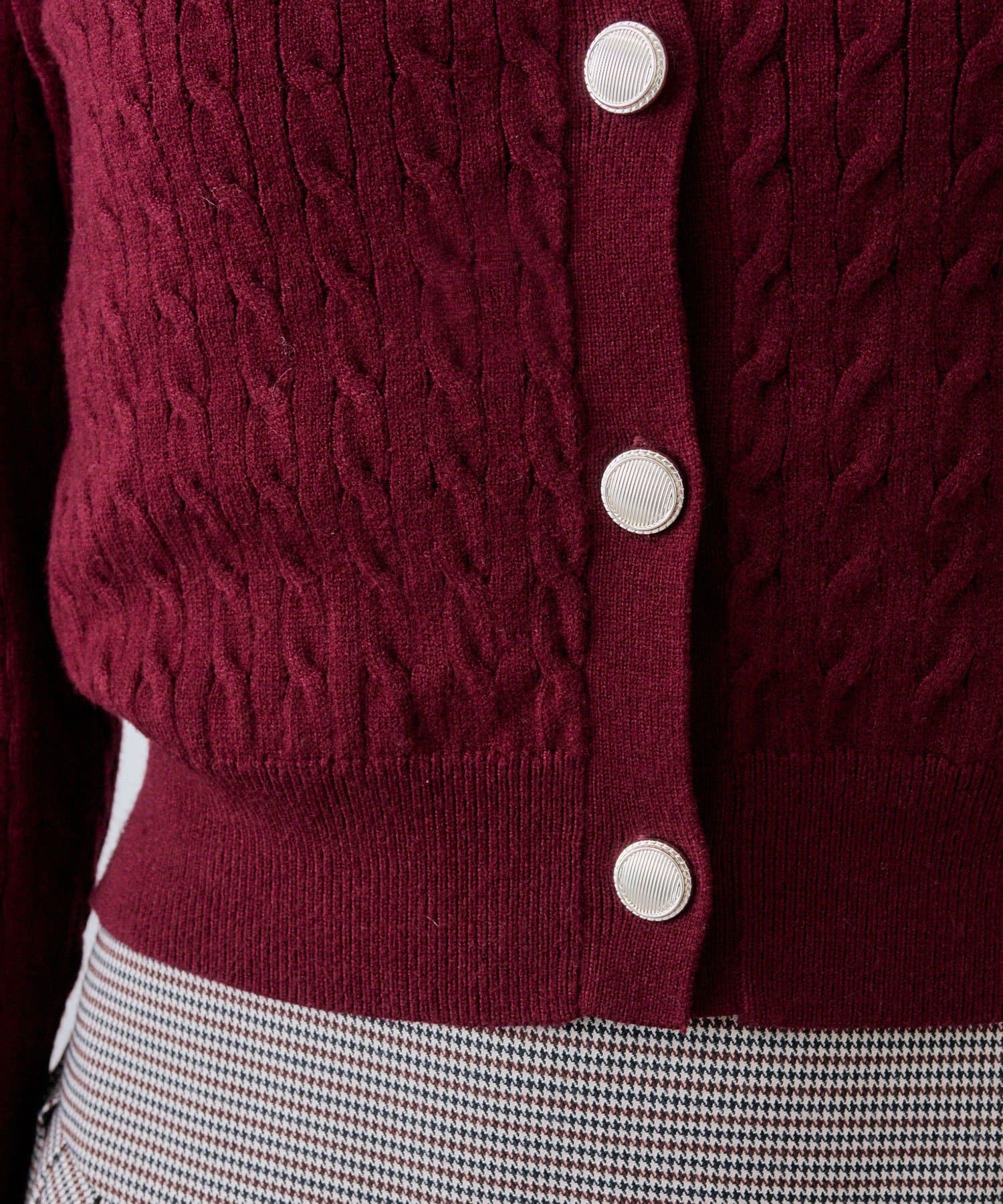 ・立体感のあるケーブル編みにゴールドボタン付きで、高見えするデザインです。