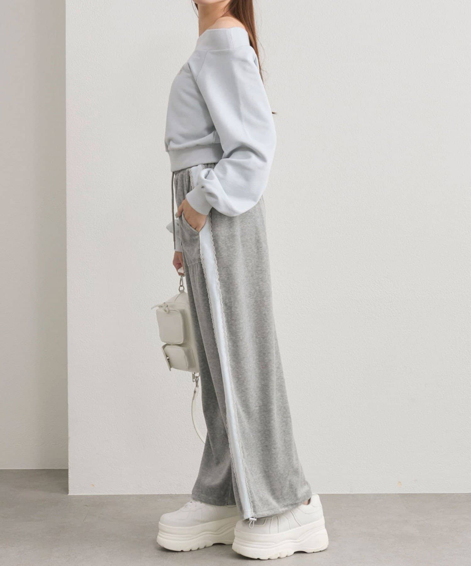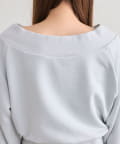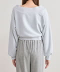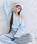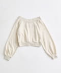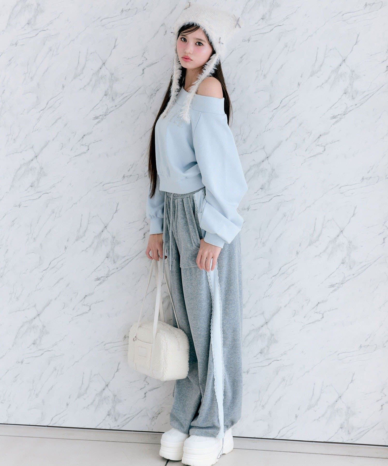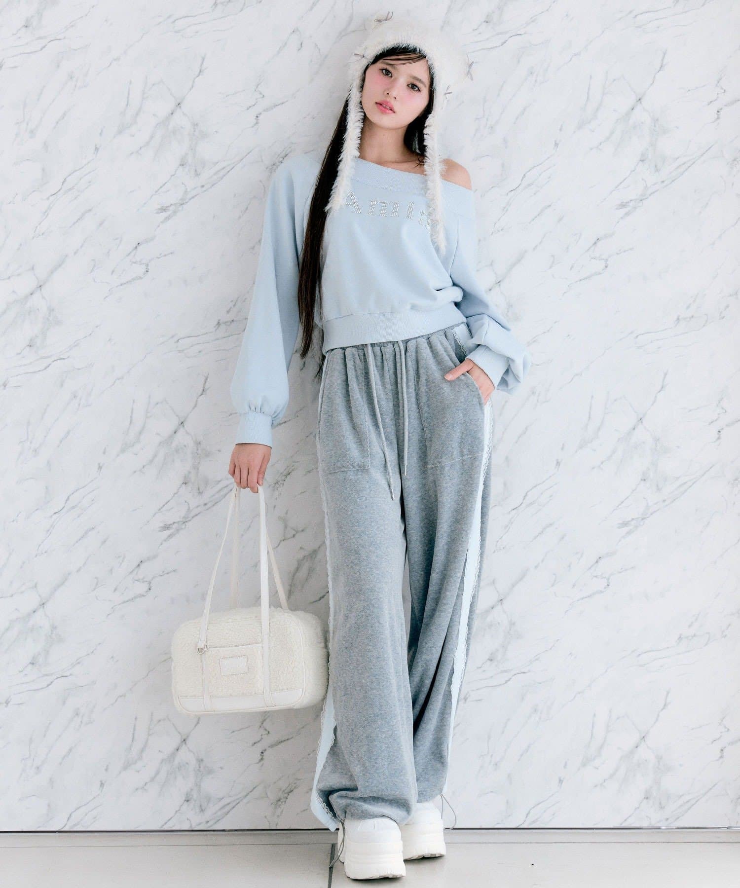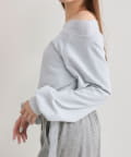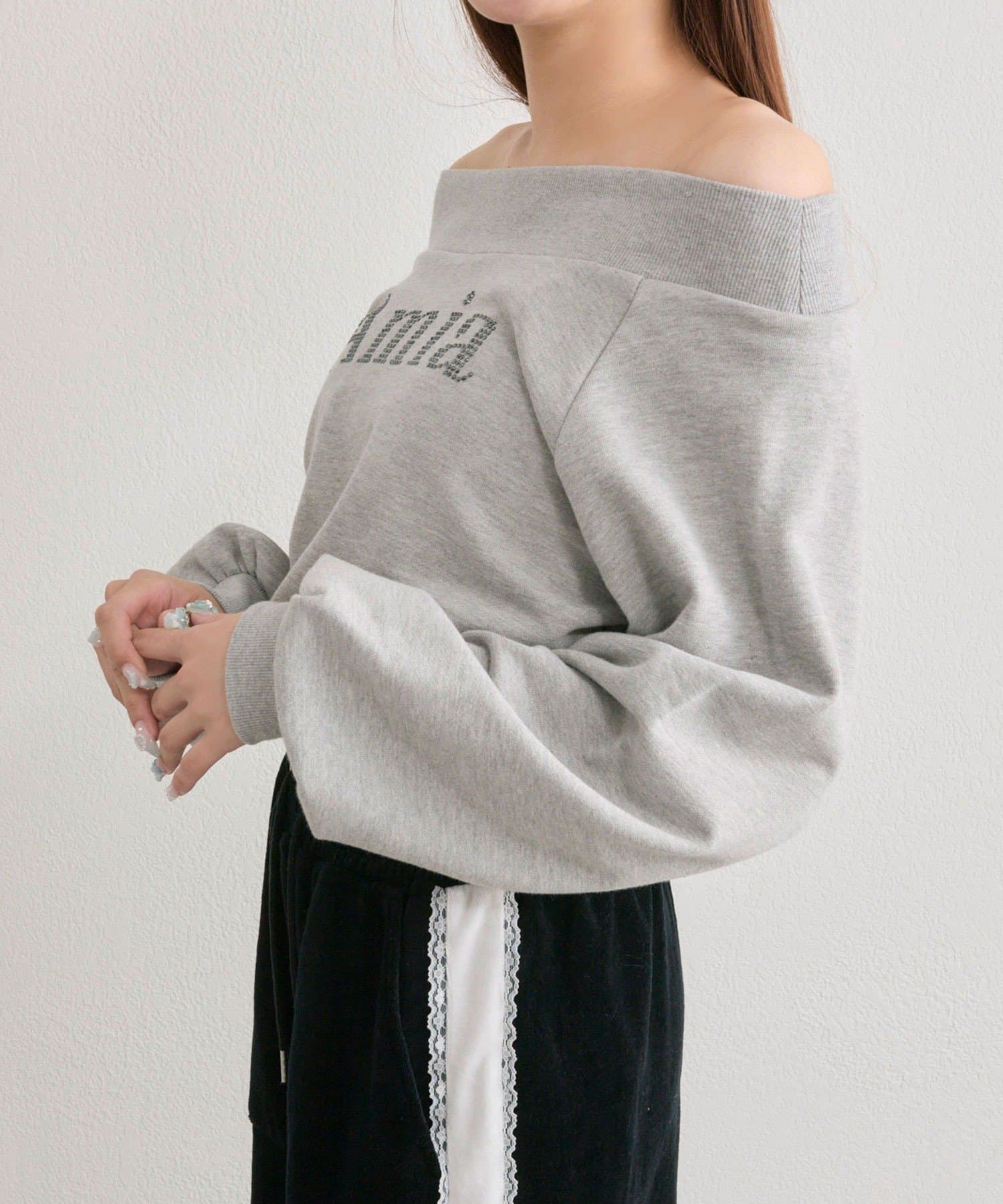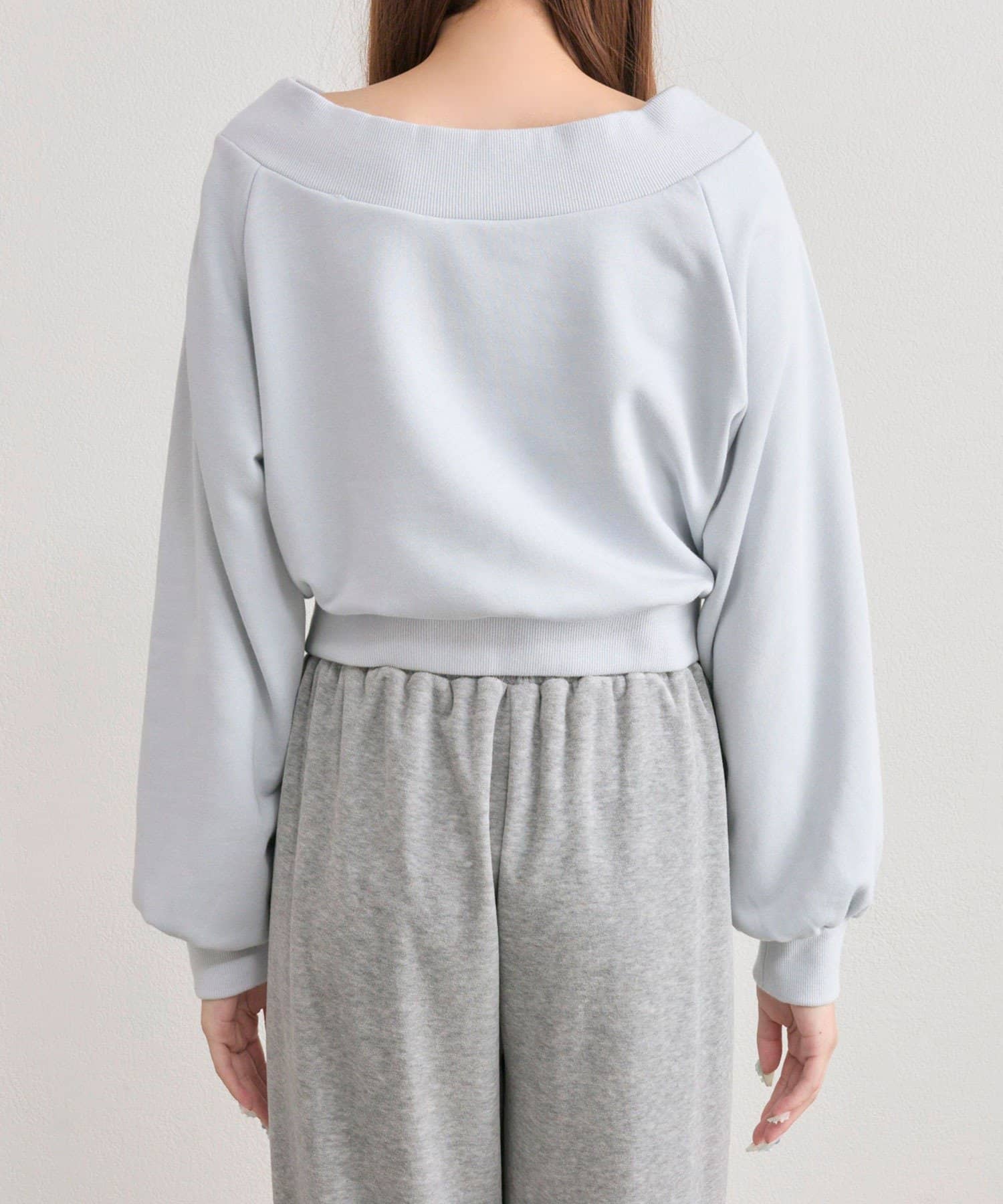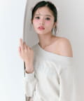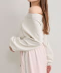 ・カジュアルなスウェットを女性らしく着こなせるオフショルデザイン。