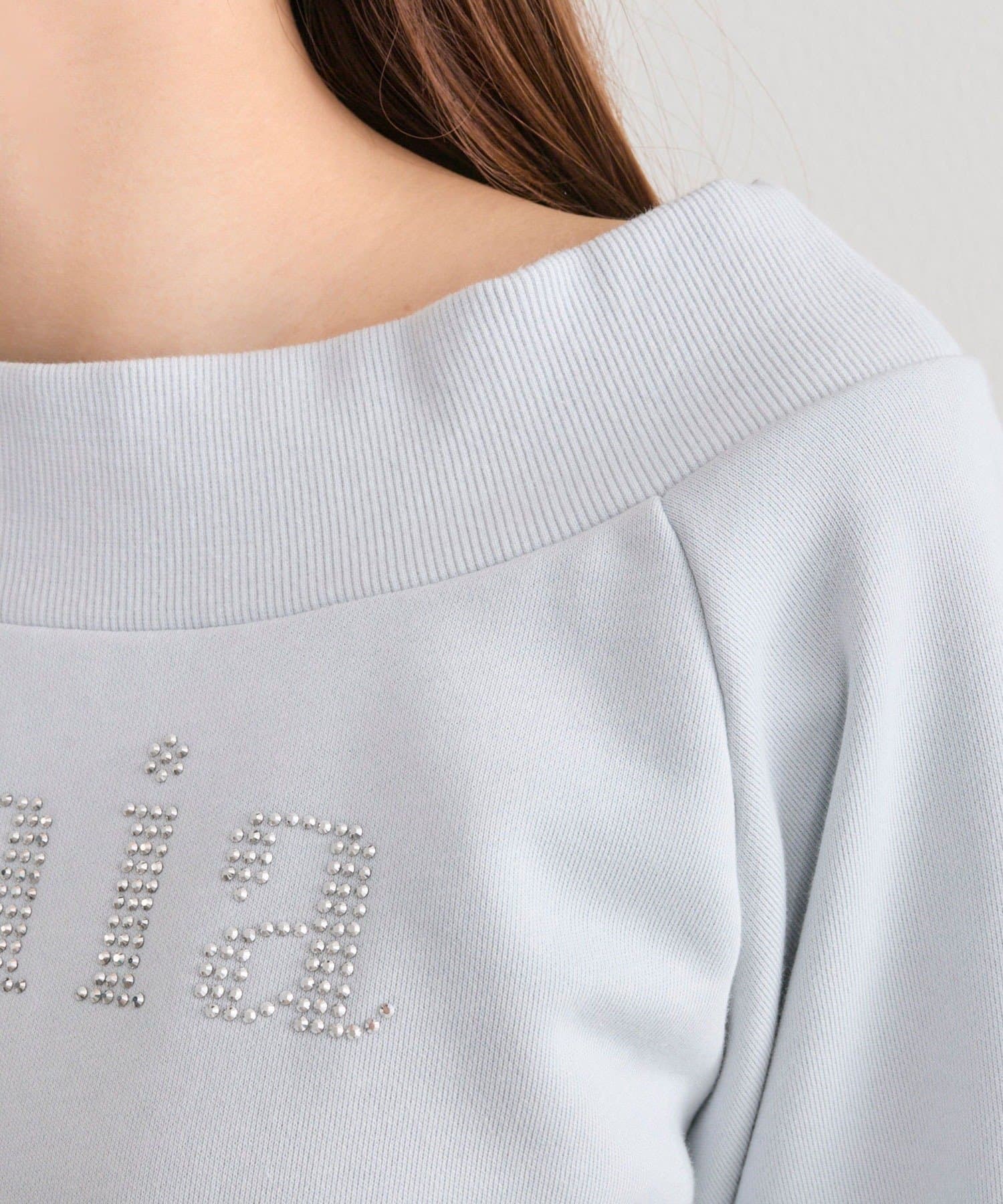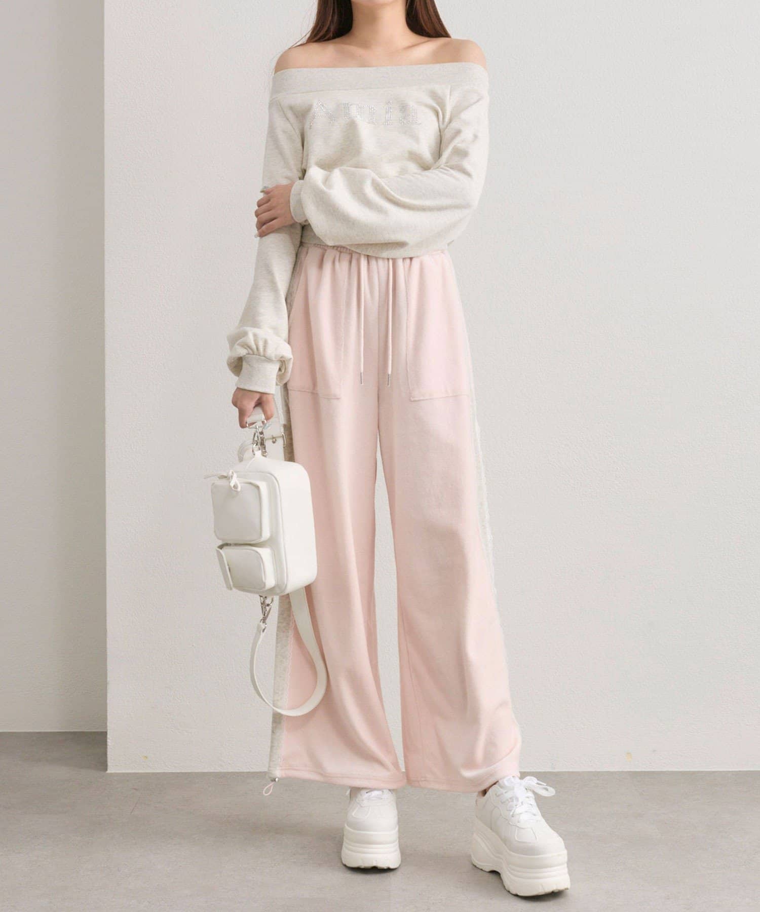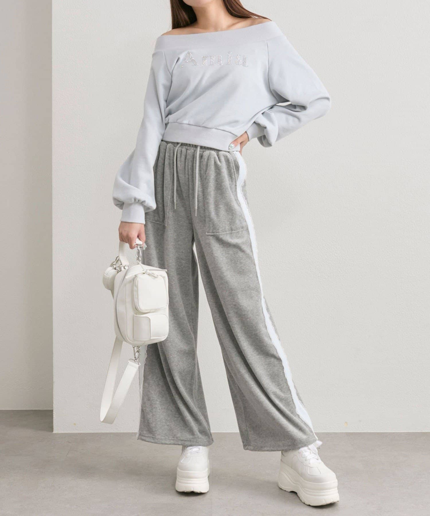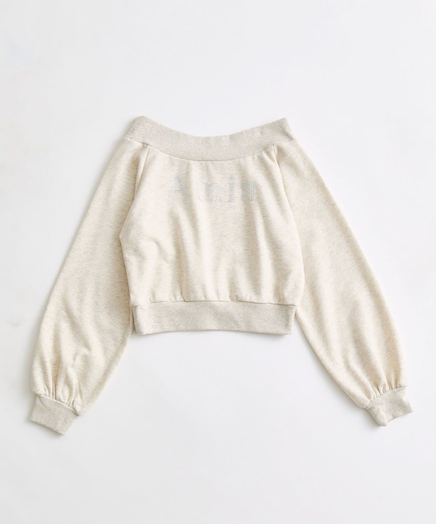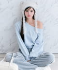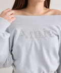 ・カジュアルなスウェットを女性らしく着こなせるオフショルデザイン。