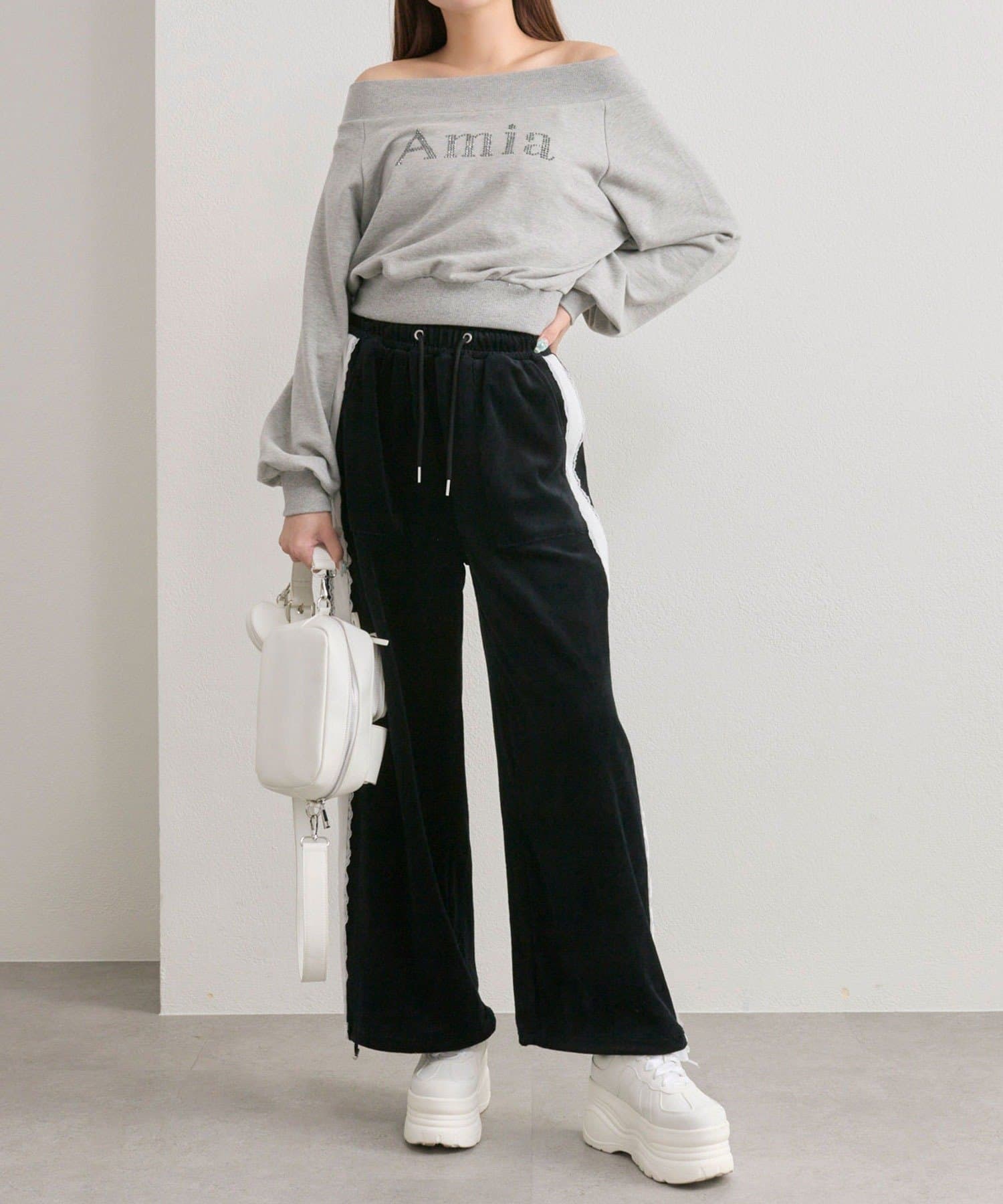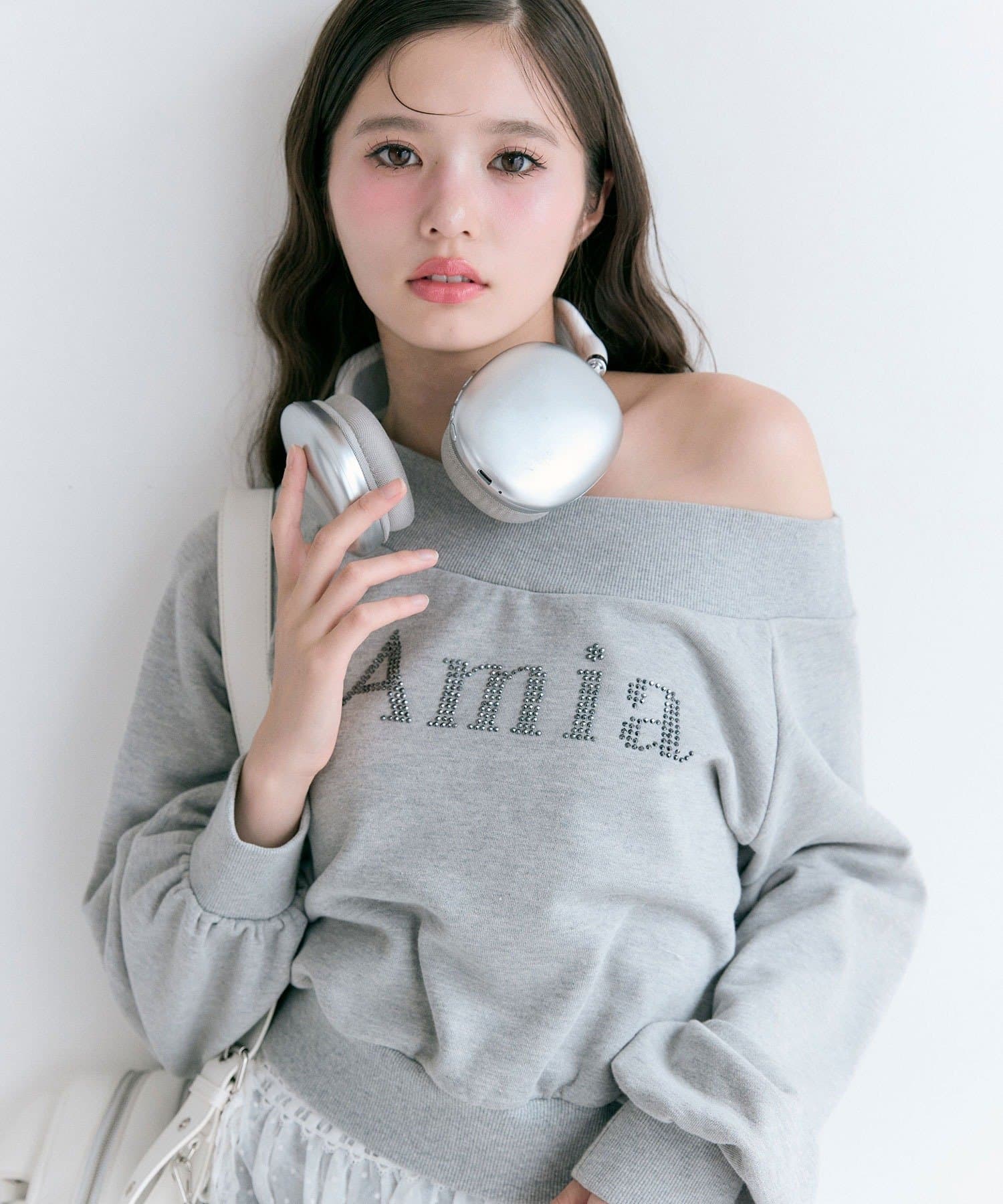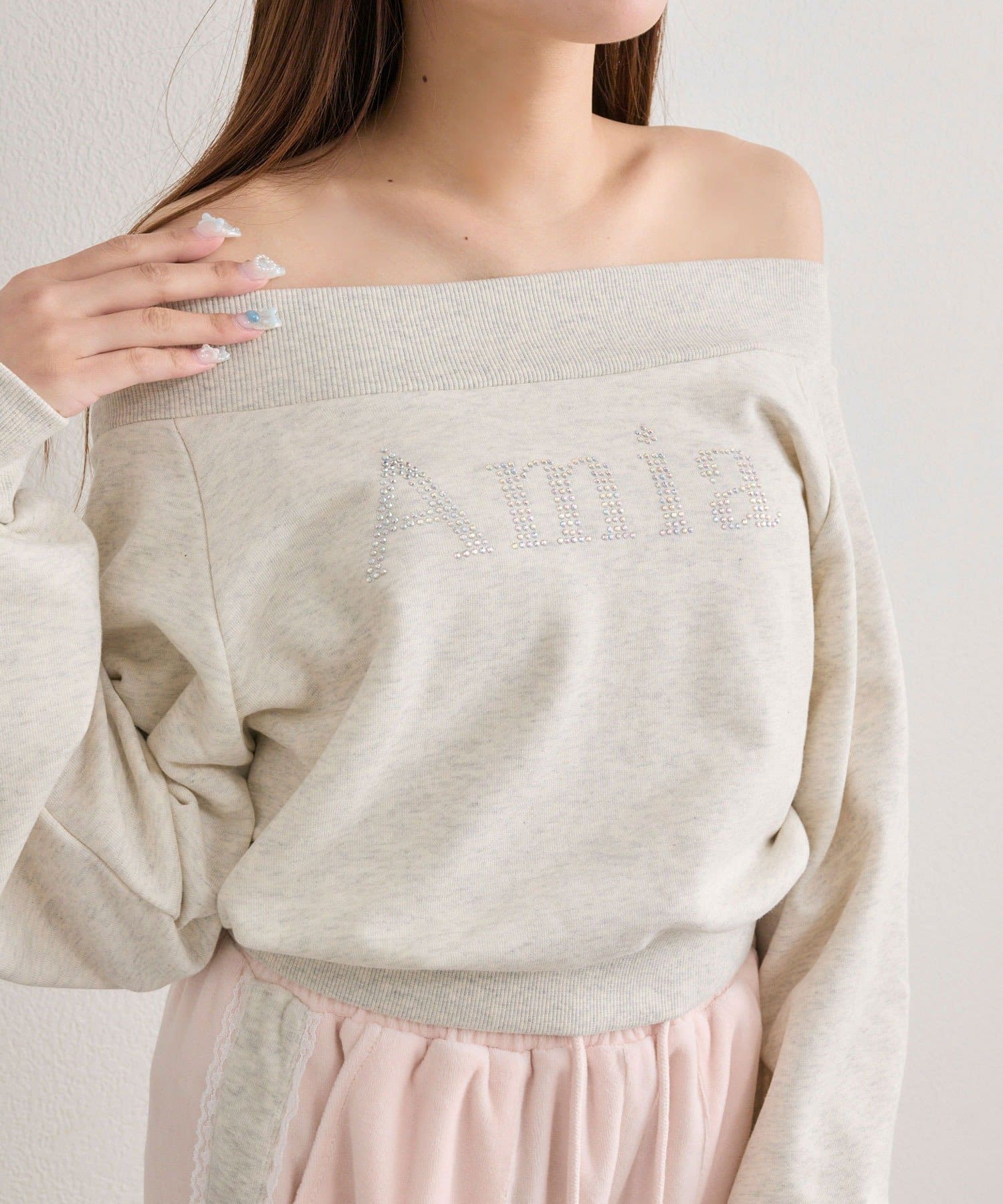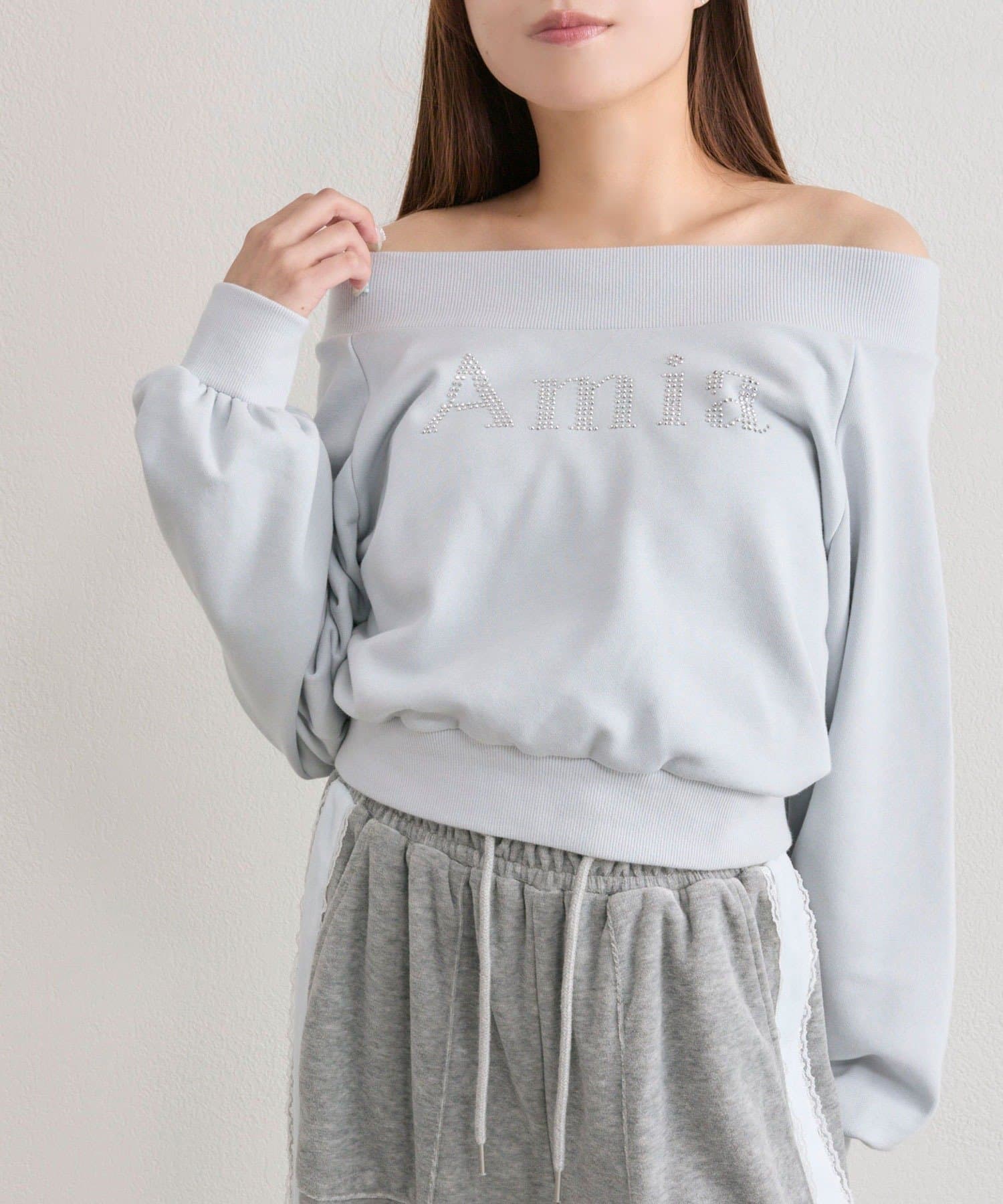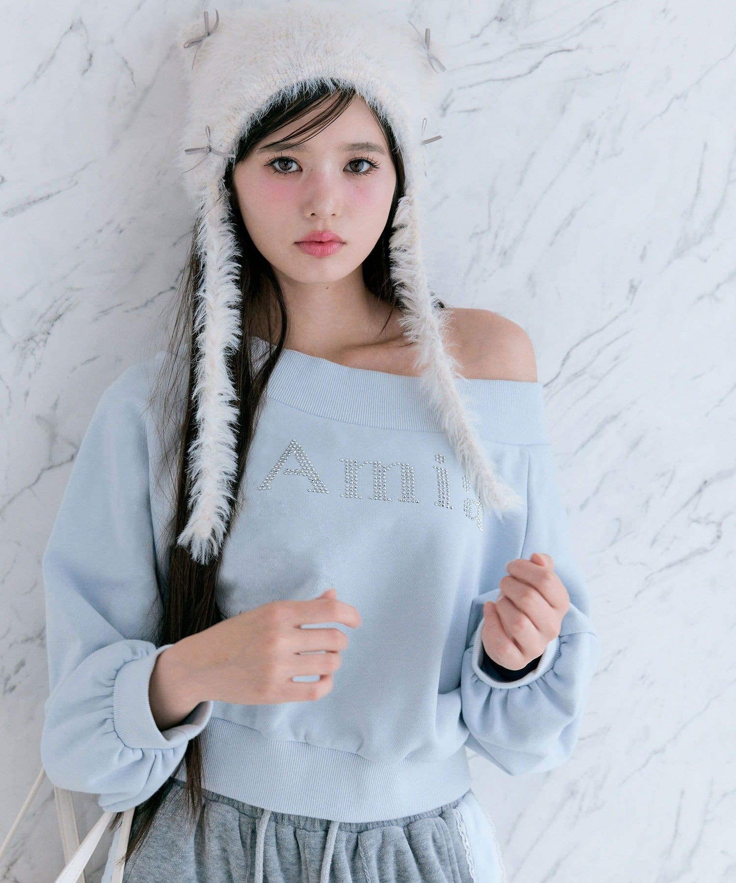 ・カジュアルなスウェットを女性らしく着こなせるオフショルデザイン。