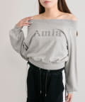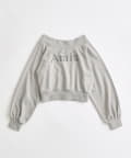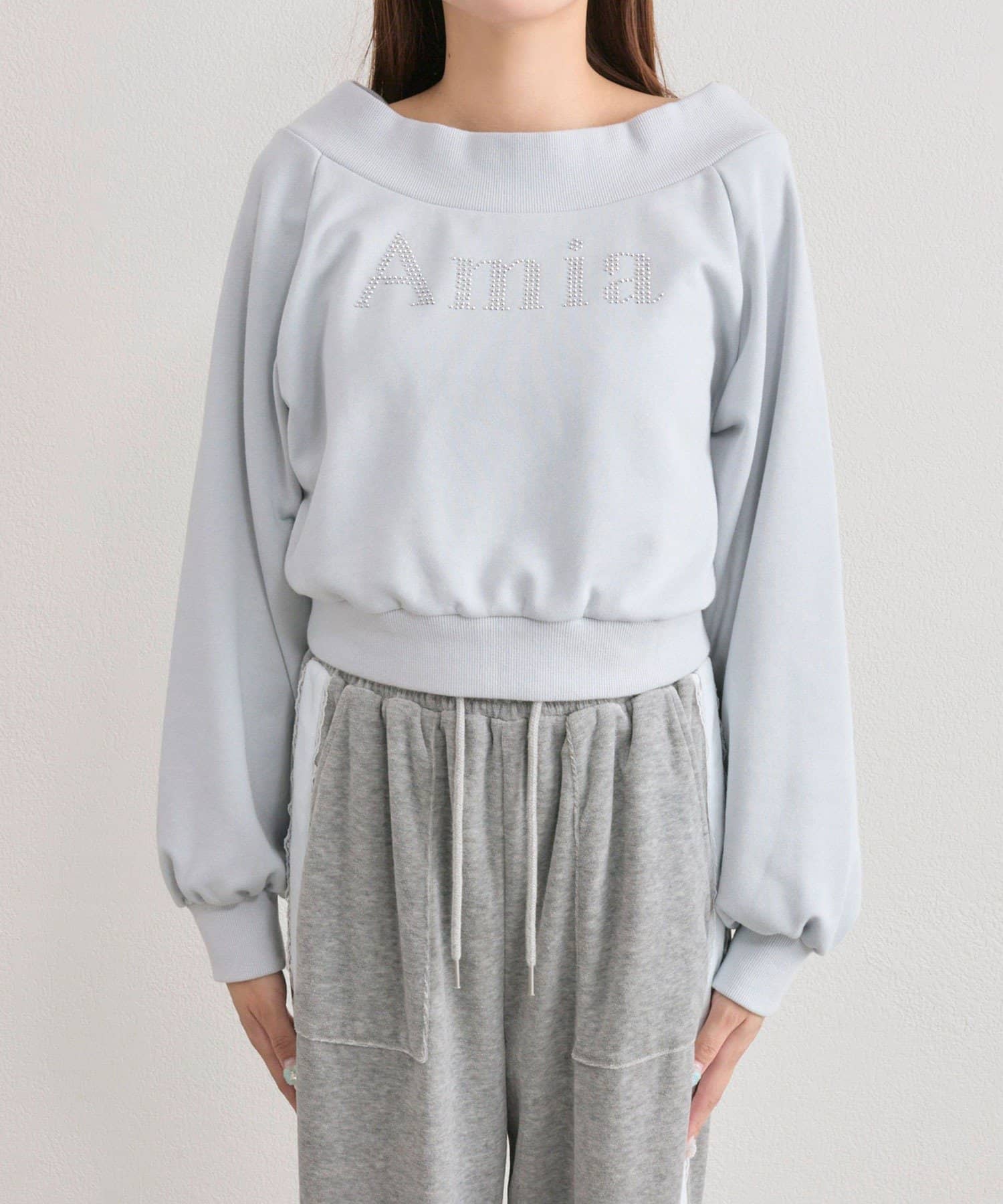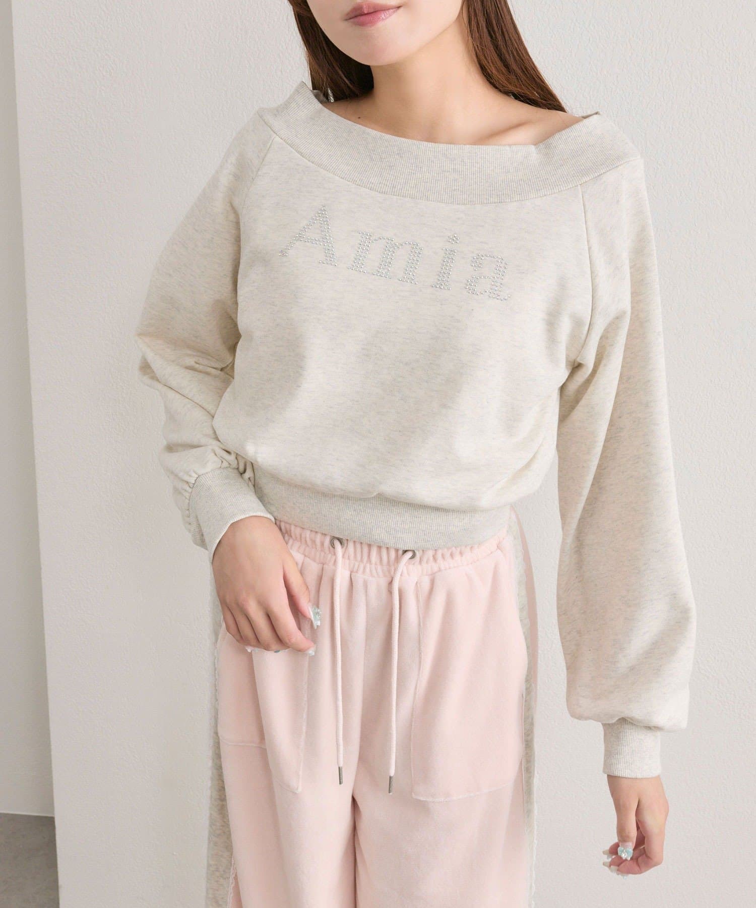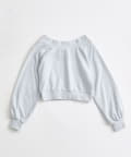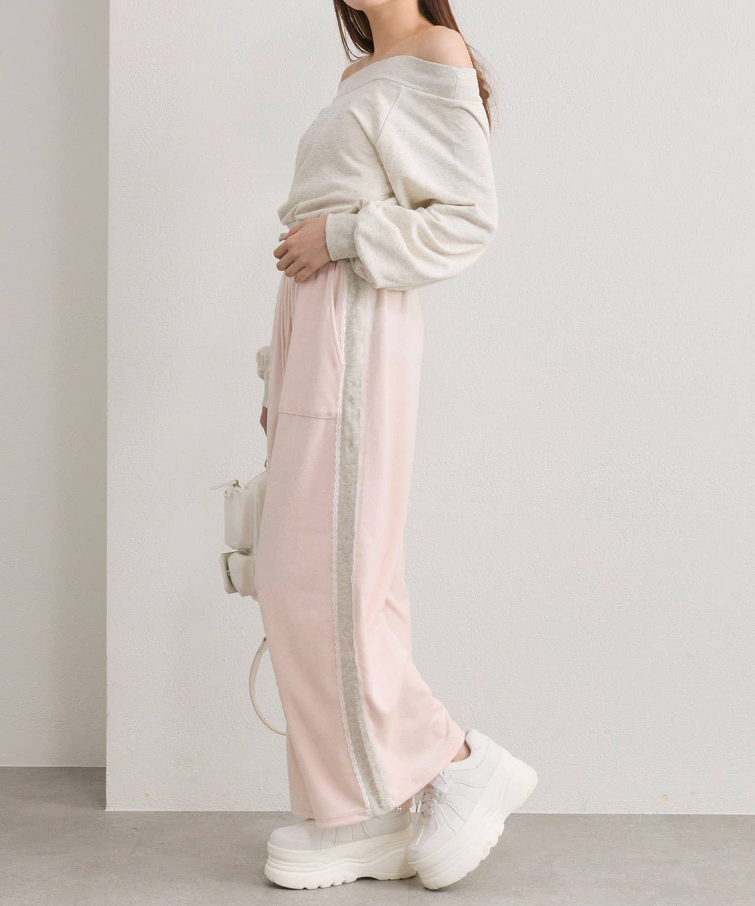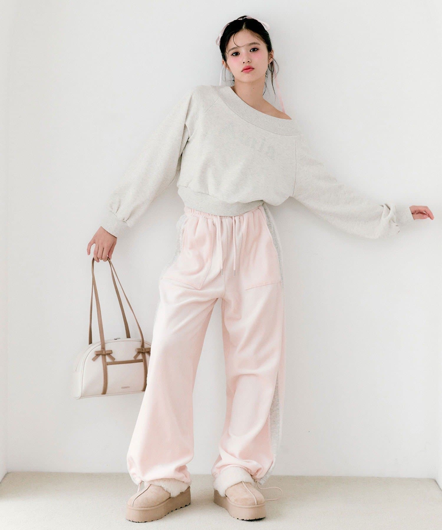 ・カジュアルなスウェットを女性らしく着こなせるオフショルデザイン。