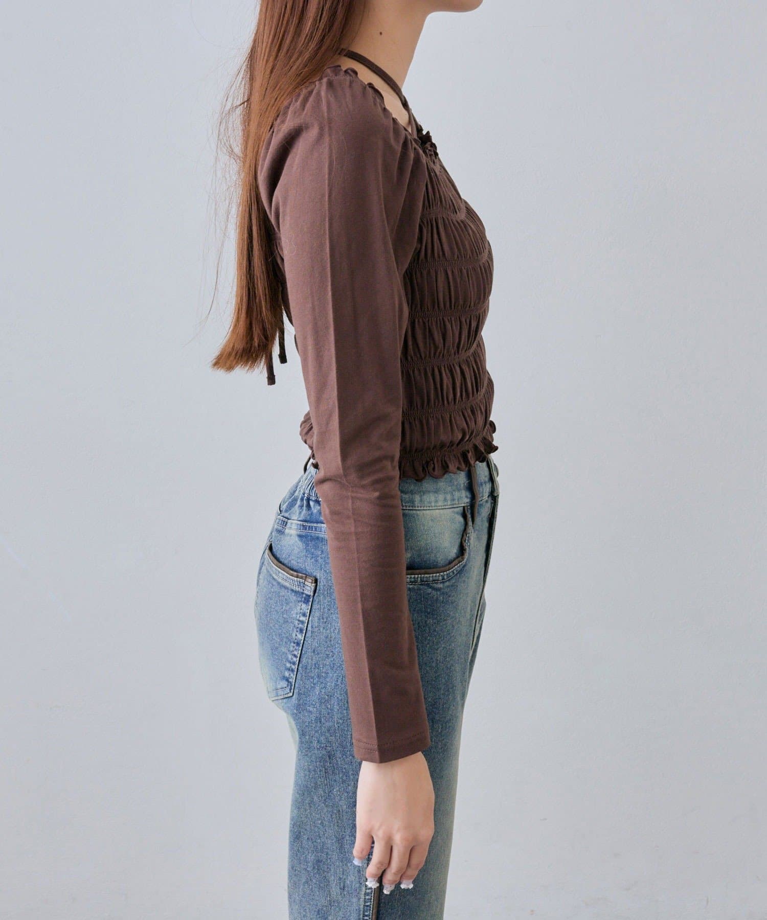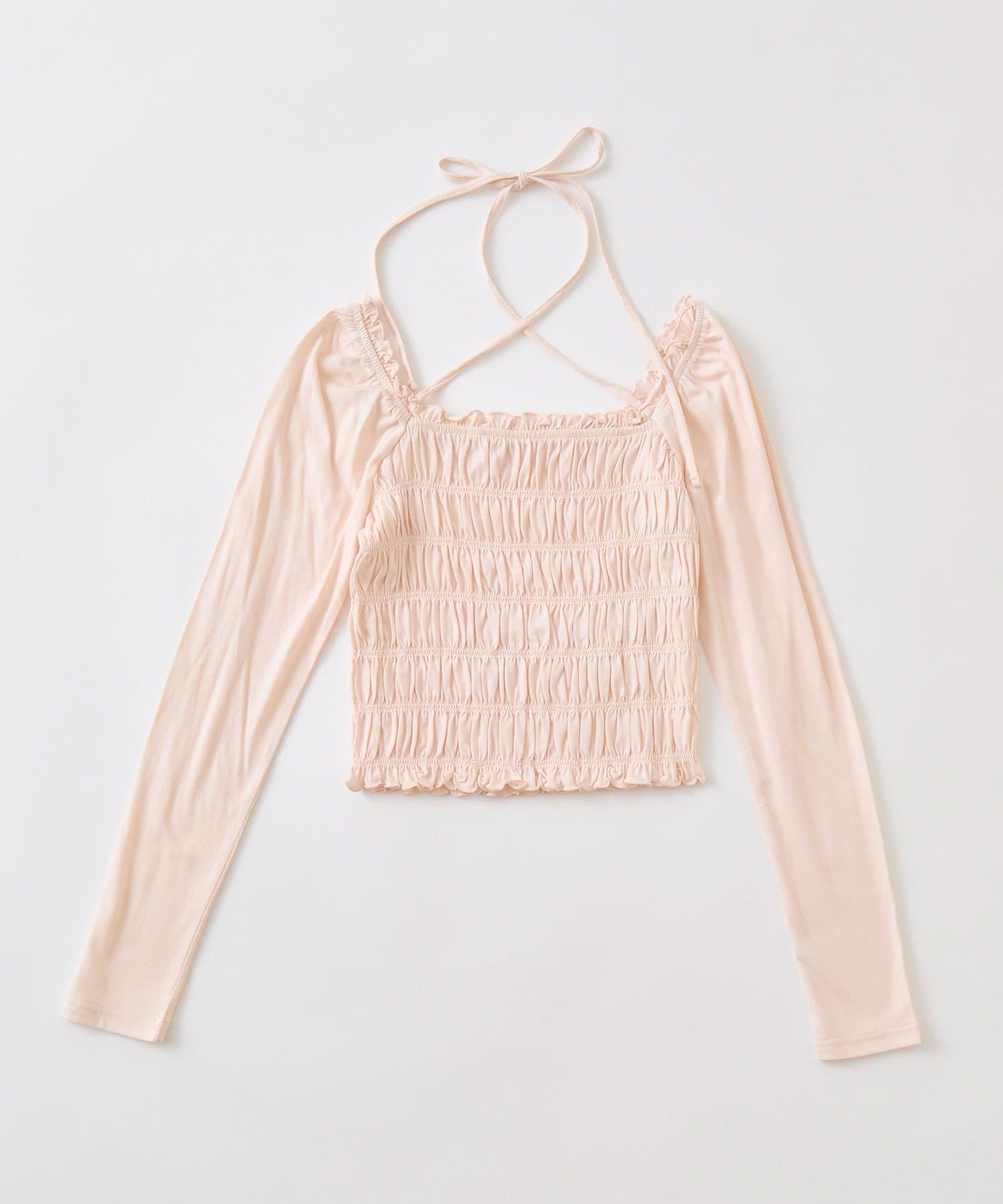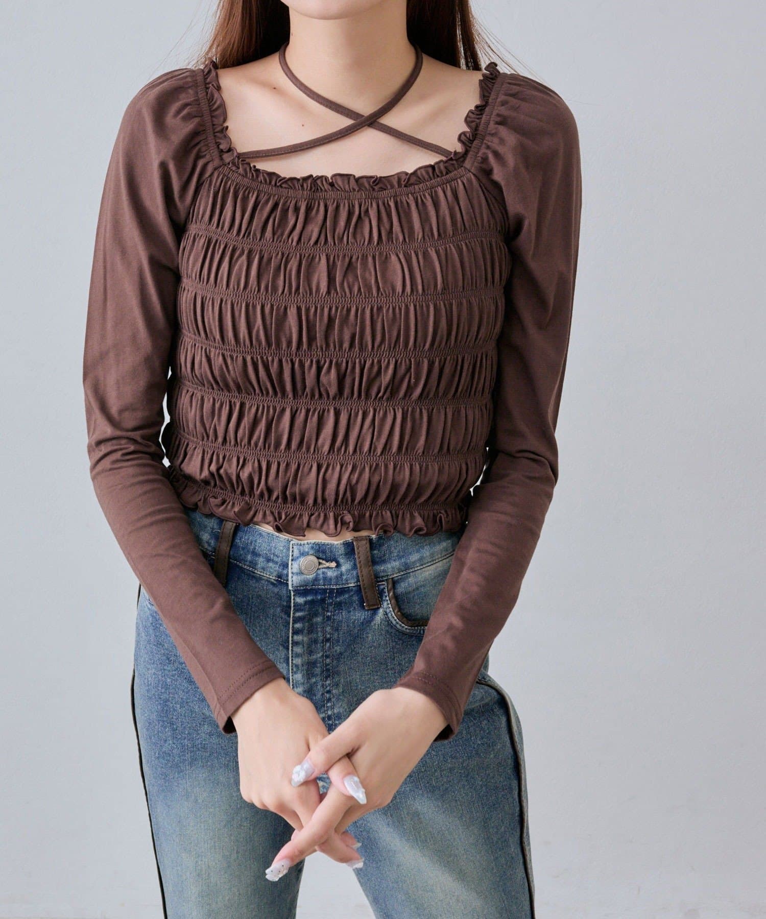 ・スクエアネックとホルターネック風ディテールで、女性らしい印象を演出します。