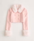 ・ふわふわのファーと大きなくるみボタンがかわいい、冬のシーズンムード高めるジャケット。