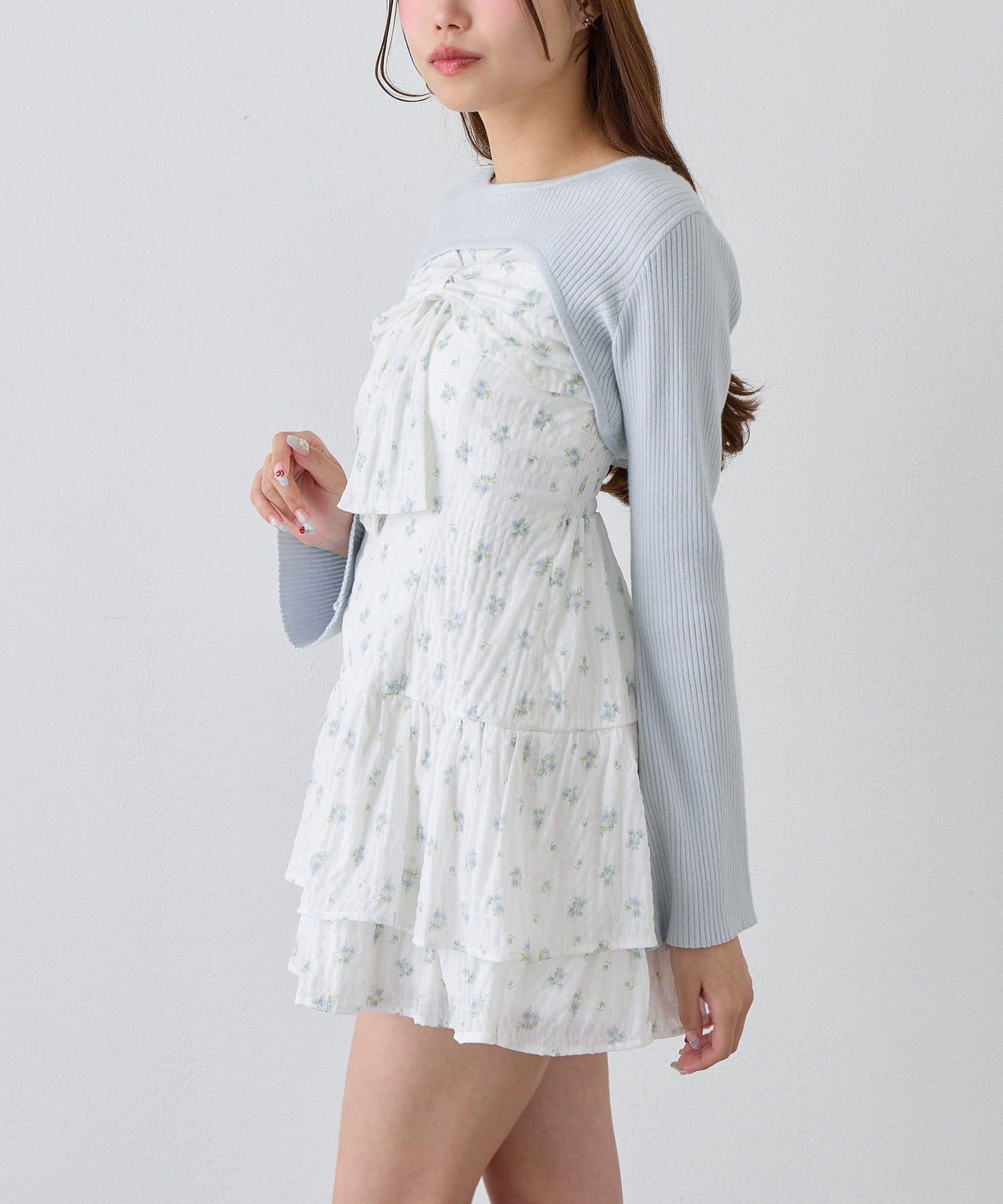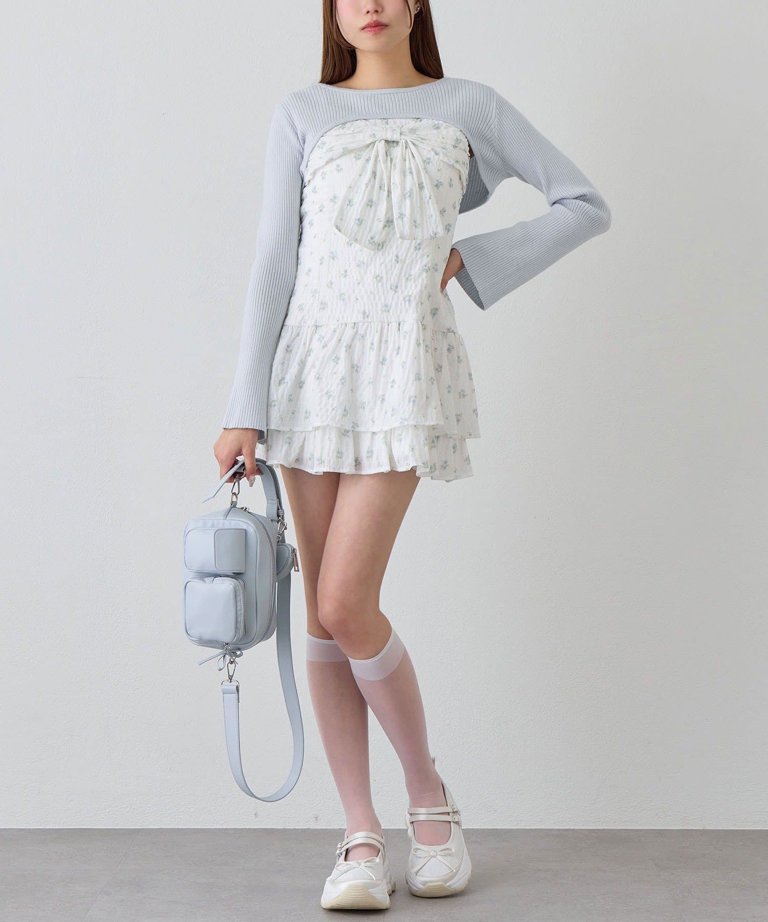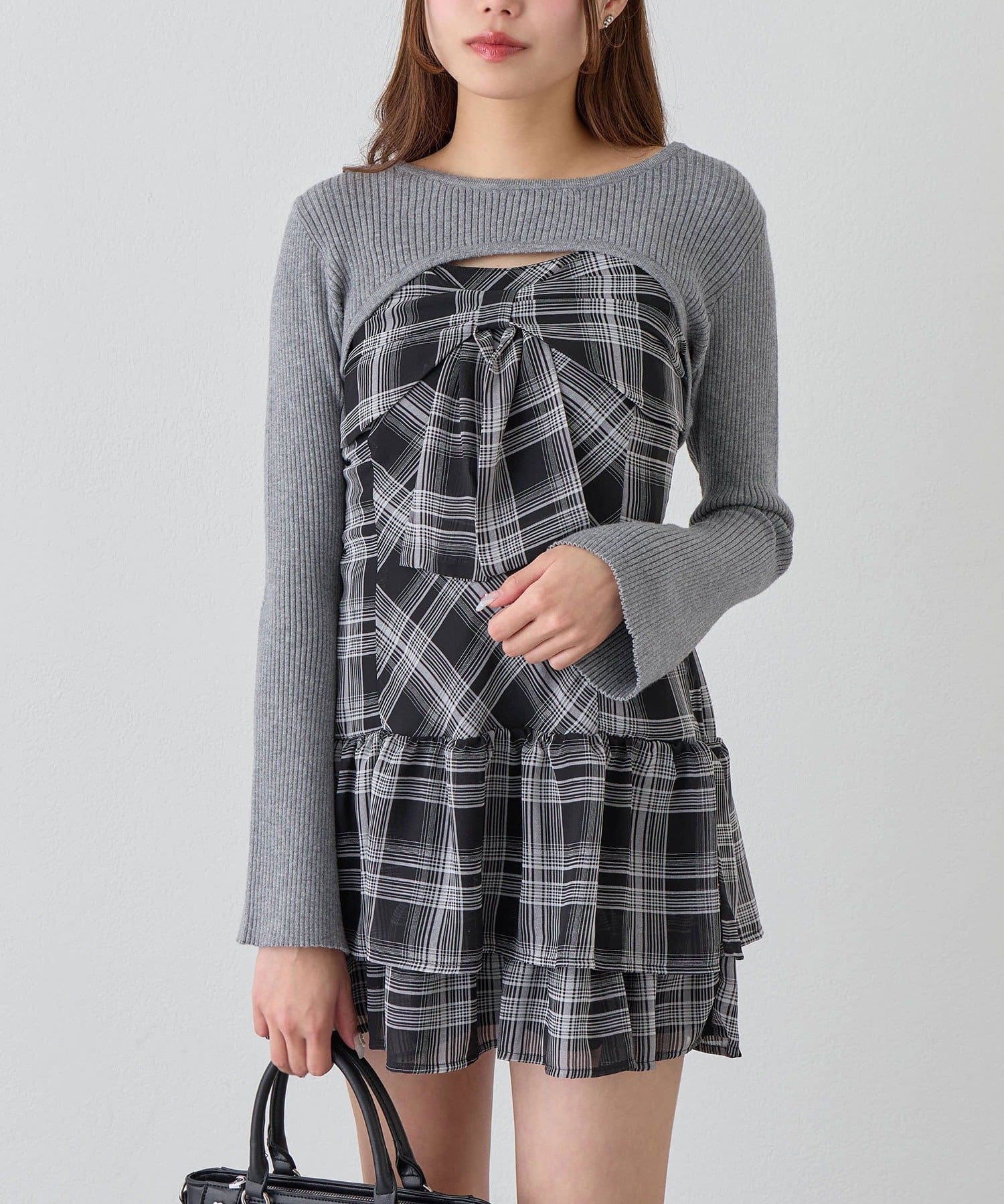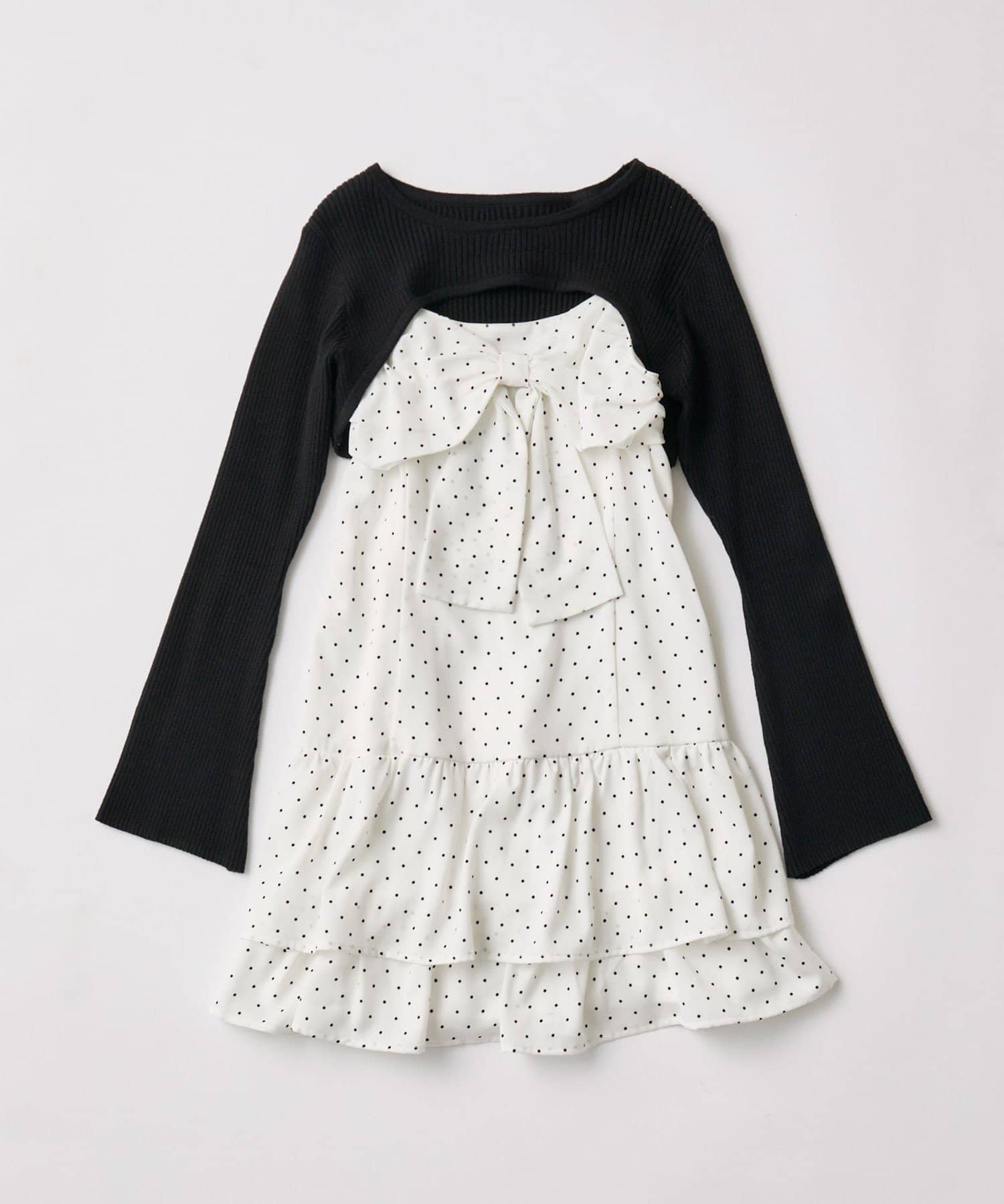 ・大きいリボンが映え間違いなしなキャミワンピースと、華奢見えするニットのセット。