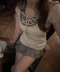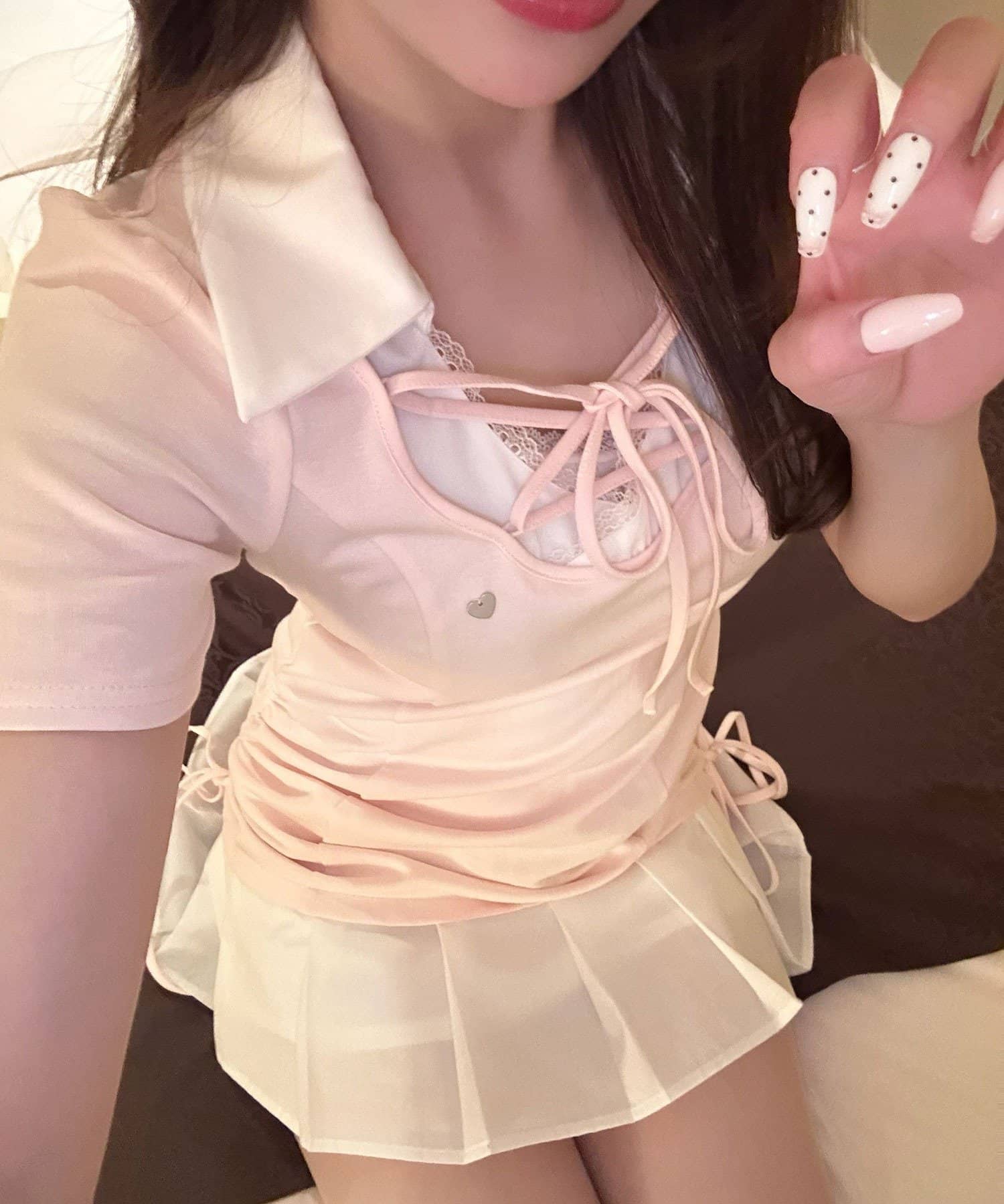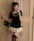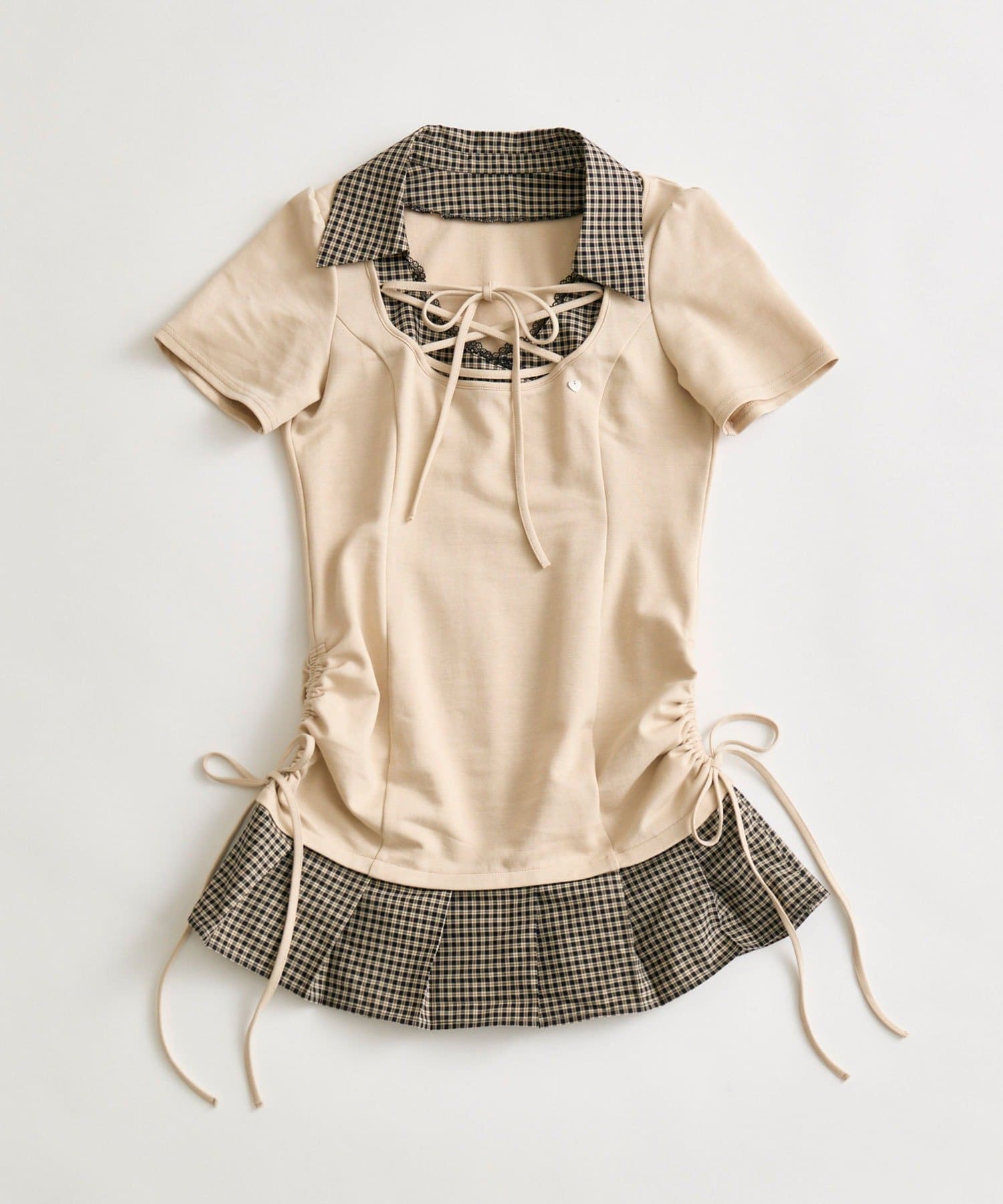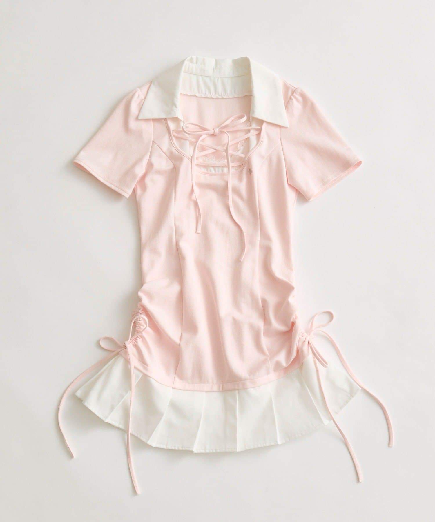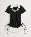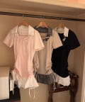 ・首元はレースアップですっきり見えして、レースもついてるので上品見えも叶います。