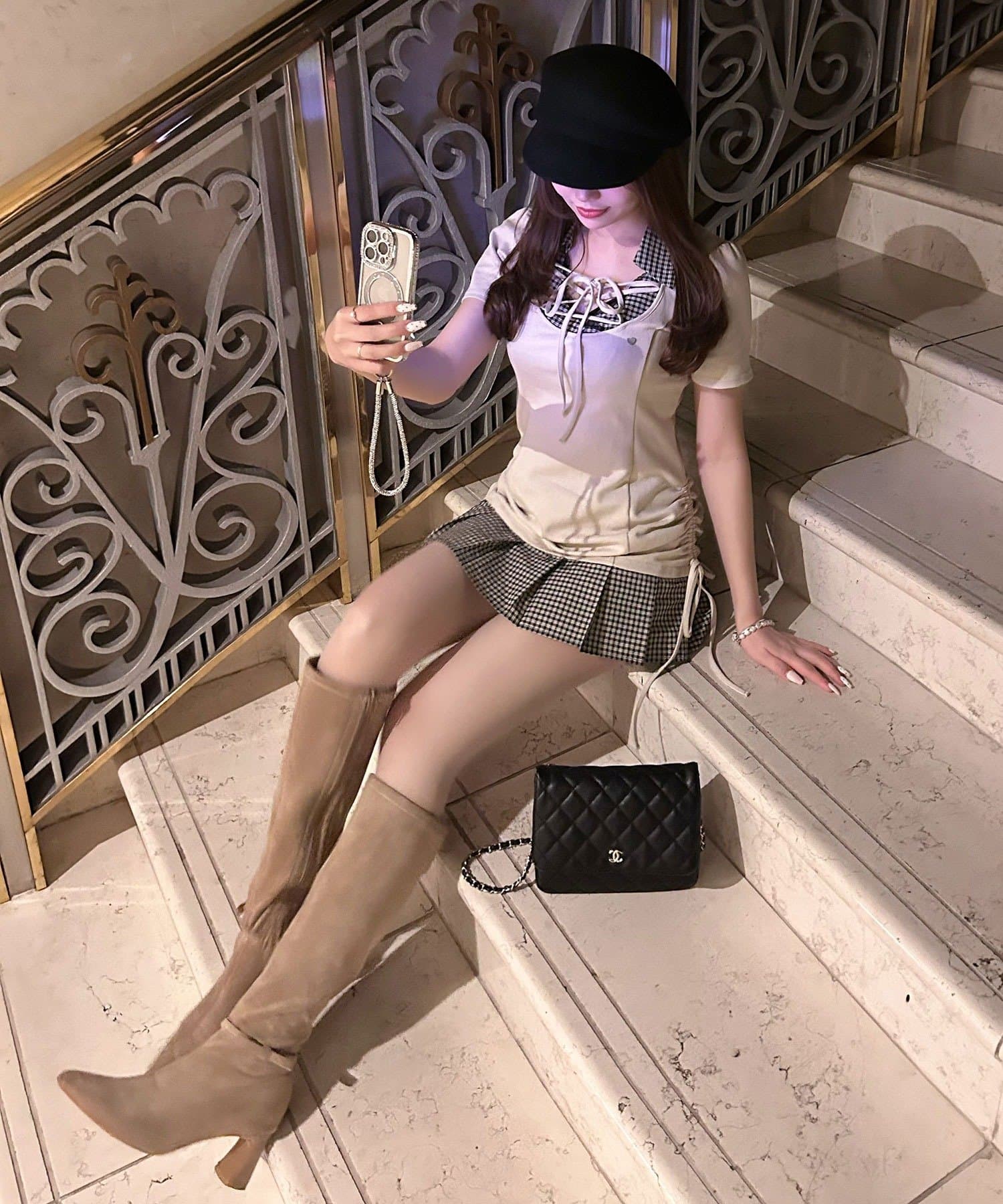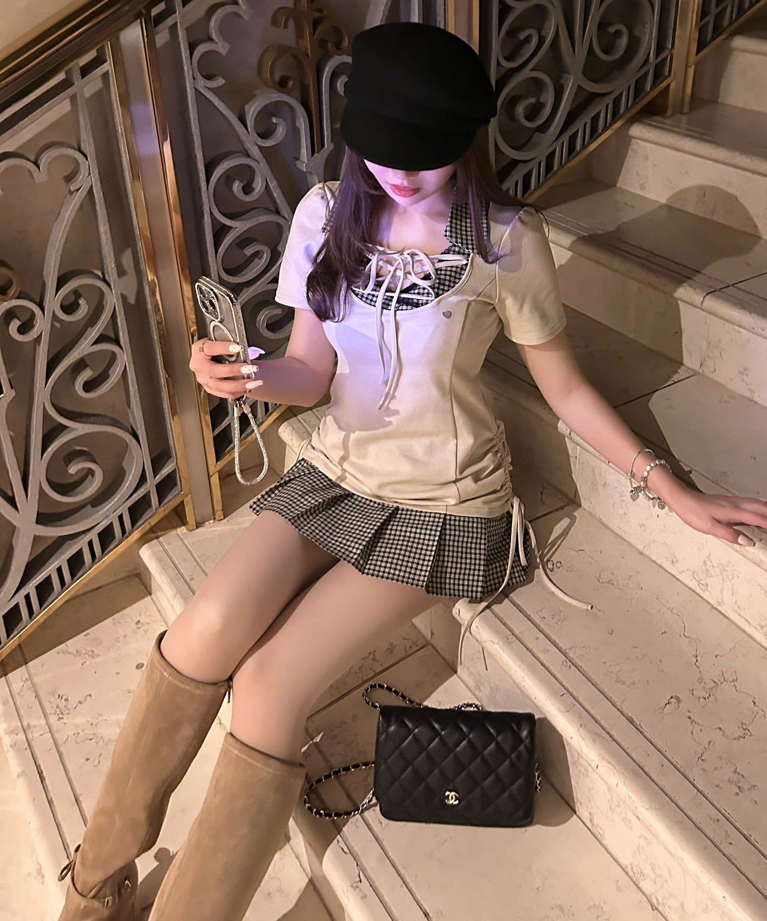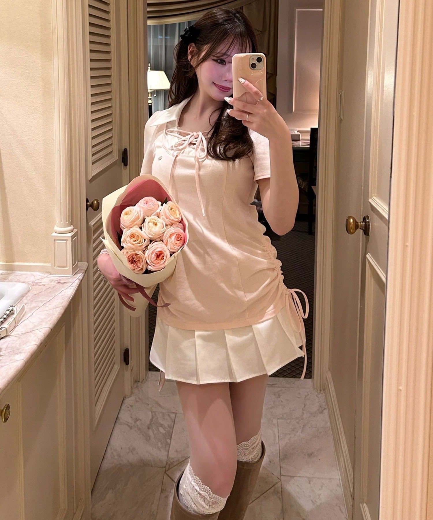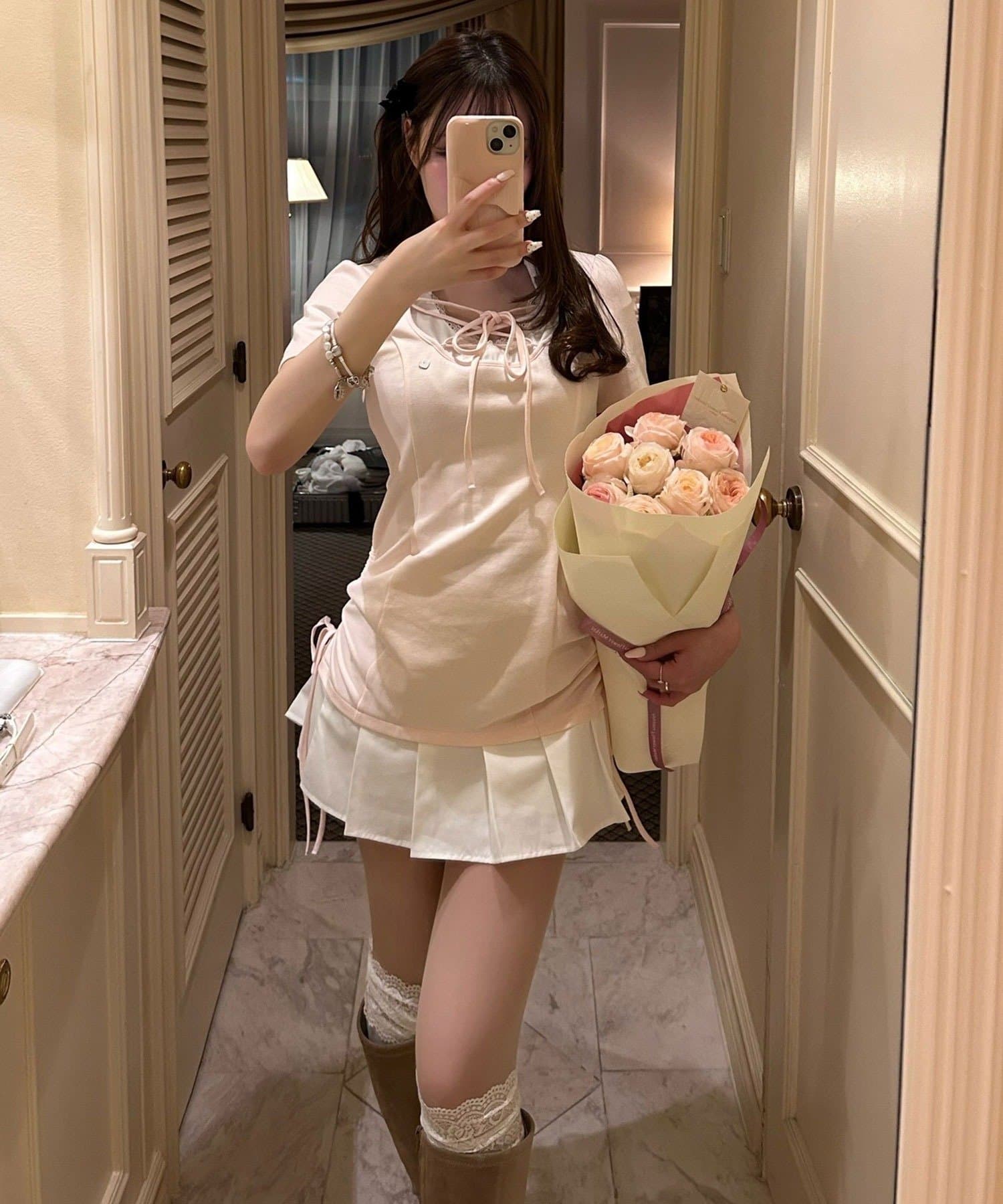 ・足元はハイソックスにローファーやブーツを合わせると、ガーリーにまとまります。