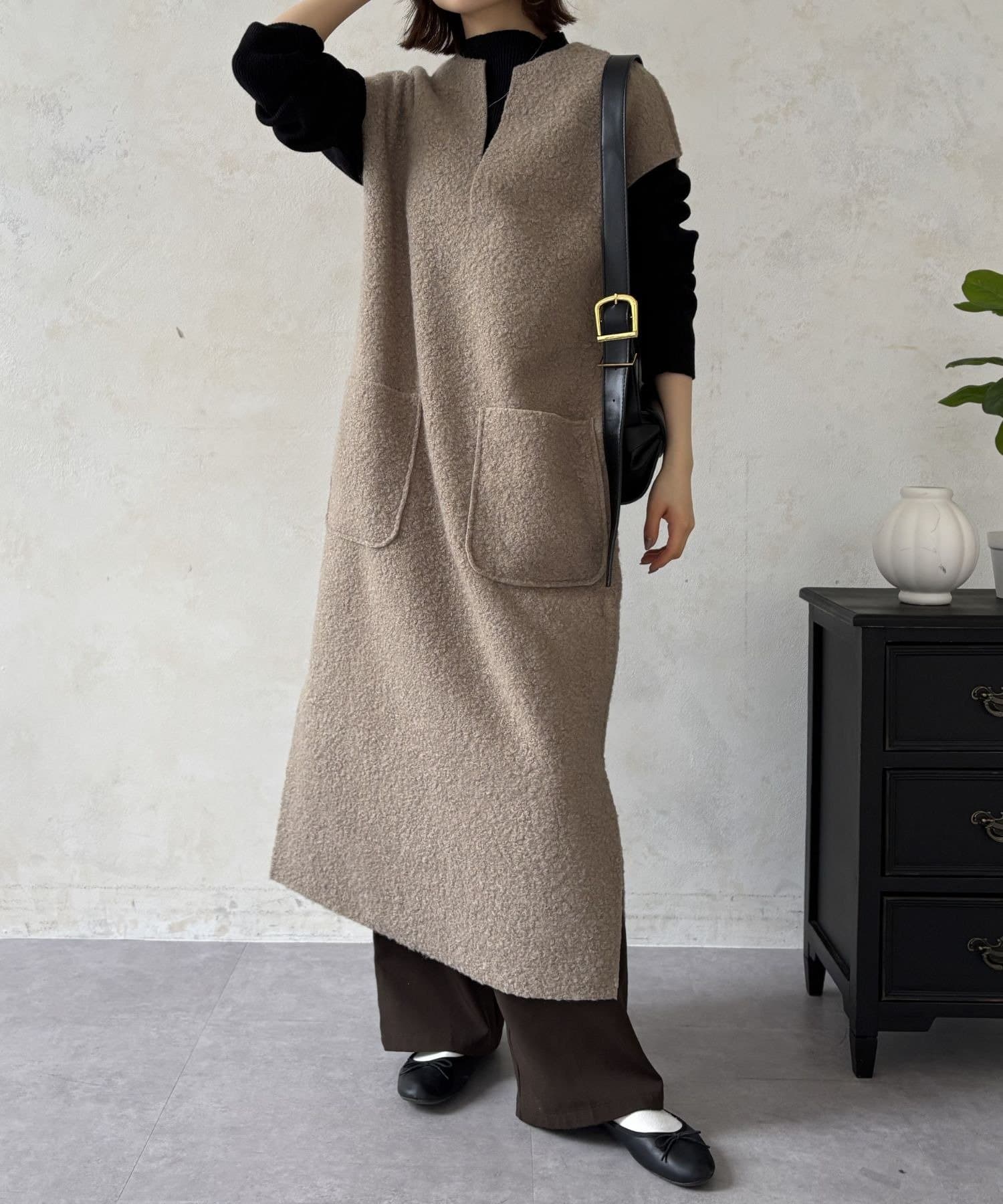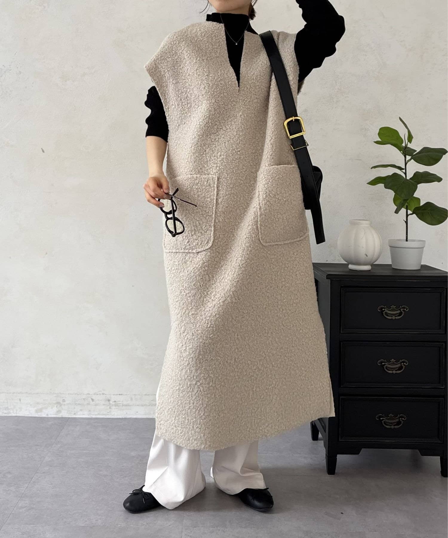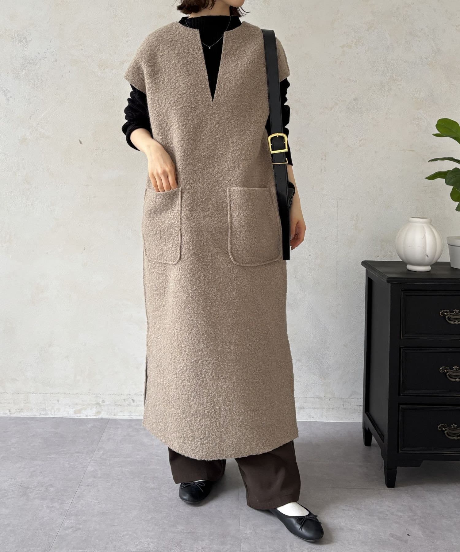 一枚で旬のレイヤードスタイルが完成する、大人のためのキーネックワンピース