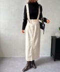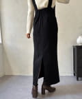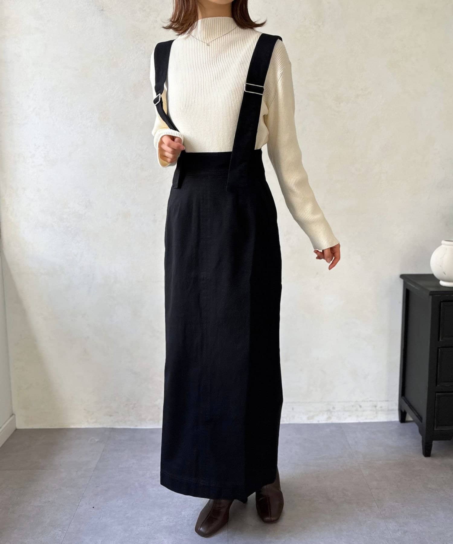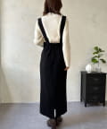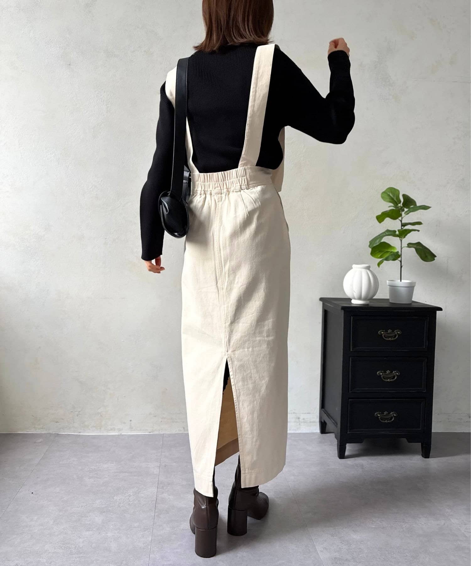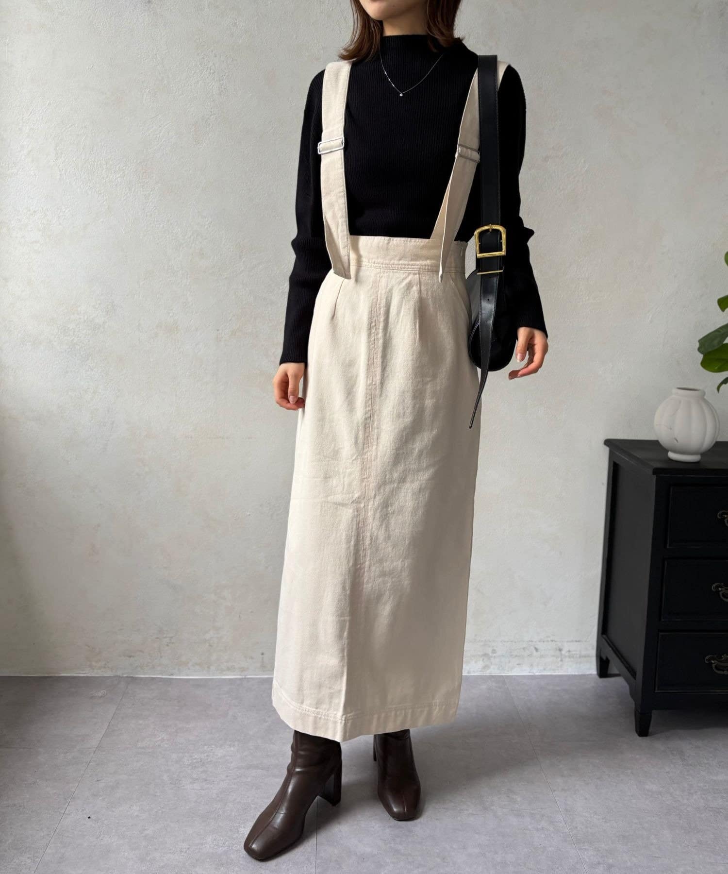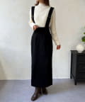 子供っぽい印象になりがちなサロペットスカートですが、すっきりとしたIラインのロングシルエットで洗練された大人の女性に似合うデザインに。