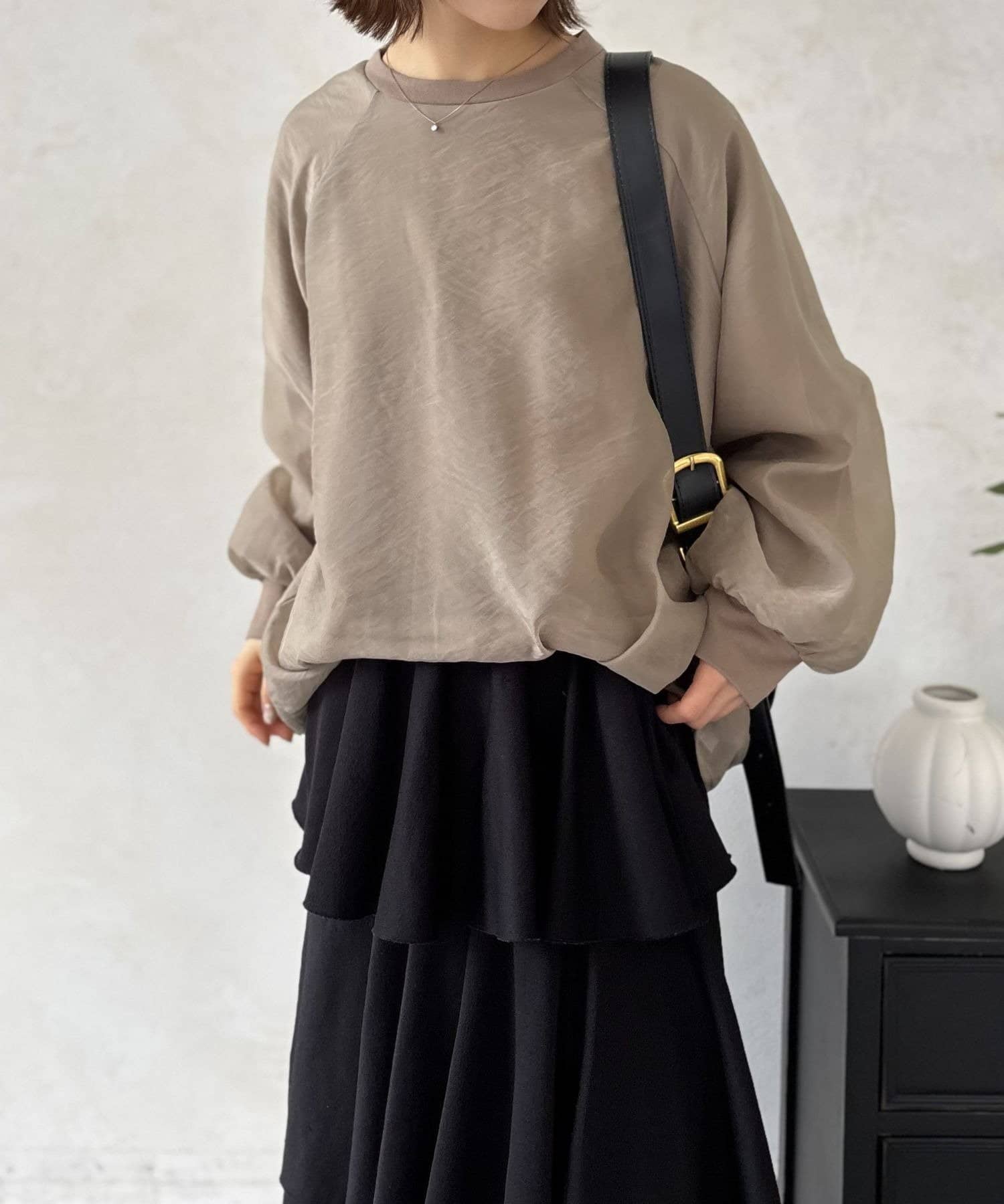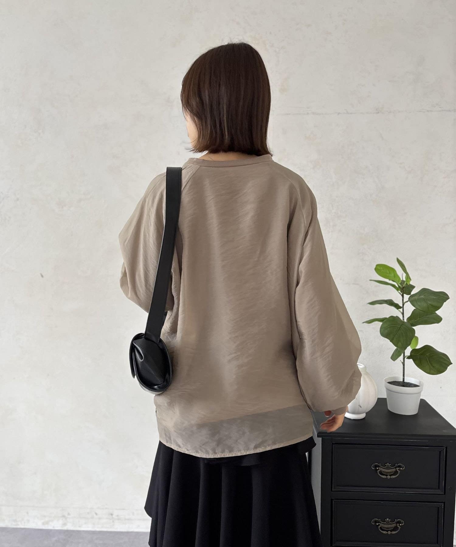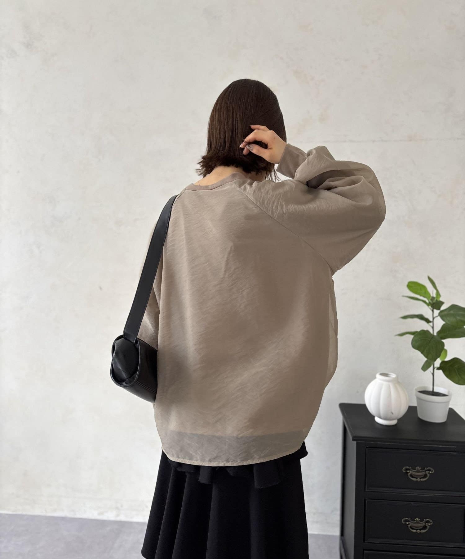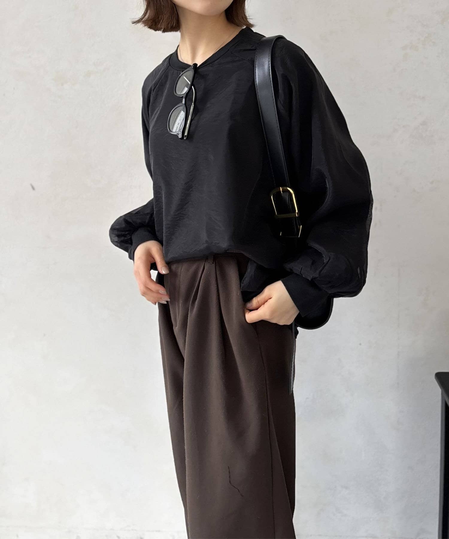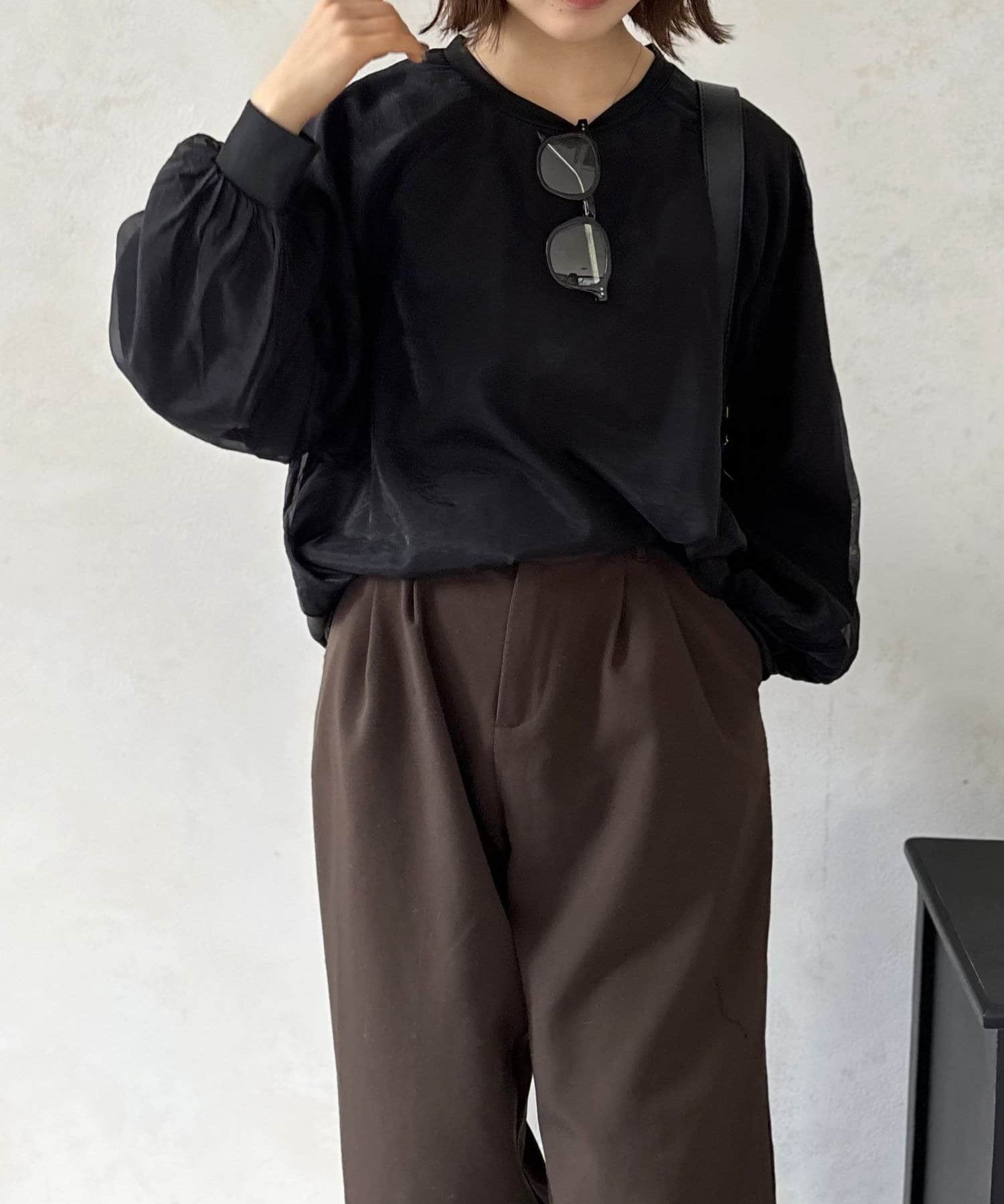 定番の「ブラック」は、オーガンジーの透け感のおかげで重たい印象にならず、軽やかな着こなしが叶います。カラーパンツや柄物のスカートを合わせれば、トップスのデザインが一層引き立ちます。