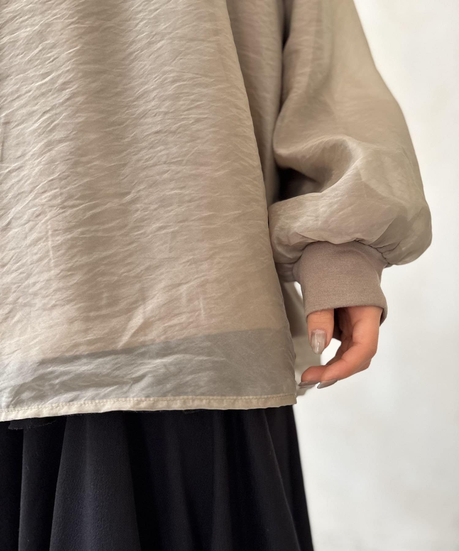 ボリュームのある袖とは対照的に、袖口はすっきりとさせることでメリハリをプラス。袖を少したくし上げれば、さらに抜け感が生まれ、女性らしい手首を演出できます。