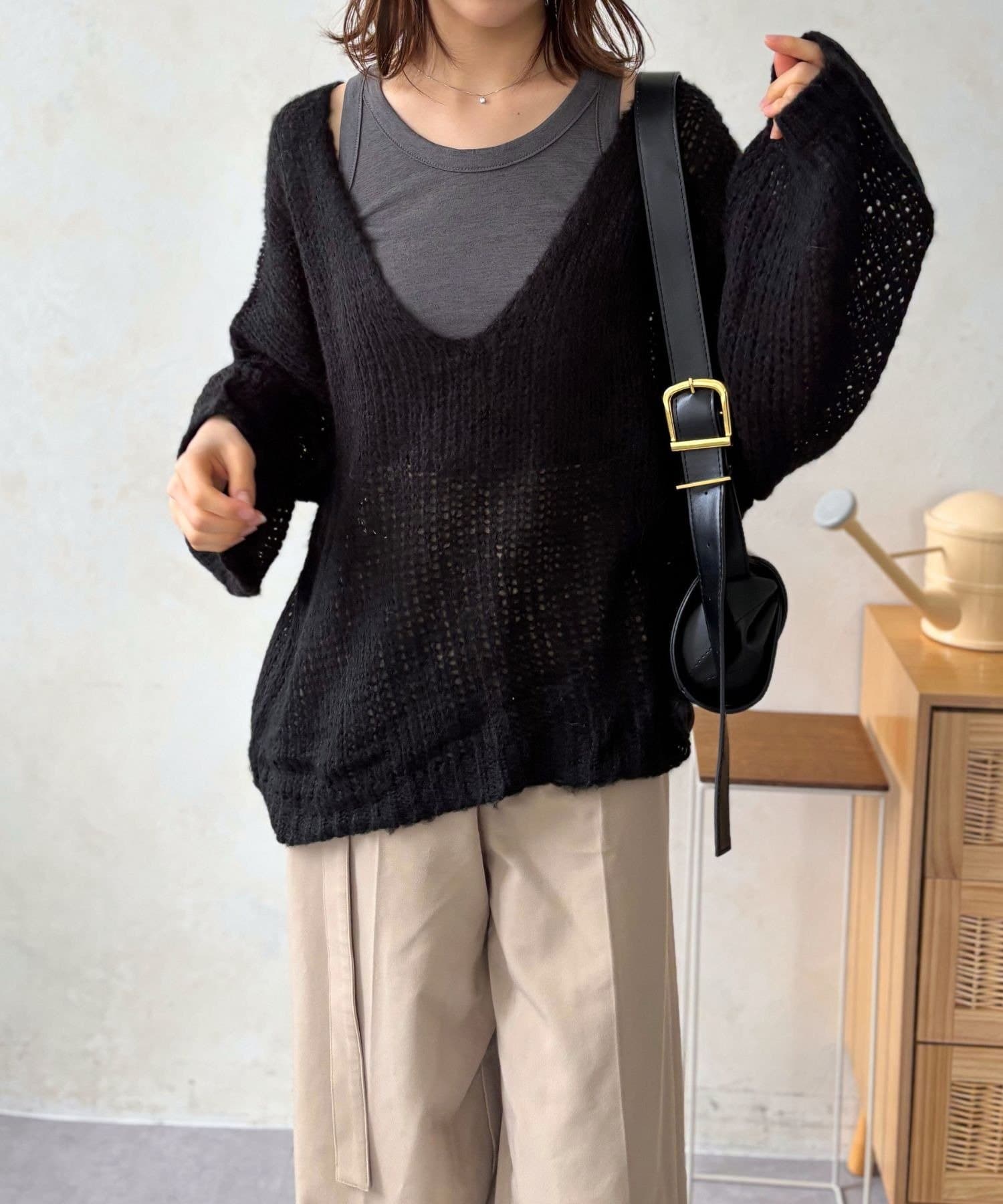 大きく開いたUネックが印象的なプルオーバーは、重ねたタンクトップとの絶妙なバランスで抜け感を演出。