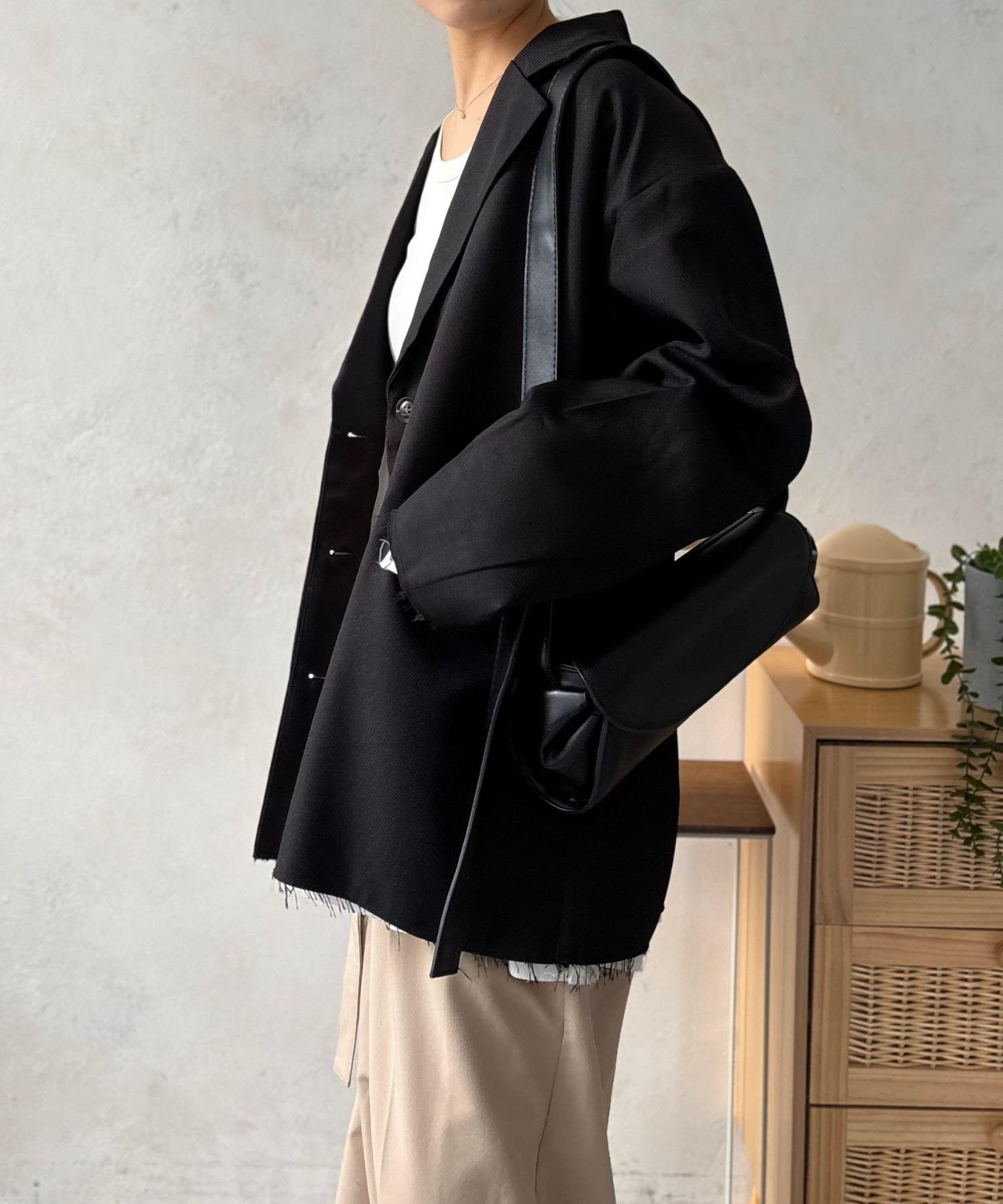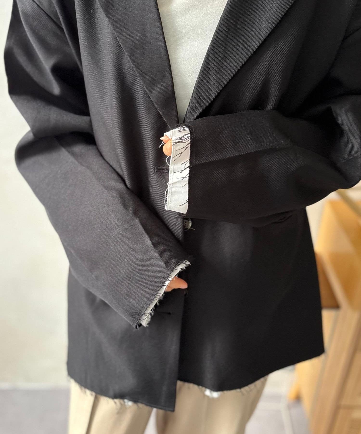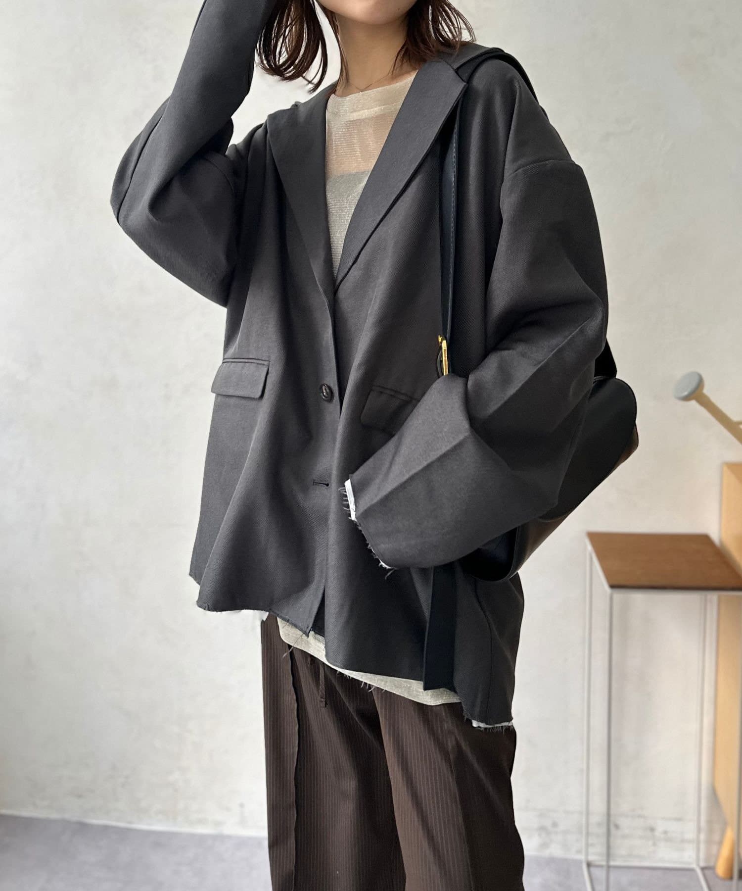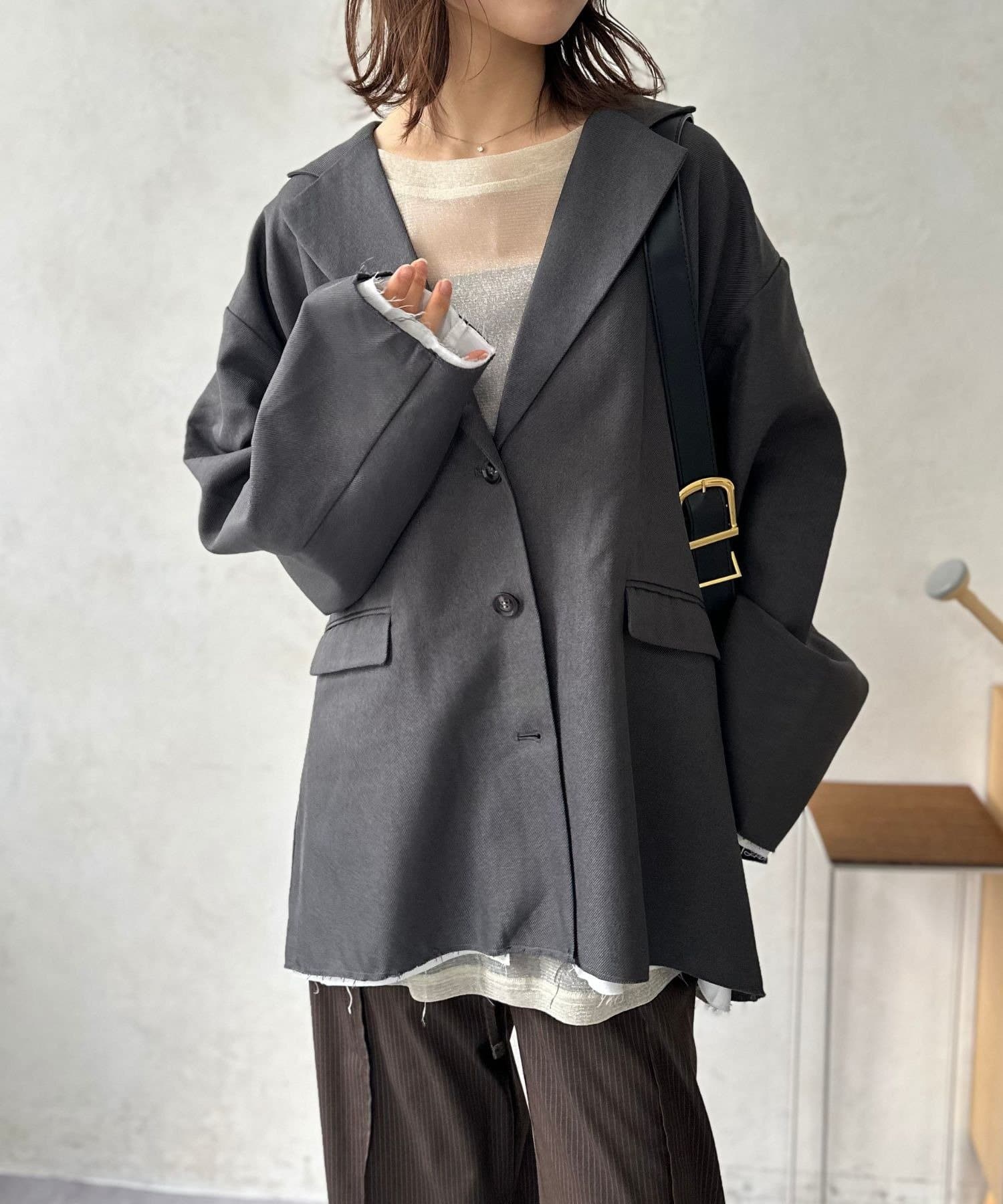 一番の魅力は、なんといっても裾と袖口にあしらわれた大胆なカットオフデザイン。かっちりとしたジャケットのイメージを覆す、ラフでこなれた雰囲気が、羽織るだけでお洒落上級者の風格を漂わせます。
