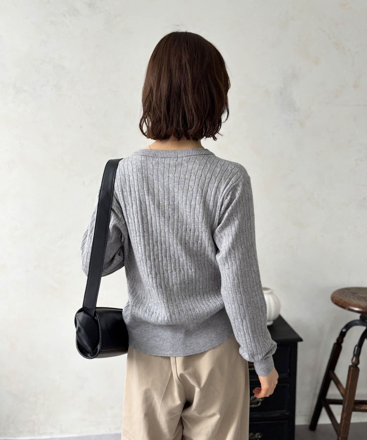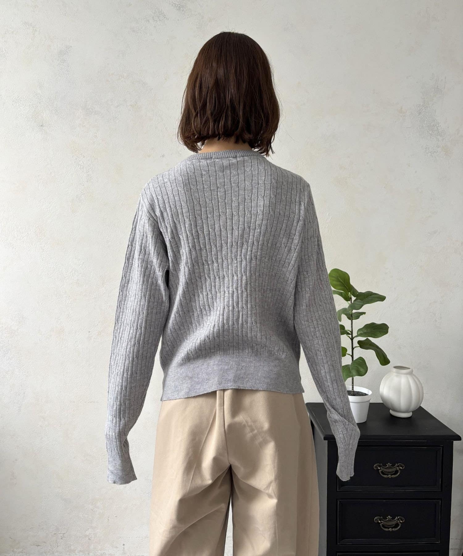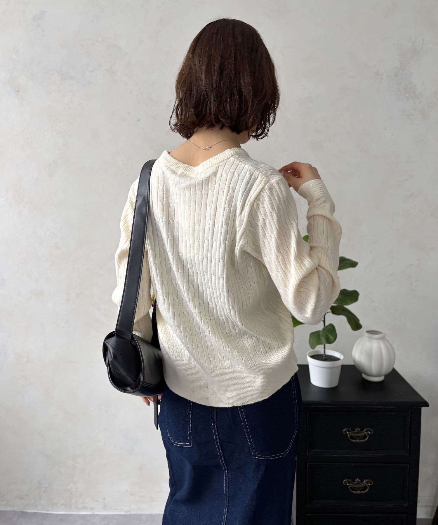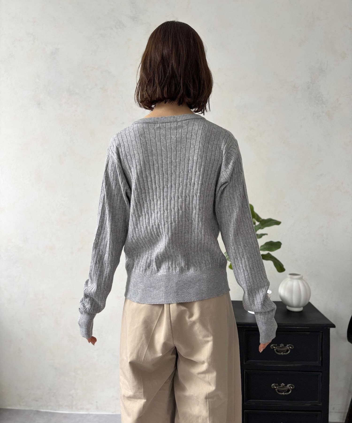 上品でクラシカルな印象を与えるケーブル編みが、縦のラインをさりげなく強調。着るだけでスタイルをすっきりと見せてくれる効果も期待できます。