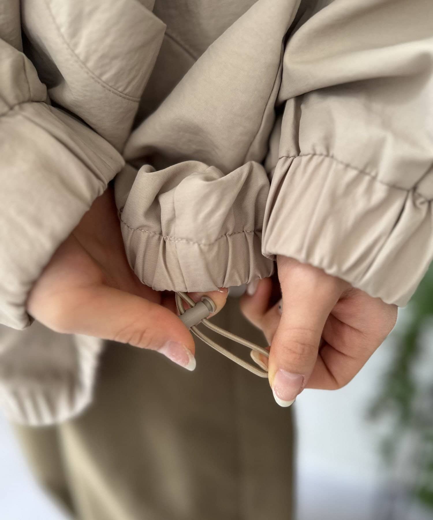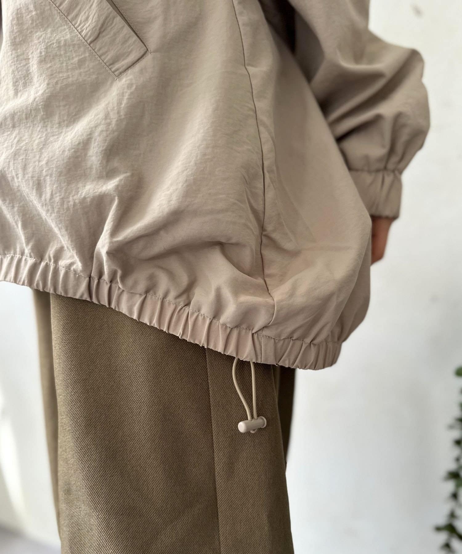 伸縮性:なし。袖ゴム仕様。裾ドロスト仕様。