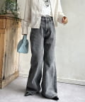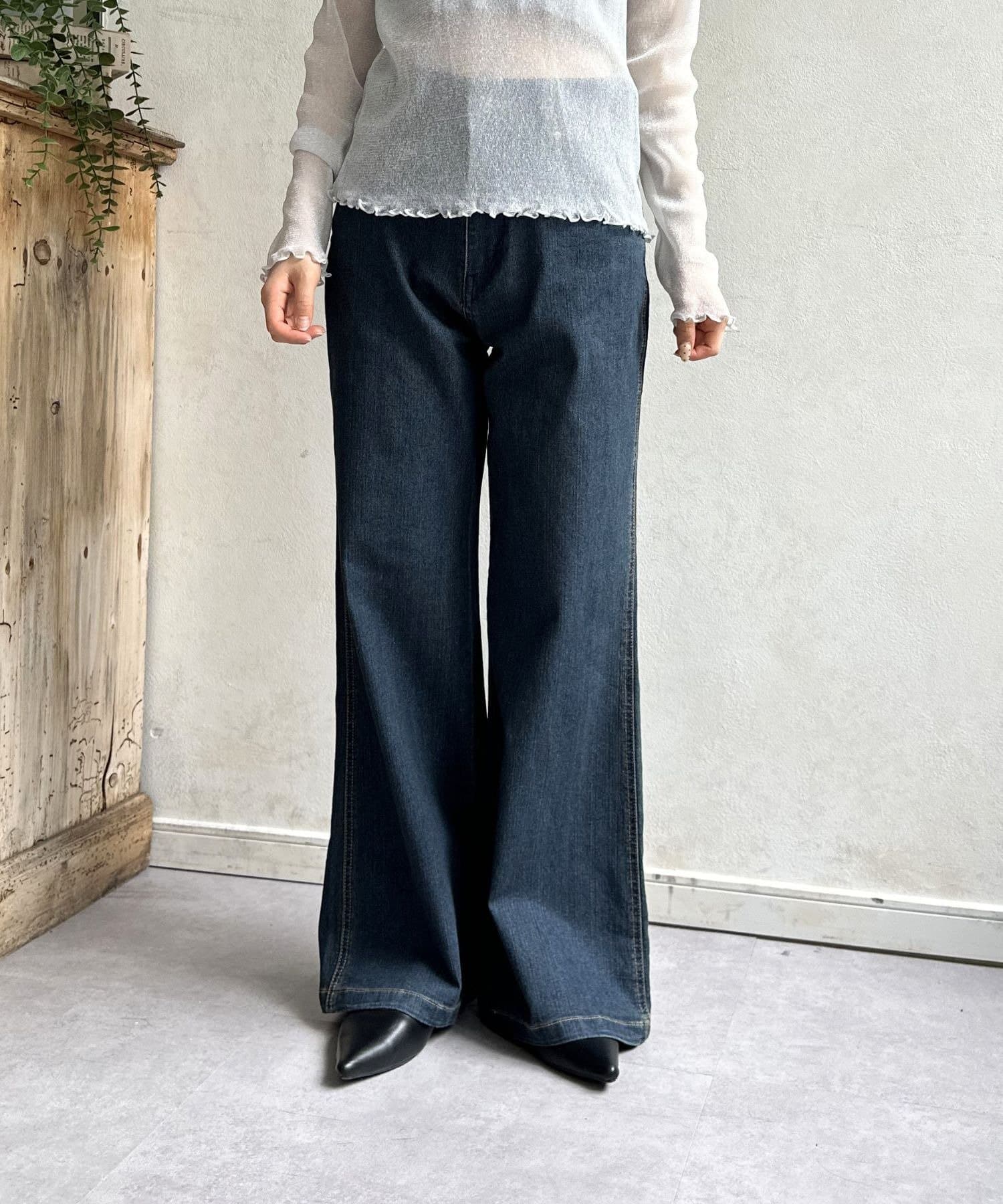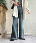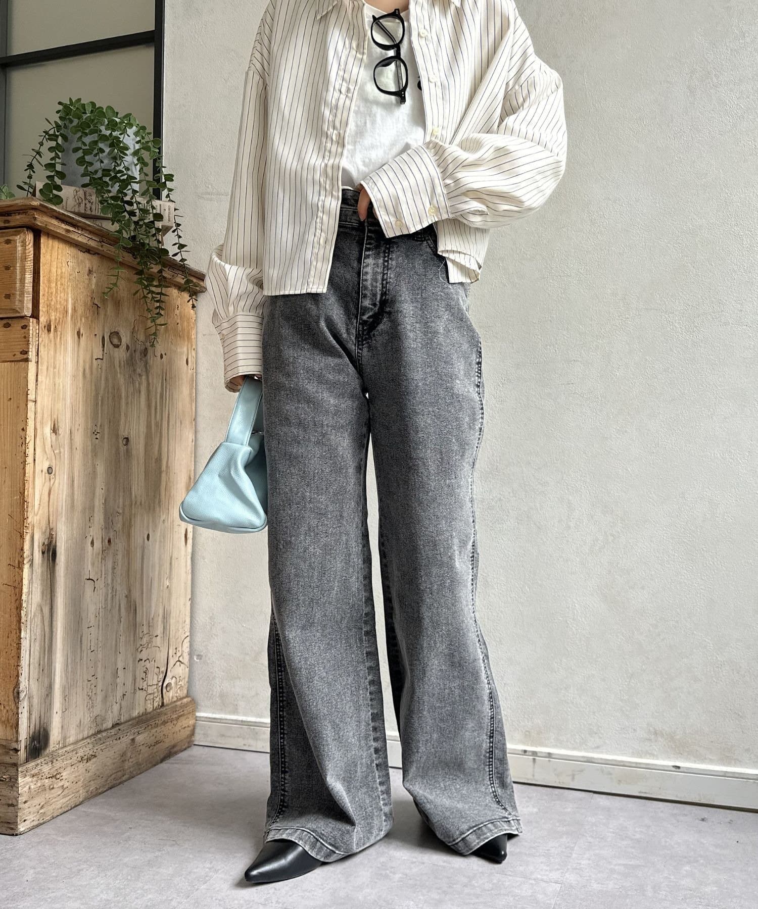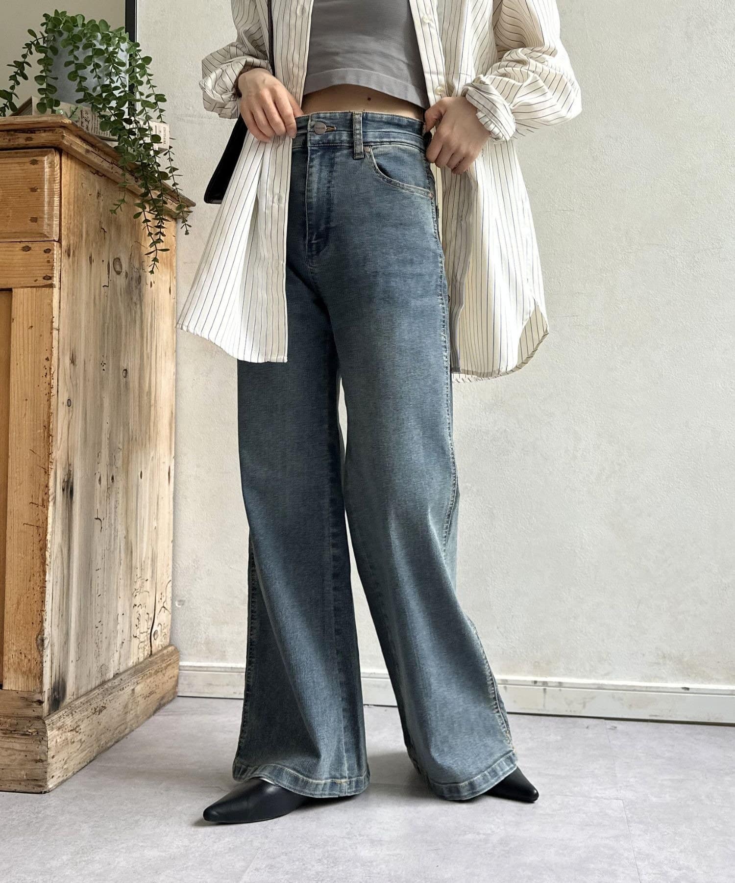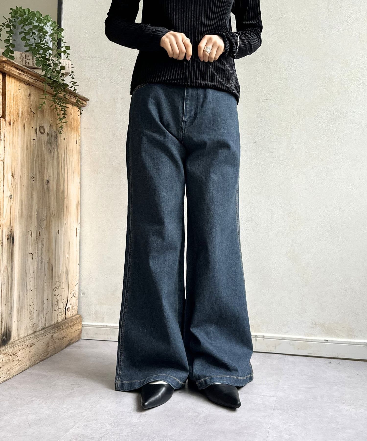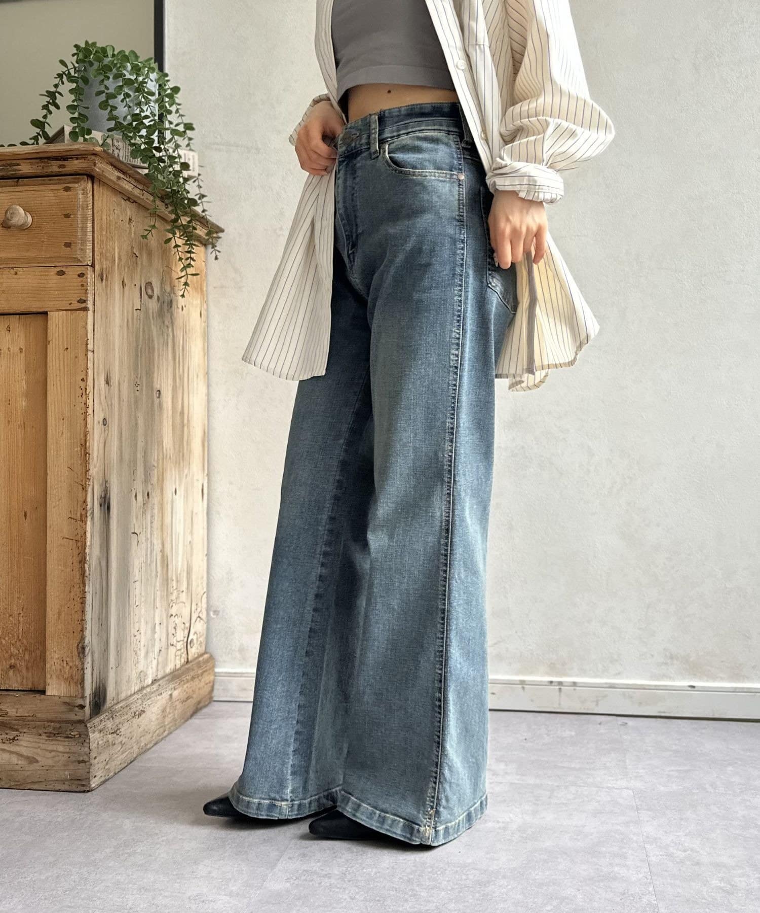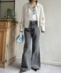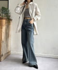 シンプルなTシャツやカットソーを合わせるだけでも、デニムの美しいシルエットが際立ち、こなれた雰囲気に仕上がります。