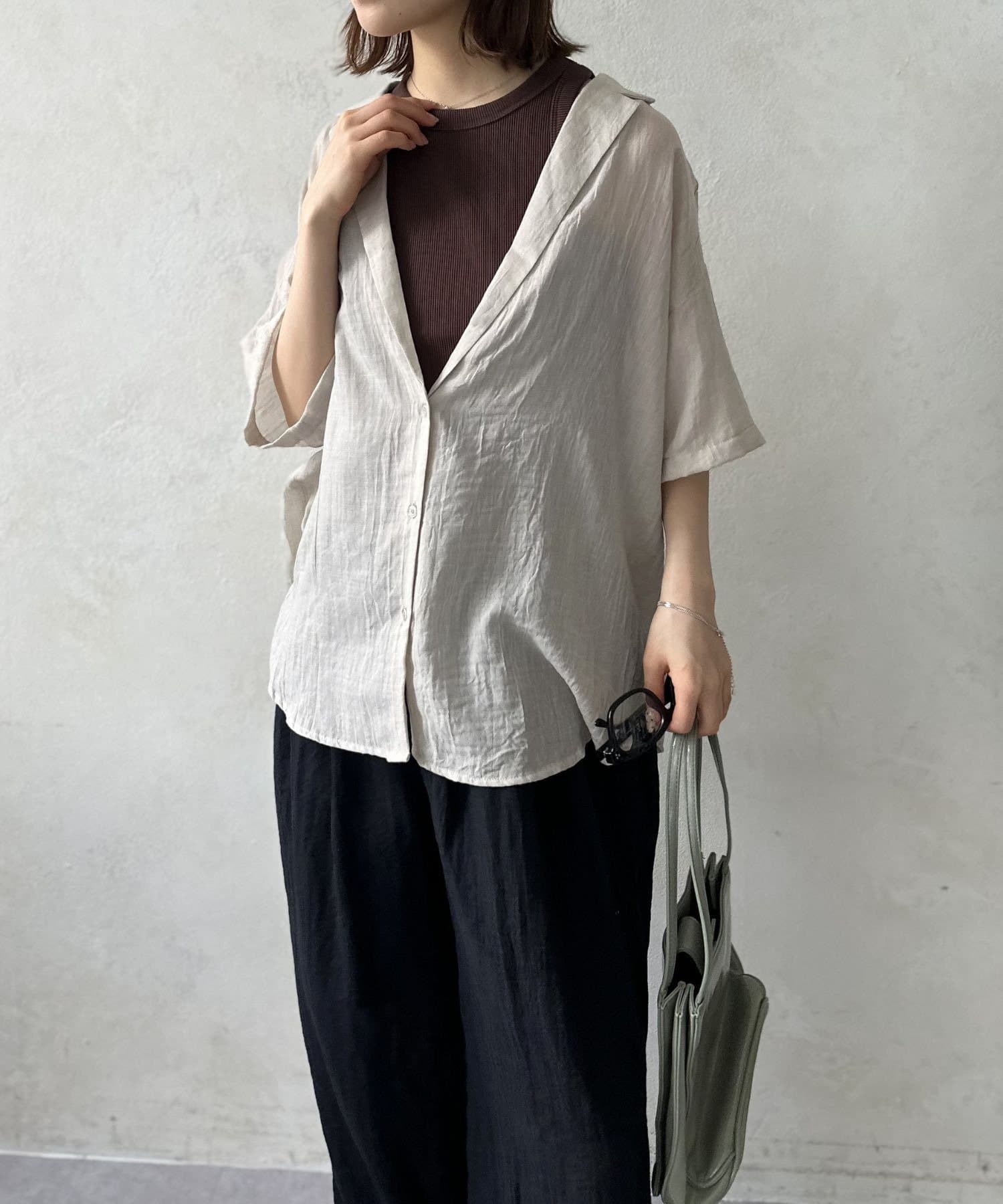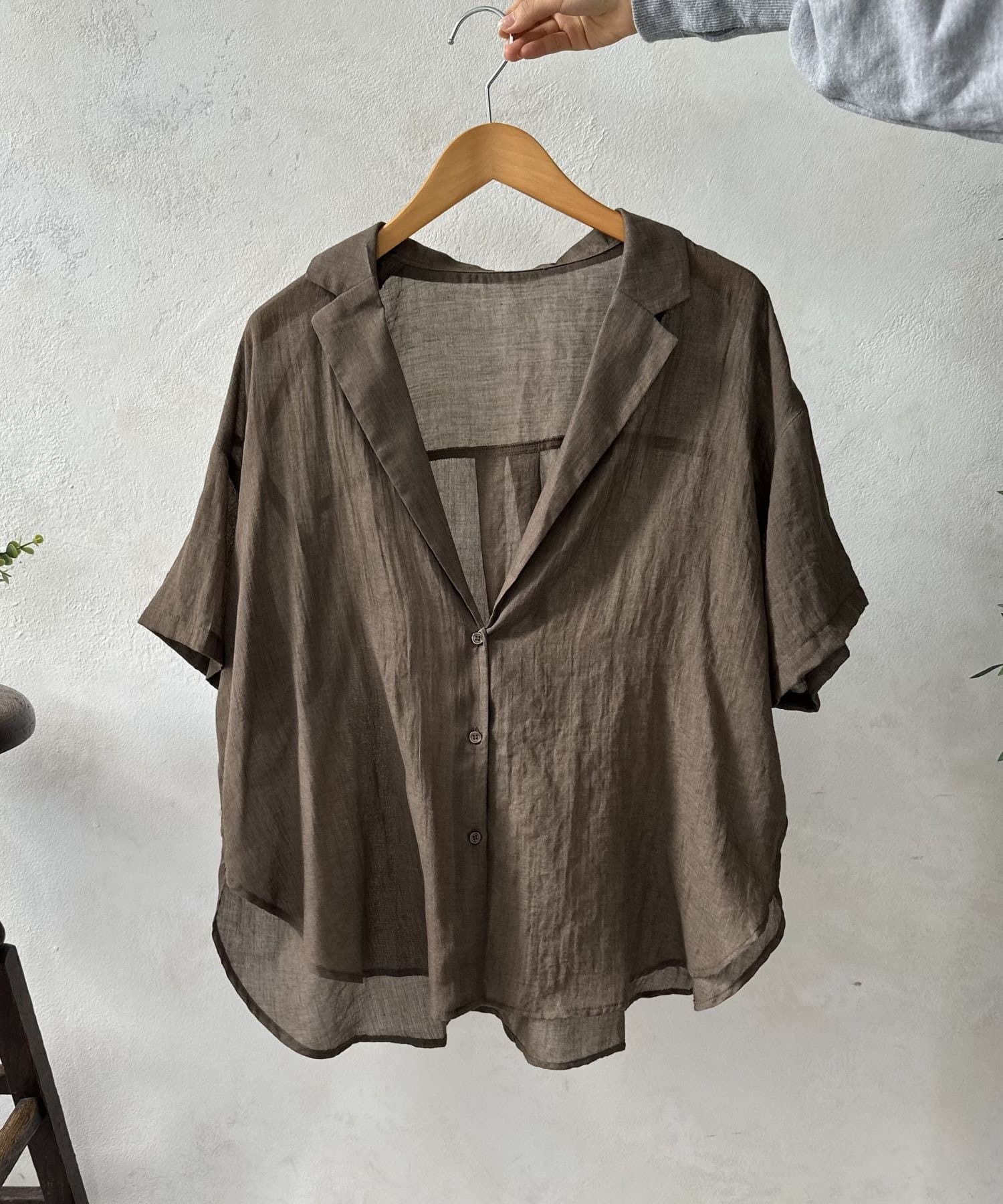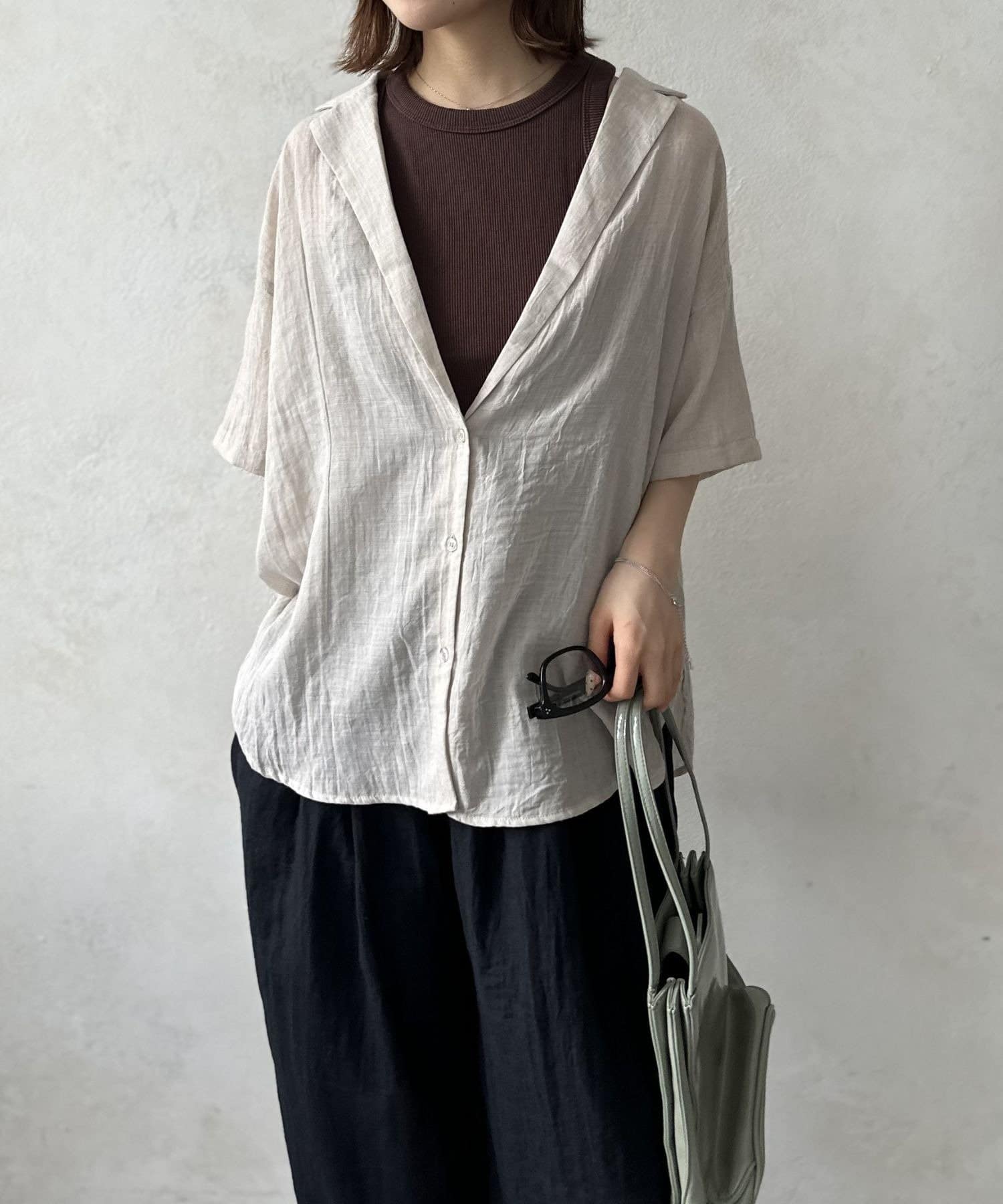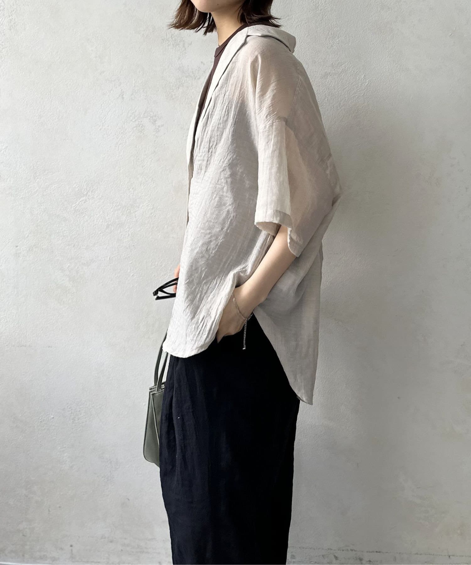 風をはらむようなエアリーな生地感で、肌寒い朝晩や冷房が効いた室内でさっと羽織るのにまさに最適。シャツのきちんと感とカーディガンの手軽さを両立した、万能アイテム。