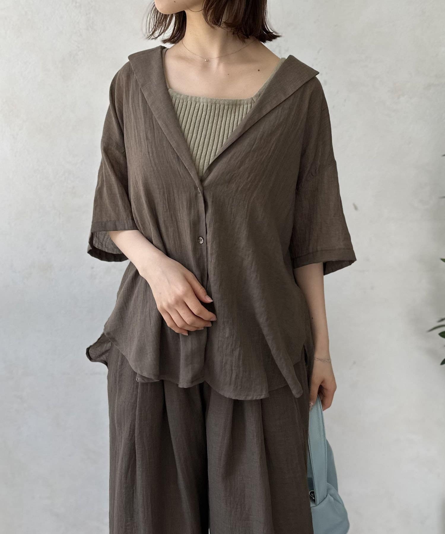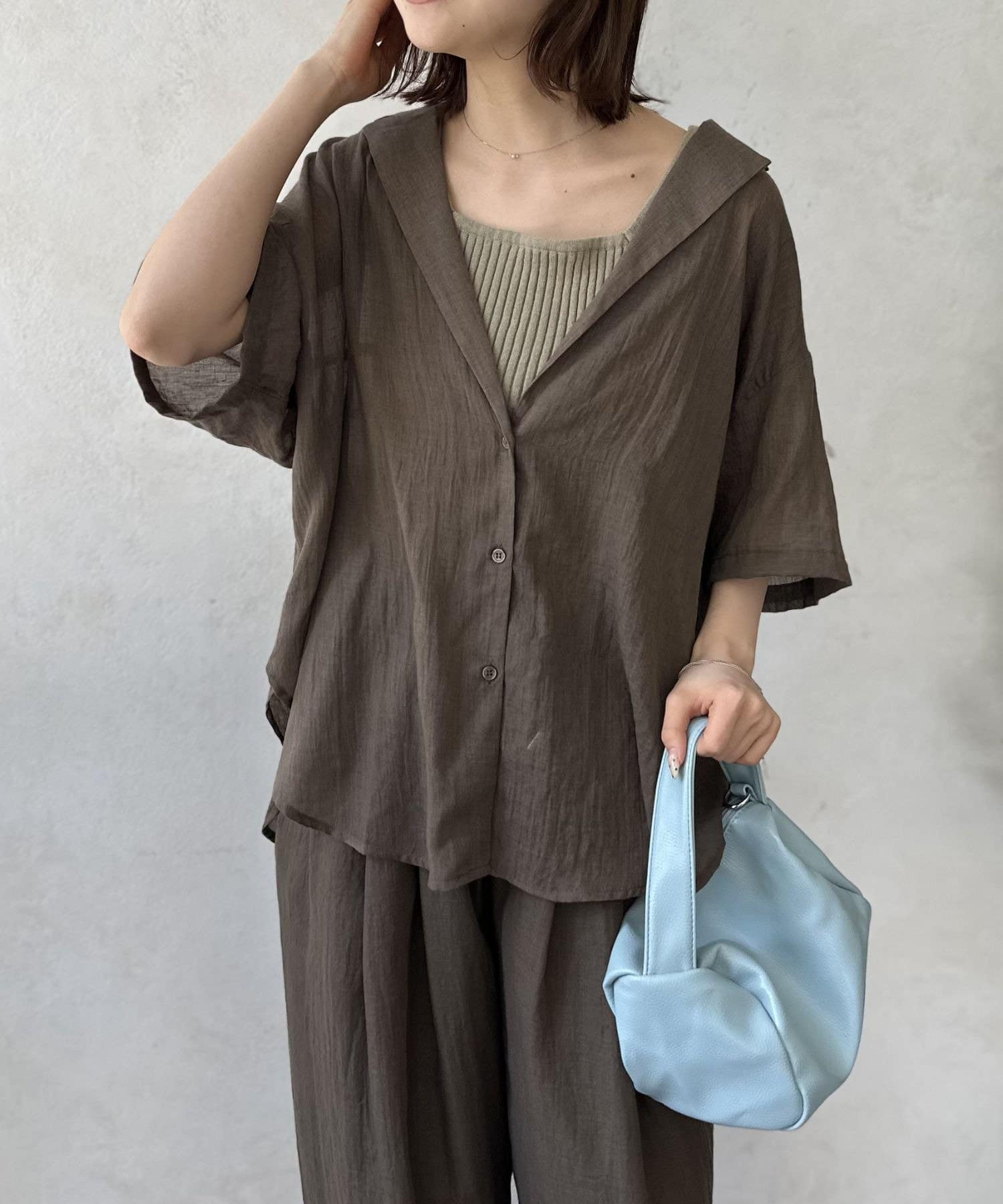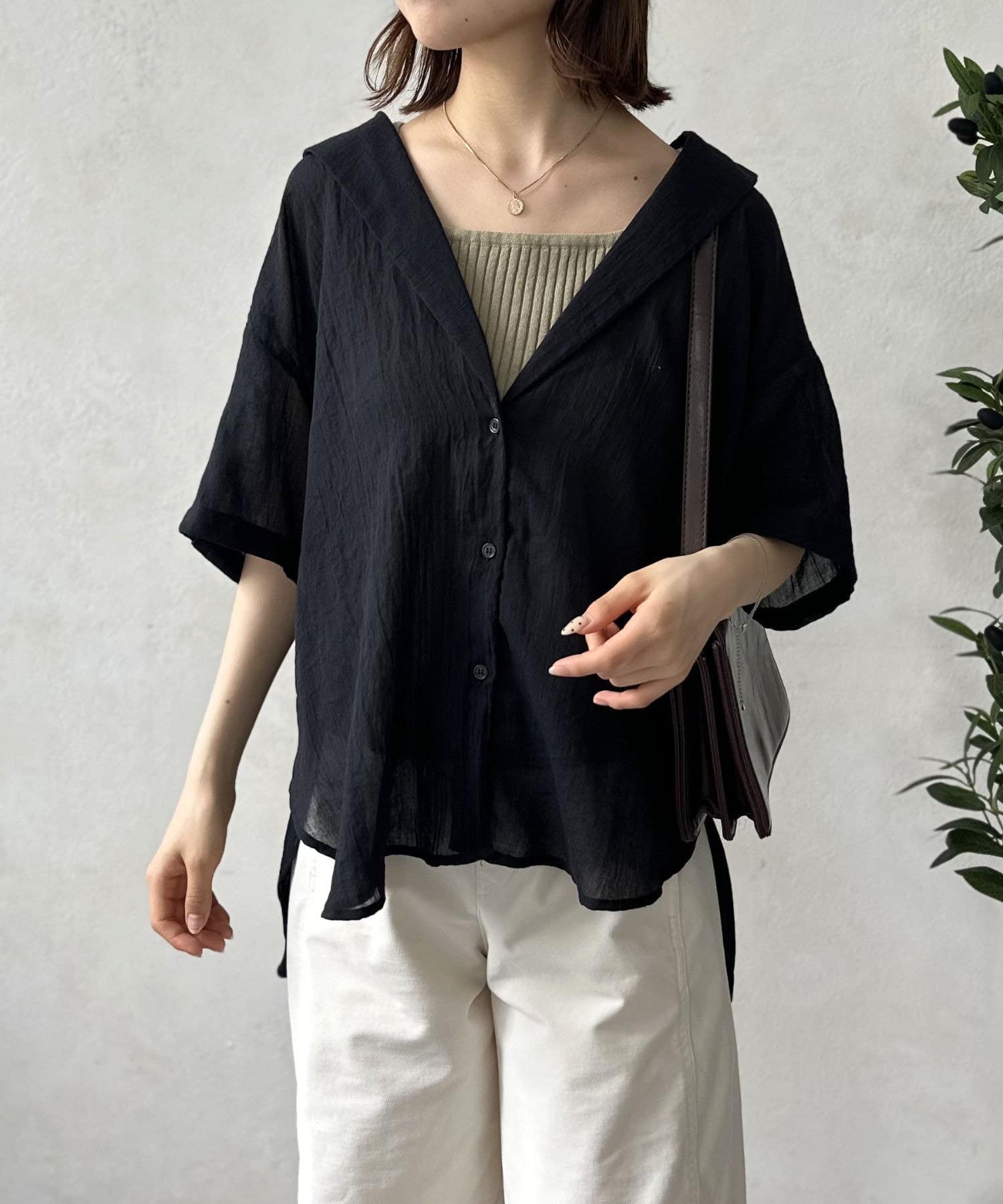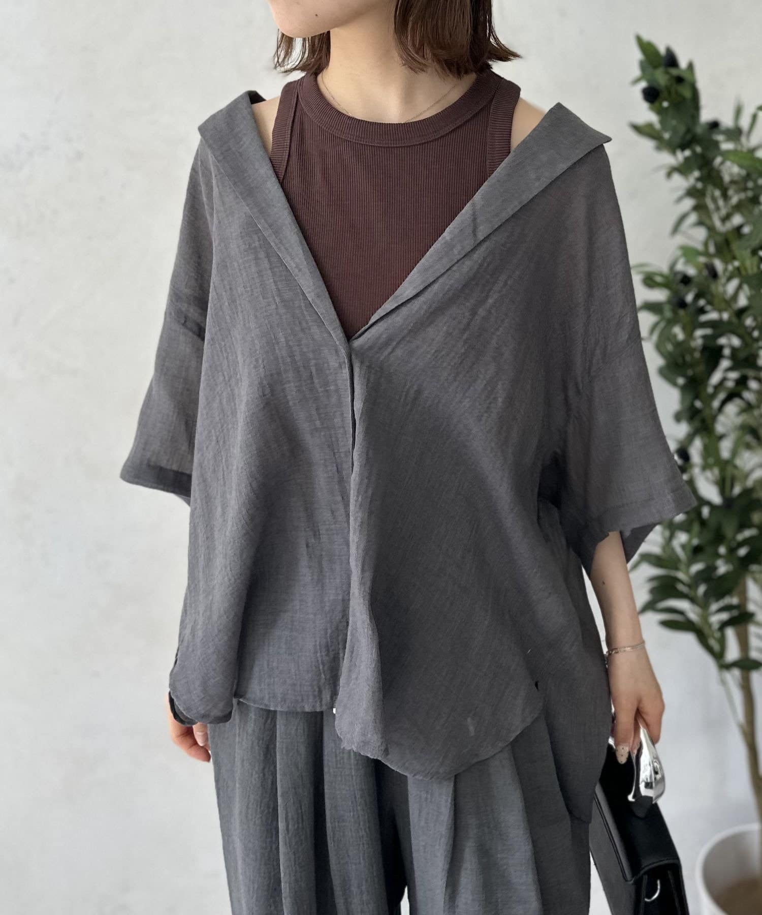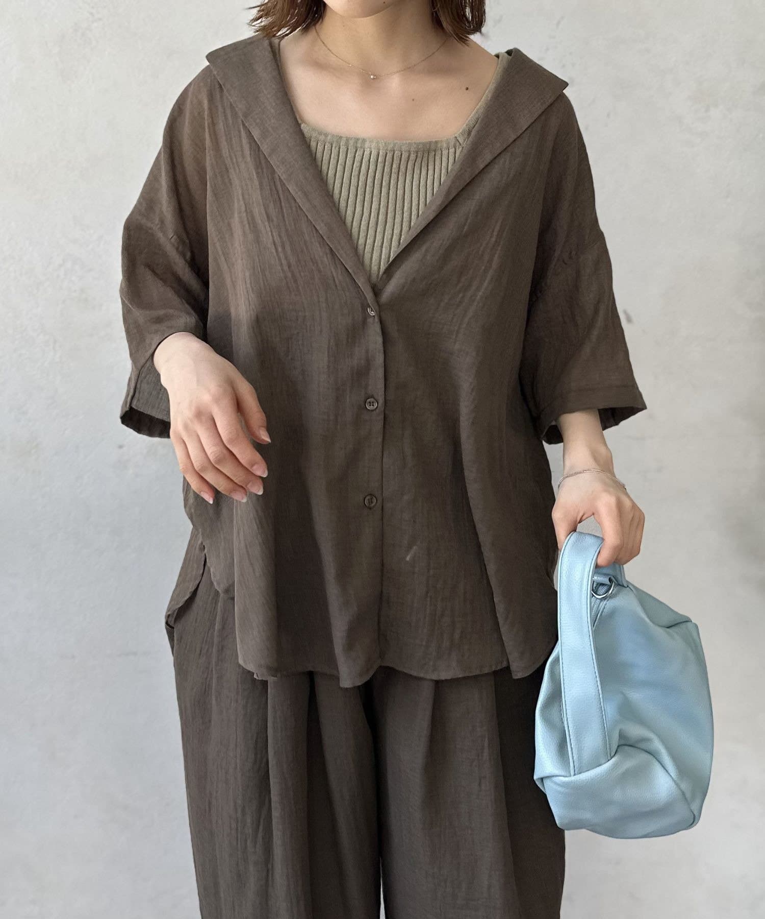 風をはらむようなエアリーな生地感で、肌寒い朝晩や冷房が効いた室内でさっと羽織るのにまさに最適。シャツのきちんと感とカーディガンの手軽さを両立した、万能アイテム。