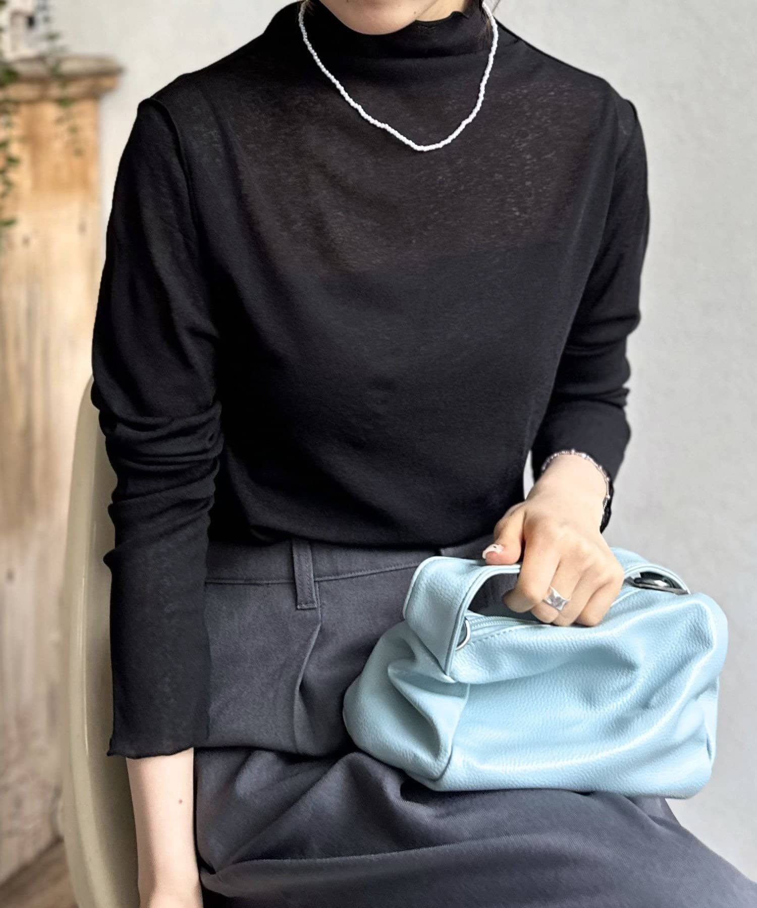 縫い目をあえて表に出したアウトシームデザインが、さりげなく立体感と表情を生み出し、シンプルながらも単調にならないこだわりを感じさせます。