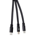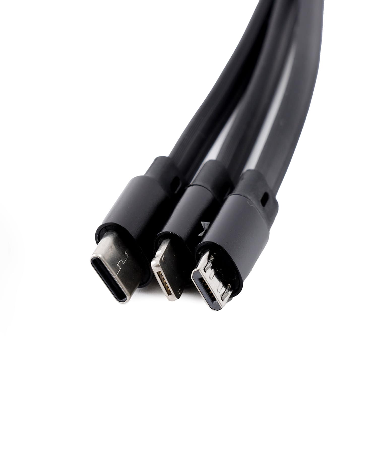 ●タイプC、ライトニング、マイクロUSBコネクタ搭載で3台同時に充電できるケーブル。