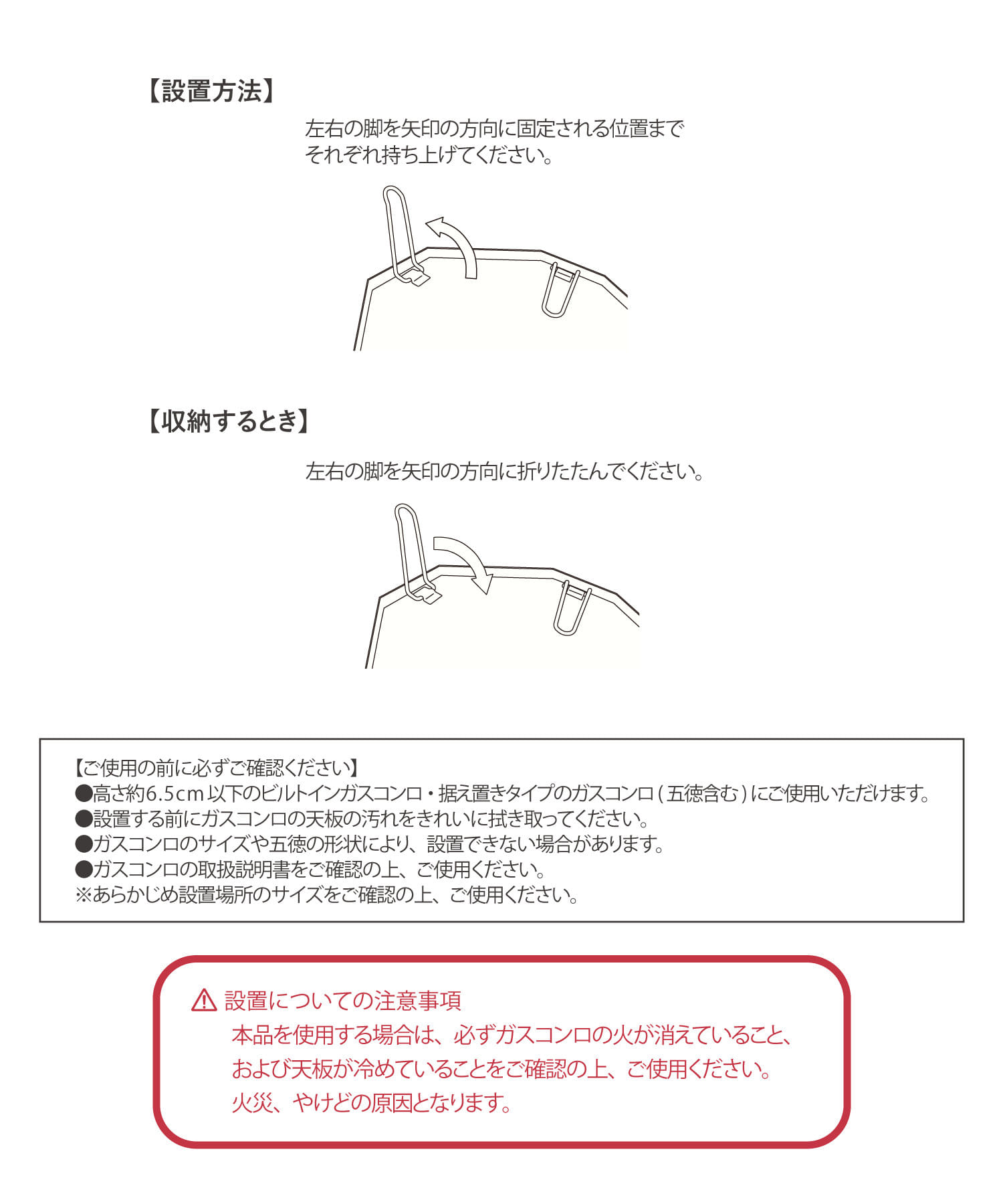 ●本品を使用する場合は、必ずガスコンロの火が消えていること、および天板が冷めていることをご確認の上、ご使用ください。火災、やけどの原因となったり、脚部の滑り止め部分が溶ける恐れがあります。