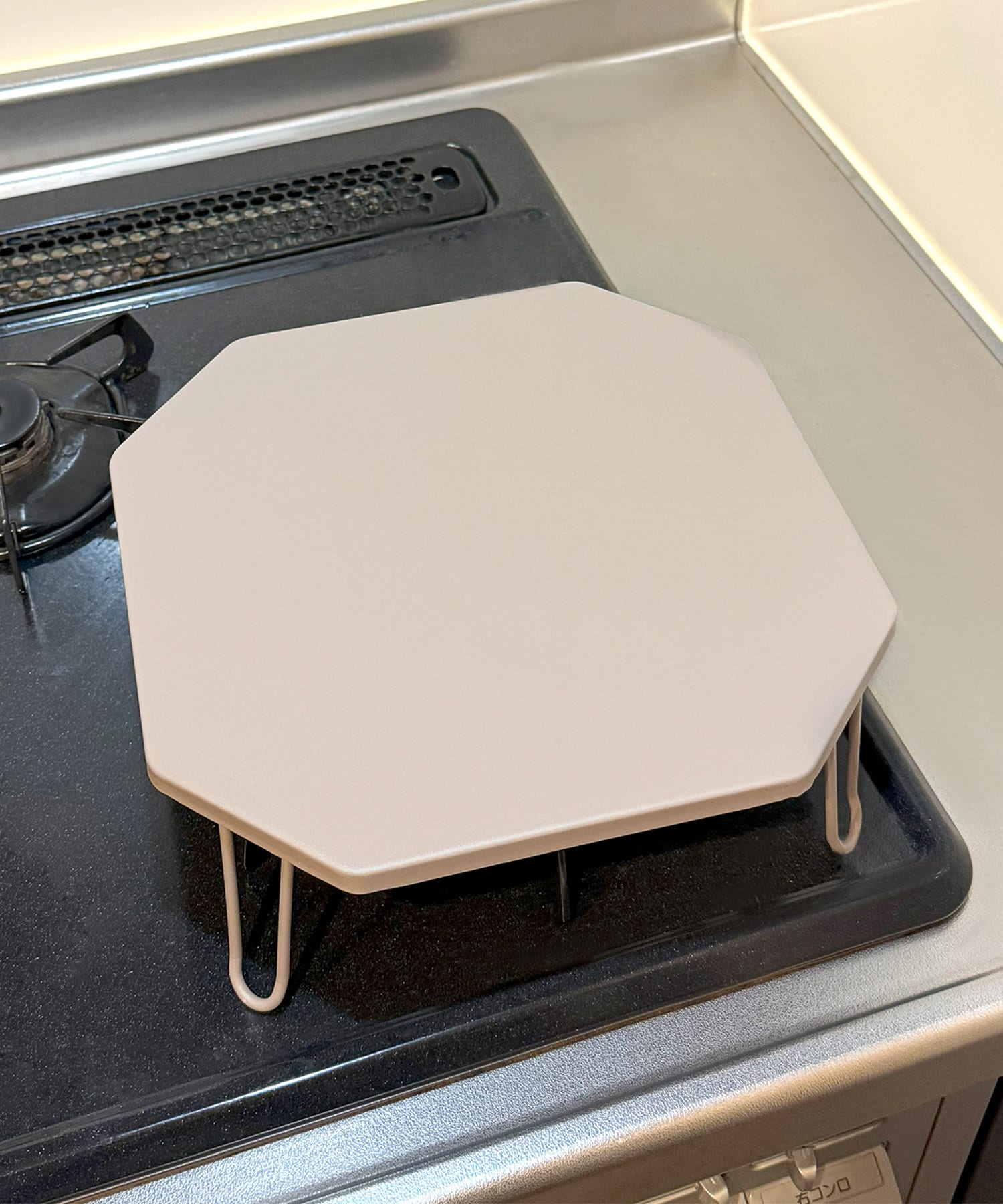 購入場所:店舗アパートのせまい台所を有効活用したく、一口コンロの上にフタのようなものができたらとネットで色々探していましたが、高いなぁと思っていたらスリコで発見!足がたためるしとても便利に使っています!
