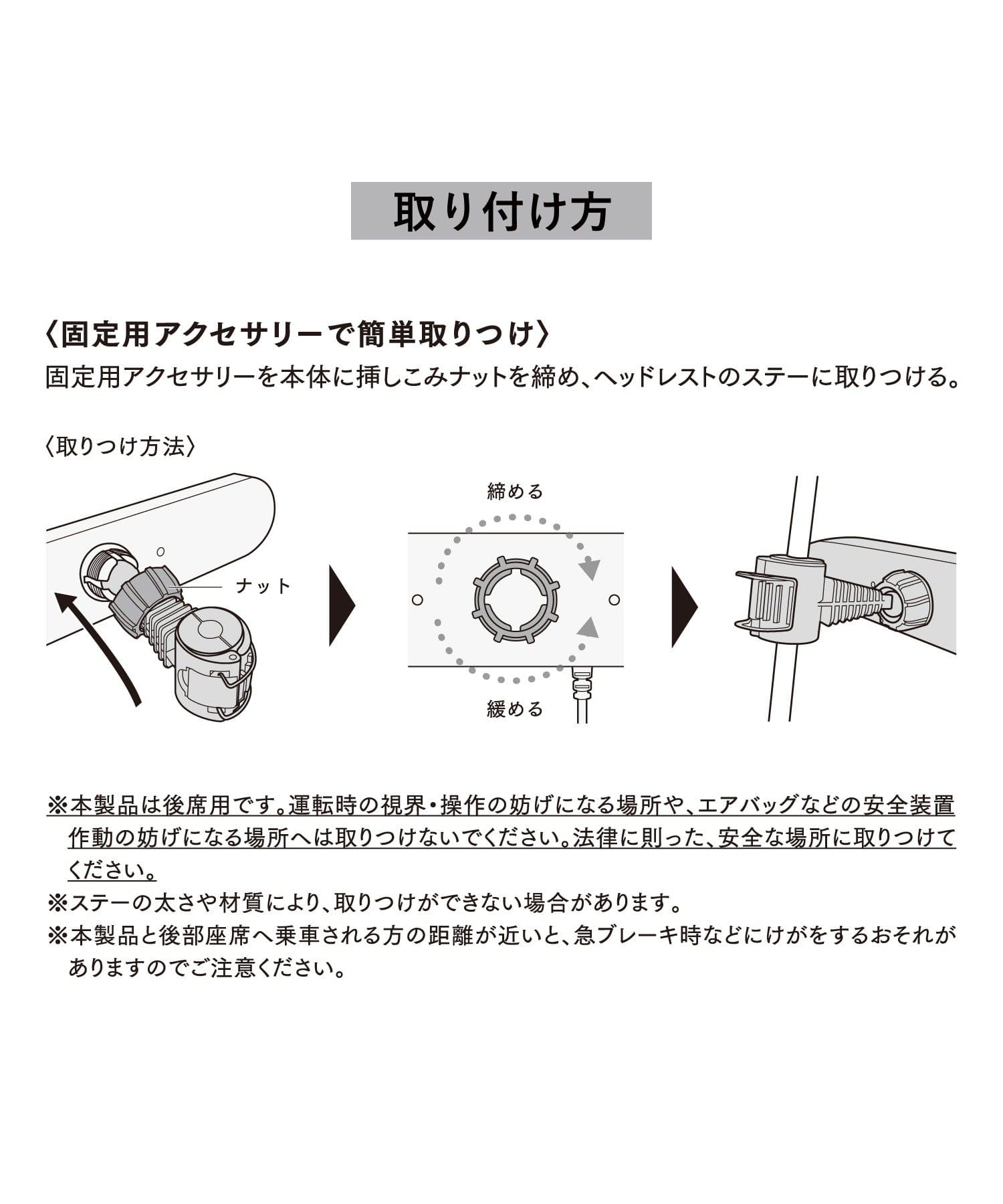 ●ヘッドレストに取りつける固定用アクセサリー付きで簡単に取り付けができます。