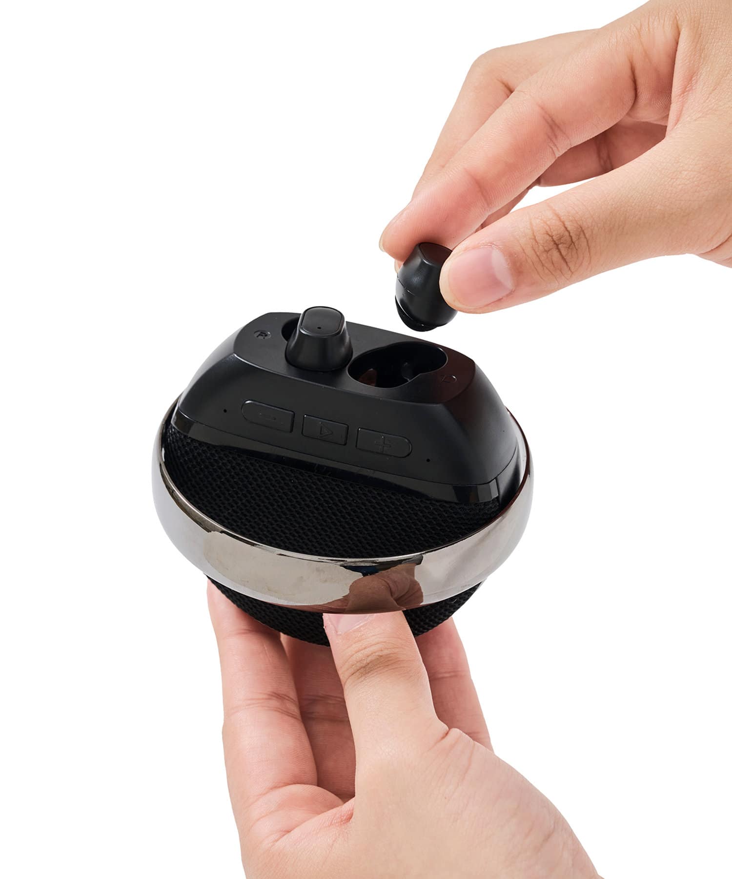 ●ワイヤレスイヤホンとスピーカーが搭載された2IN1のデバイスです。