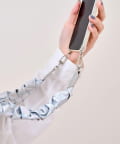 ●光沢感のあるメタリック素材とくしゅっとしたフリルが目を惹くスマホショルダー。
