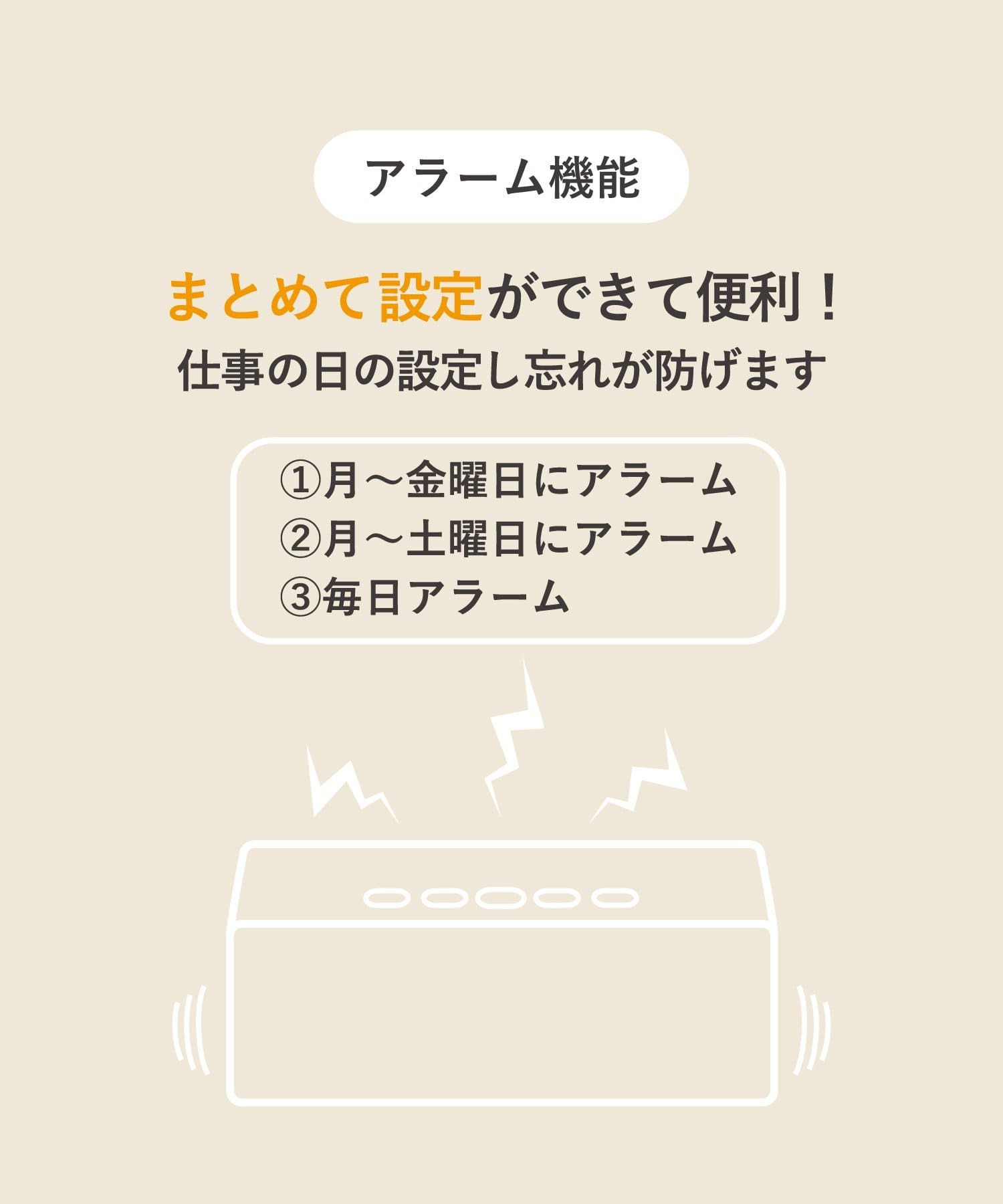<アラーム>月~金曜日にアラーム、月~土曜日にアラーム、毎日アラームで設定できます。スヌーズ機能付き。