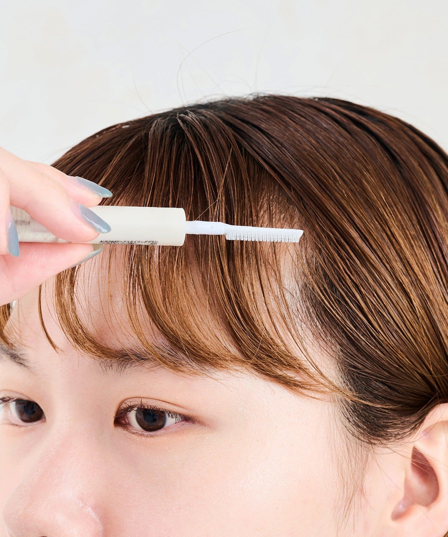 ・頭頂部の飛び出た髪の毛のハネや後れ毛など、気になる部分にブラシやコームでなでるように適量塗布します。